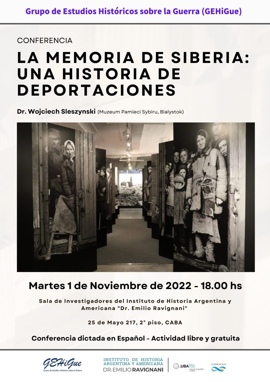 W Instituto de Historia Argentina y Americana Dr. Emilio Ravignani, który jest częścią Uniwersytetu w Buenos Aires, odbędzie się konferencja naukowa pod tytułem „La memoria de Siberia: Una historia de deportaciones”, poświęcona historii zsyłek Polaków na Syberię w czasach Związku Radzieckiego. Wydarzenie jest związane z wizytą w Argentynie prof. Wojciecha Śleszyńskiego, dyrektora Muzeum Pamięci Sybiru w Białymstoku.