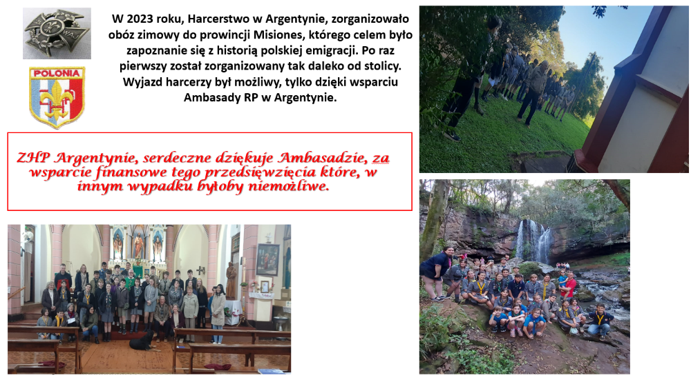 Harcerze i zuchy z ZHP Okręg Argentyna wyjechali na obóz harcerski „Zimowanie na czerwonej ziemi”, który wiódł szlakiem największych skupisk polonijnych na północy Argentyny. Mieli okazję poznać historię najstarszej polskiej emigracji, sylwetki wybitnych Polaków na wychodźstwie, brać udział w zajęciach nauki języka polskiego. Odwiedzili między innymi „polskie” miejscowości w prowincji Misiones takie jak Azara, Apostoles czy Wanda. W Obera spotkali się z delegacją Uniwersytetu Adama Mickiewicza z Poznania.