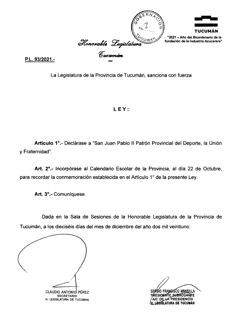 Parlament Prowincji Tucumán ustanowił 22 października “Dniem Papieża Jana Pawła II jako patrona sportu, jedności i braterstwa w Tucumán”!