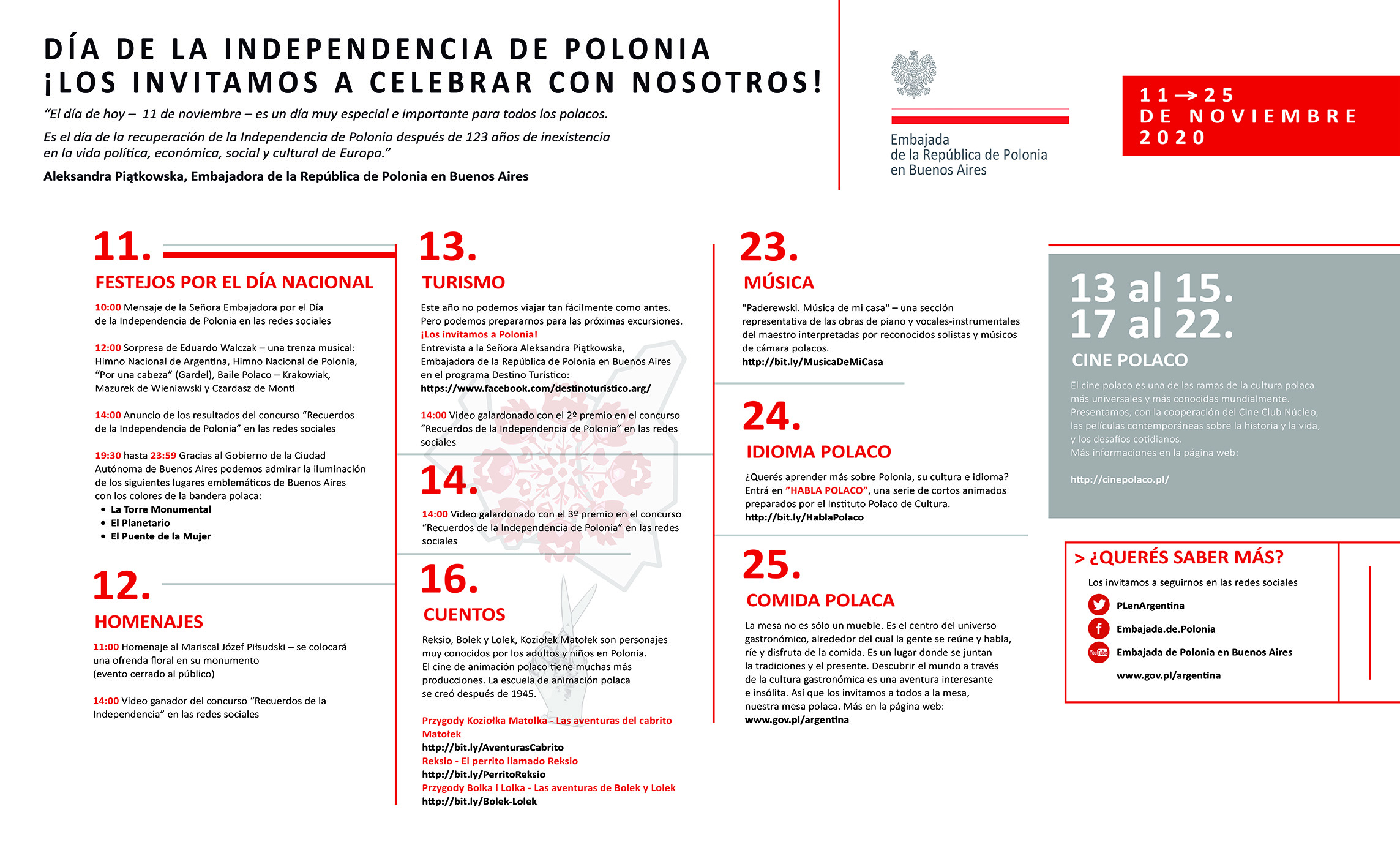 Z okazji rocznicy odzyskania przez Polskę niepodległości zaplanowany zostal cykl wydarzeń, których celem będzie promocja naszego kraju w Argentynie, jego historii, dziedzictwa i współczesności. Obchody rozpoczną sie 11 listopada od wystąpienia Aleksandry Piątkowskiej, Ambasadora RP w Argentynie, Urugwaju i Paragwaju i małej niespodzianki. Eduardo Walczak, słynny argentyński skrzypek polskiego pochodzenia zagra hymn Polski, krakowiaka, mazurka, czardasza i słynny utwór śpiewaka tanga Carlosa Gardela "Por una cabeza". Rozstrzygnięty zostanie również konkurs, w którym nagrodzone zostaną najlepsze filmy internautów o pamiątkach z czasów, kiedy Polska odzyskała niepodległość. Wieczorem będzie można podziwiać biało-czerwoną iluminację w najbardziej emblematycznych miejscach Buenos Aires - La Torre Monumental, El Planetario i El Puente de la Mujer. Dzień później pod pomnikiem marszałka Józefa Piłsudskiego w Buenos Airtes zostaną złożone wieńce. W uroczystości oprócz polskich dyplomatów wezmą udział przedstawiciele organizacji polonijnych i polskich harcerzy w Argentynie.