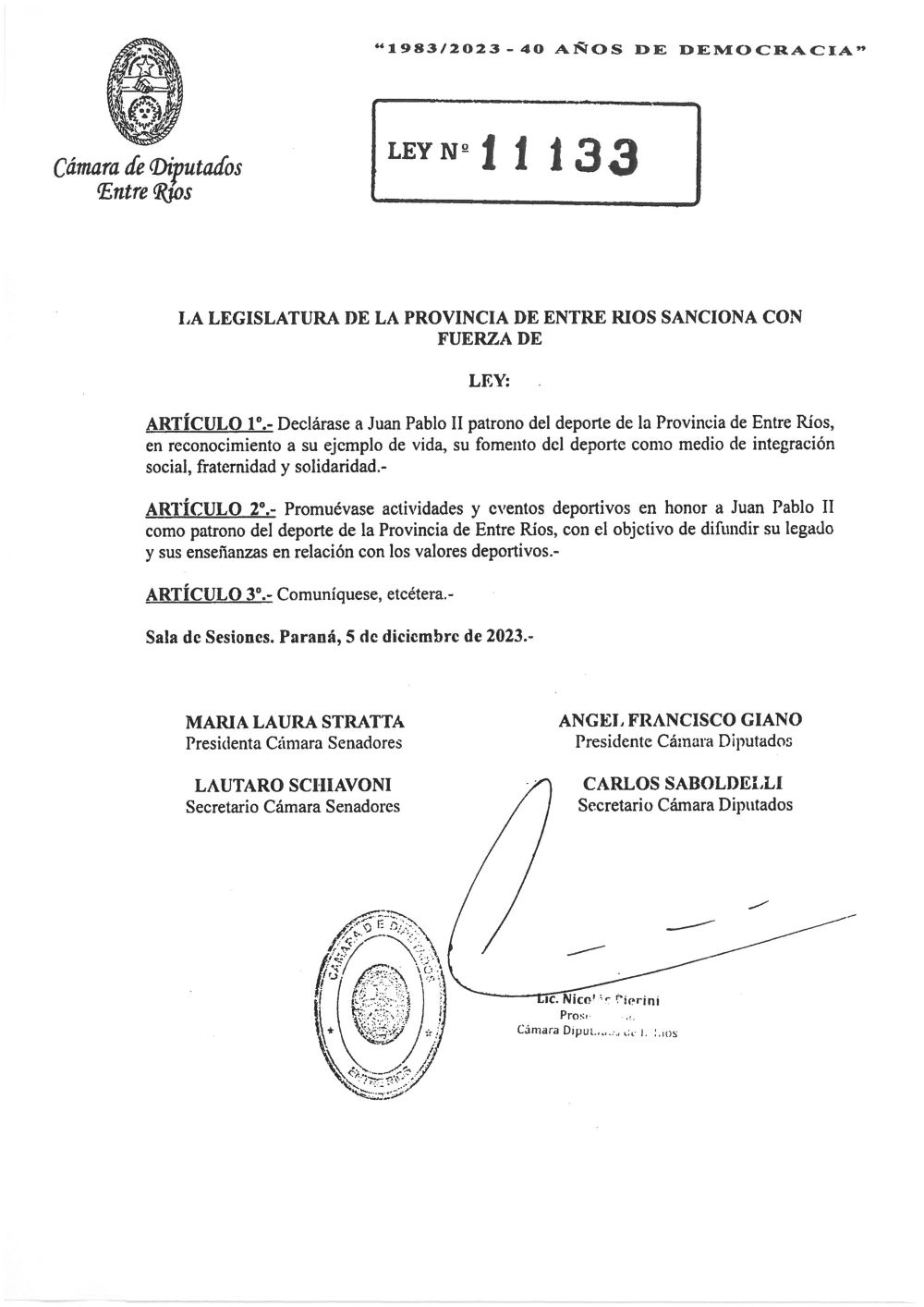 Ustawodawca prowincji Entre Ríos ogłosił na mocy ustawy nr 11133 papieża Jana Pawła II patronem sportu, w uznaniu jego przykładu życia i promocji sportu jako środka integracji społecznej, braterstwa i solidarności.