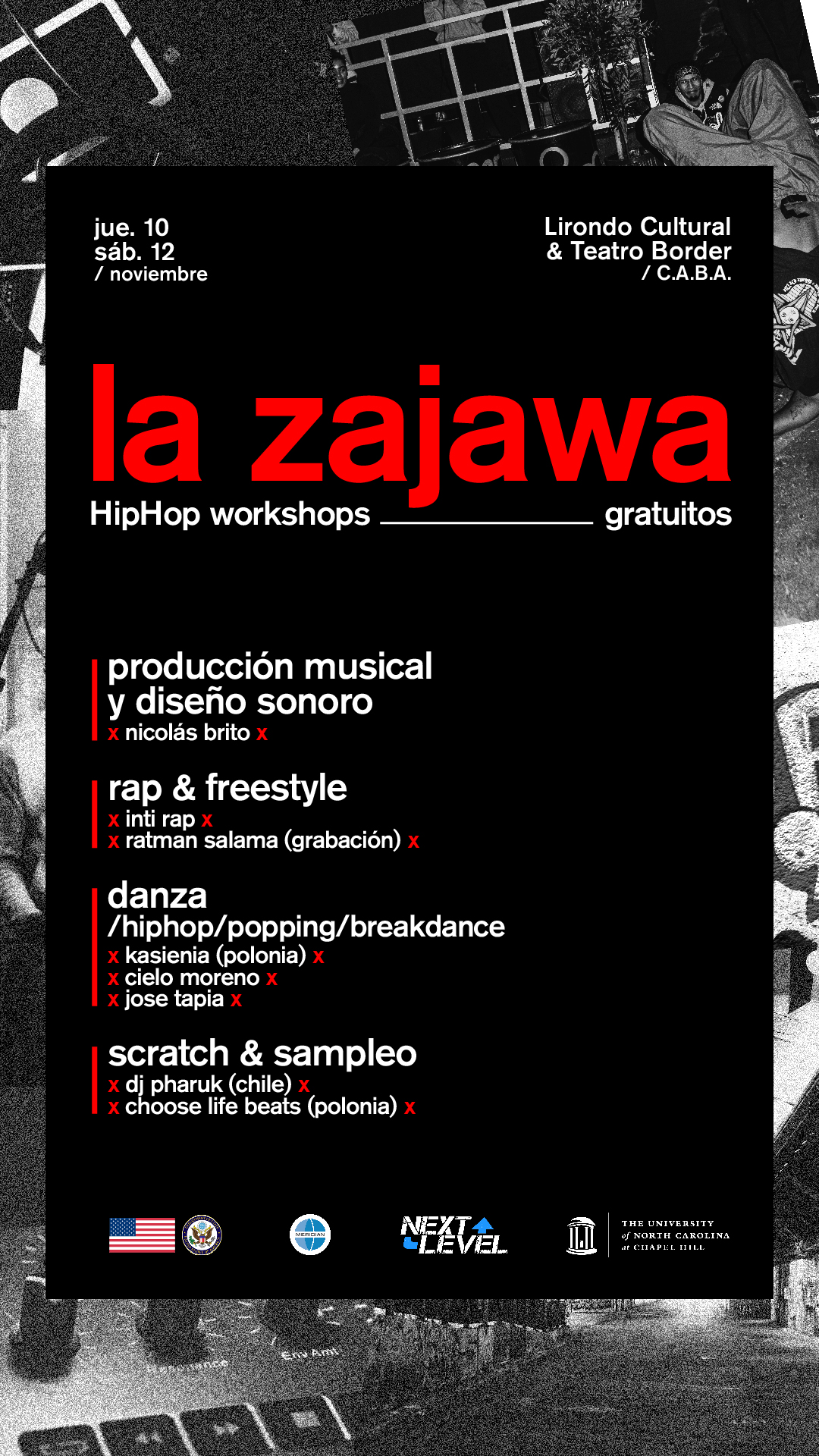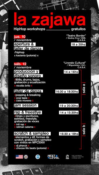 Do Buenos Aires przyjeżdża Kasienia Kowalewska, znana jako FlavourKa, tancerz, nauczyciel tańca, DJ i nauczyciel freestyle oraz Michał Jankielewicz a.k.a. Choose Life Beats, producent muzyczny i DJ. Oboje wezmą udział w warsztatach hip-hopowych w Buenos Aires, które odbędą się w Teatro Border i centrum kultury Lirondo Cultural (10-12 listopada br.). La Zajawę zakończy jam session uczniów, artystów i wszystkich uczestników wydarzenia.