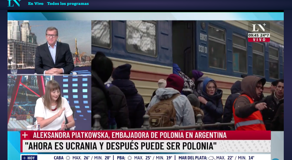 „Wszystkie osoby uciekające z Ukrainy z powodu rosyjskiej agresji są wpuszczane do Polski. Udzielamy schronienia każdej osobie, której życie jest zagrożone, bez względu na jej narodowość. Przyjęliśmy już ponad 1 milion osób. Tak Polacy rozumieją słowo solidarność” – podkreślała Aleksandra Piątkowska w rozmowach z dziennikarzami argentyńskimi. Wywiady z polskim ambasadorem ukazały się w argentyńskiej telewizji i stacjach radiowych.