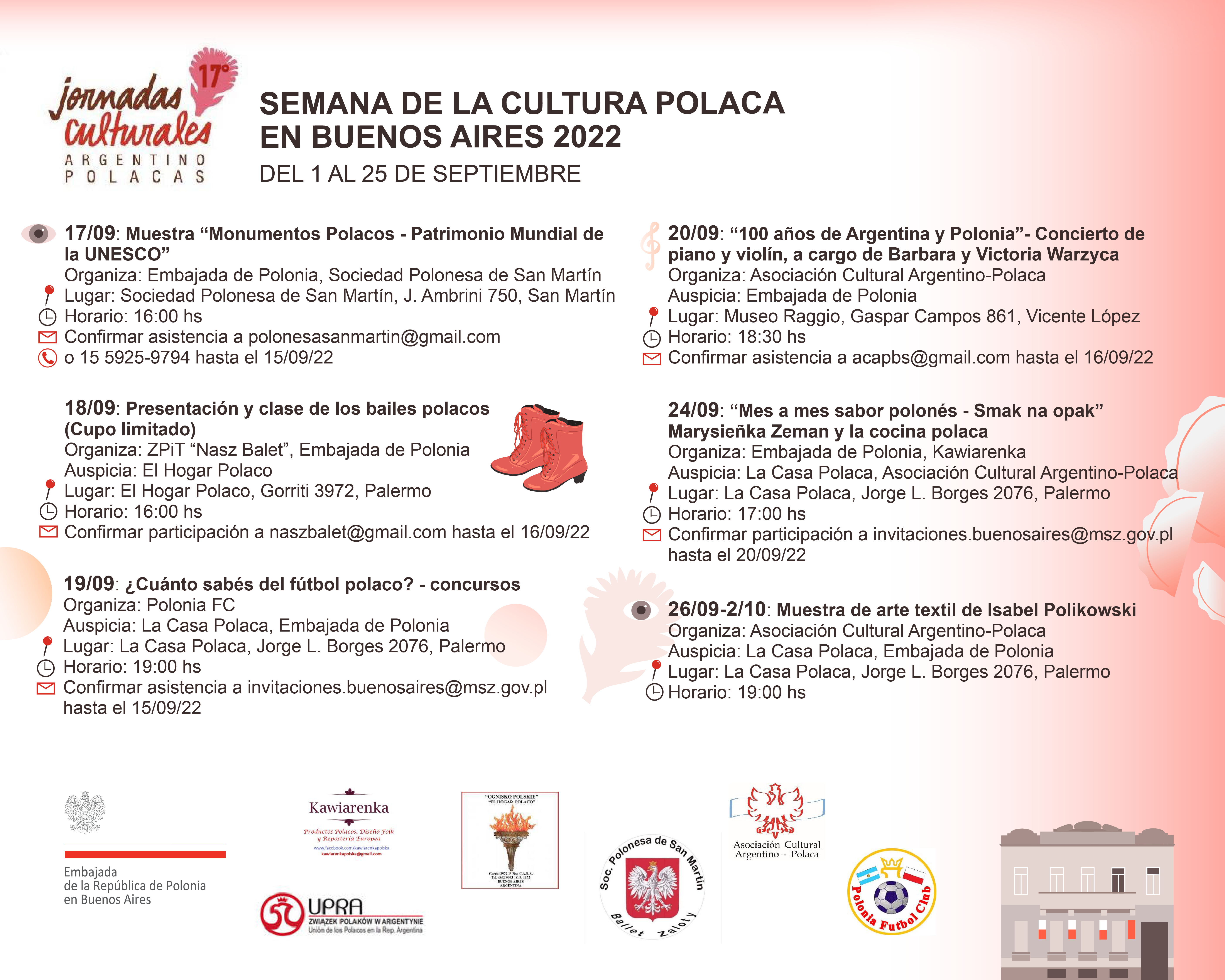 W tym roku w związku z obchodami stulecia nawiązania stosunków dyplomatycznych Ambasada RP w Buenos Aires wraz z organizacjami polonijnymi i indywidualnymi osobami przygotowała program wydarzeń kulturalnych, w których będzie można uczestniczyć przez cały wrzesień. Ulotki z programem poniżej.