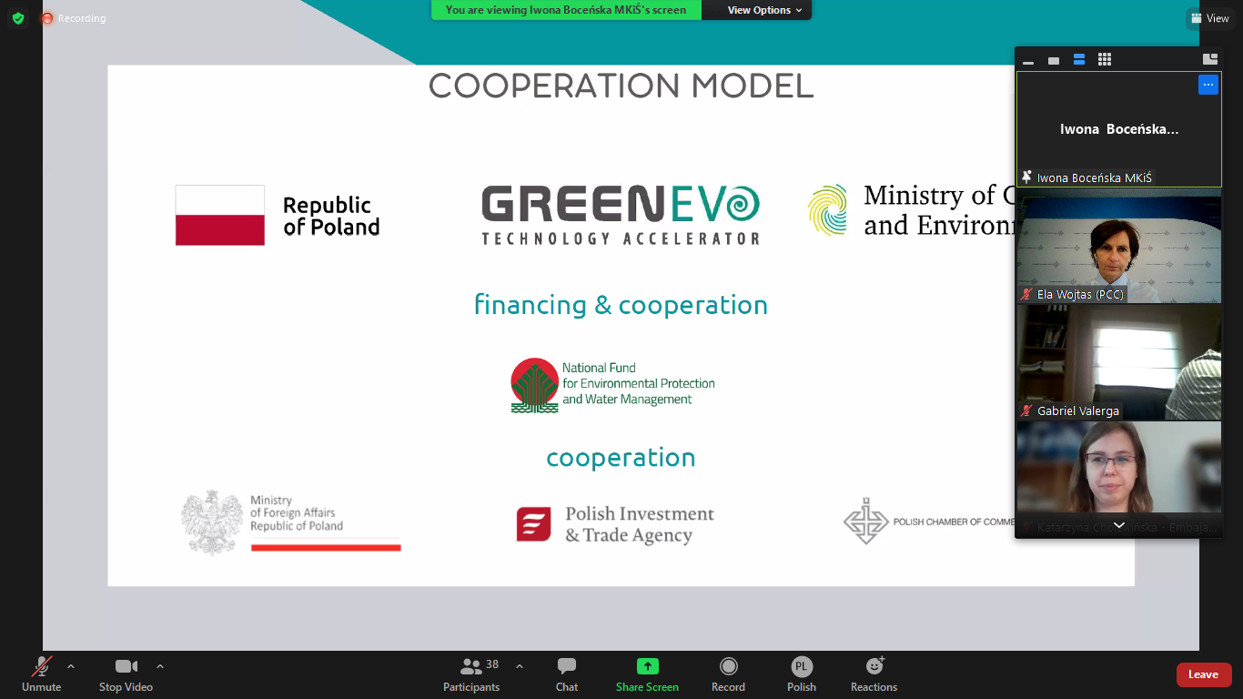 W czasie webinarium przedstawiliśmy słuchaczom założenia programu "GreenEvo - Akcelerator Zielonych Technologii", stworzonego w 2009 r. przez Ministerstwo Klimatu i Środowiska RP. Program ten pozwolił na stworzenie w Polsce przyjaznych warunków dla upowszechniania proekologicznych technologii. Jest to rodzaj rządowego konkursu dla polskich firm oferujących nowatorskie rozwiązania z zakresu "zielonych technologii". Laureaci programu otrzymują wsparcie Ministerstwa Klimatu i Środowiska w promocji swoich wynalazków nie tylko w kraju, ale też za granicą. Od 2009 r. w konkursie wyróżniono 118 polskich firm.