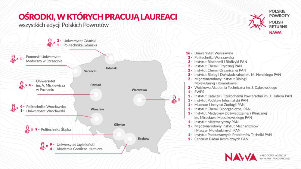 Osobą do kontaktu w sprawach programu Polskie Powroty NAWA jest Pani Katarzyna Pietruszyńska, e-mail: katarzyna.pietruszynska@nawa.gov.pl; tel. + 48 22 390-35-56