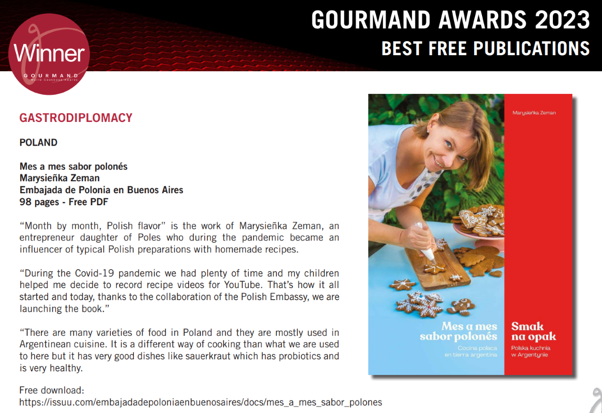 Książka kucharska Marysieńki Zeman „Mes a mes sabor polonés”, opublikowana dzięki Ambasadzie RP w Buenos Aires, znalazła się na liście najlepszych darmowych wydawnictw online, poświęconych kuchni, tradycjom kulinarnym i promocji dobrego jedzenia, wydanych w 2022 roku. W kategorii Gastrodiplomacy znalazła się obok 6 innych projektów, wyróżnionych przez organizatorów Gourmand Awards 2023. Lista zostanie uroczyście zaprezentowana podczas gali, która odbędzie się w maju br. w Szwecji.