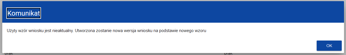 W związku z powyższym, jeśli Wnioskodawca utworzył wniosek o dofinansowanie przed usunięciem błędu systemu, powinien przejść do edycji wniosku a następnie wybrać edycję sekcji. Na ekranie pojawi się komunikat o treści: „Użyty wzór wniosku jest nieaktualny. Utworzona zostanie nowa wersja wniosku na podstawie nowego wzoru”, który należy zatwierdzić (nacisnąć OK).