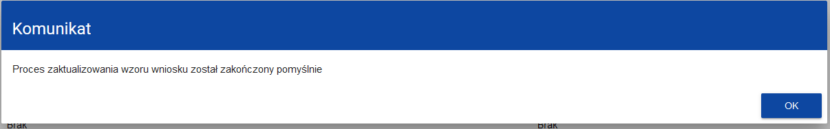 Następnie pojawi się drugi komunikat: „Proces zaktualizowania wzoru wniosku został zakończony pomyślnie”, który również należy zatwierdzić (nacisnąć OK).
