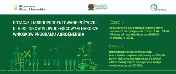 1 października 2021 r. ruszy nabór w 1-szej, wdrażanej przez Wojewódzkie Fundusze Ochrony Środowiska i Gospodarki Wodnej ze środków udostępnionych przez NFOŚiGW, części programu Agroenergia. Będzie ona dotyczyć dofinansowania mikroinstalacji fotowoltaicznych i wiatrowych oraz pomp ciepła o mocy powyżej 10 kW, ale nie większej niż 50 kW, w tym także instalacji hybrydowych oraz magazynów energii elektrycznej jako instalacji towarzyszącej zwiększającej autokonsumpcję energii w miejscu jej wytworzenia. Nabór w niej potrwa do wyczerpania środków.