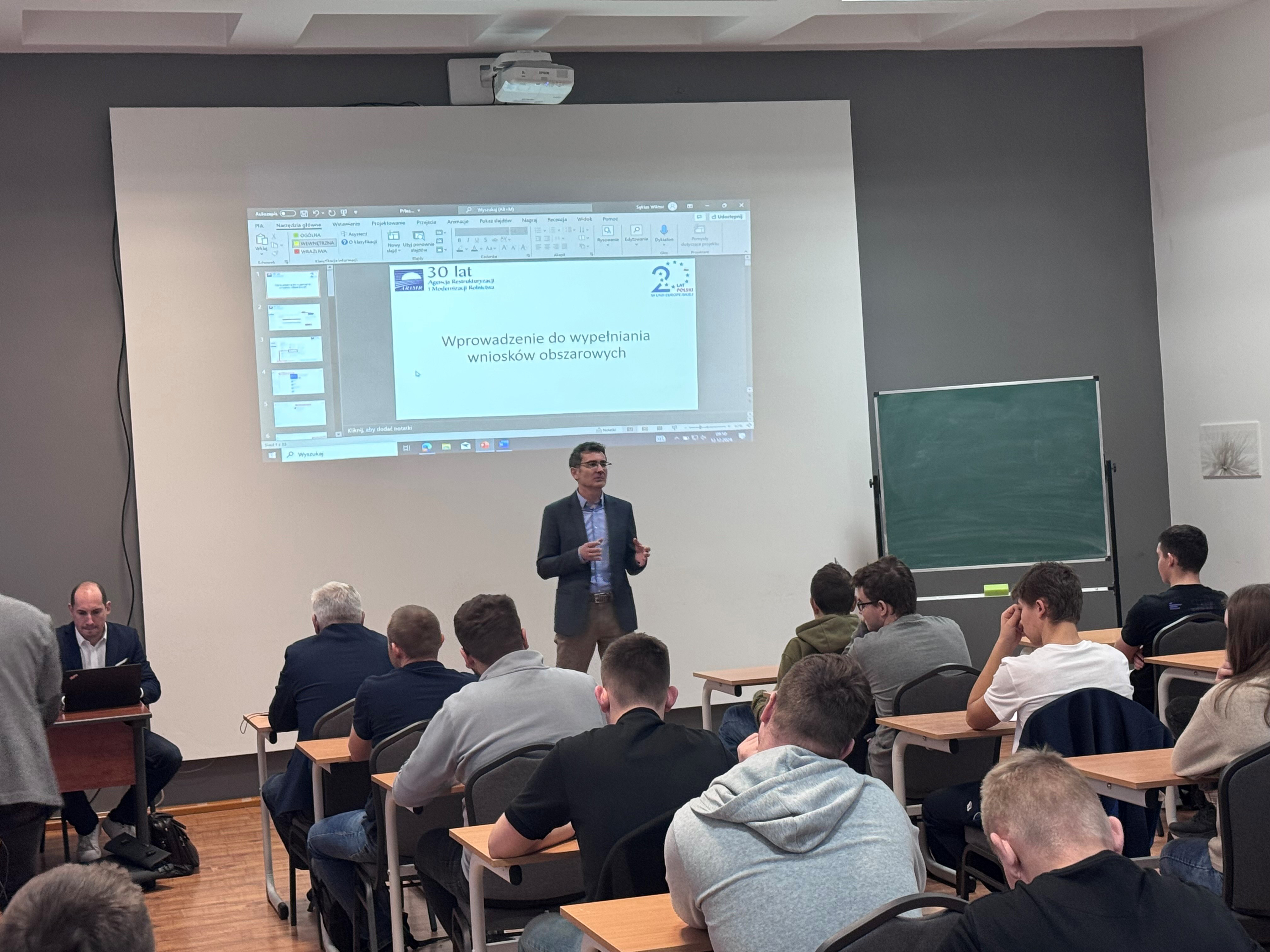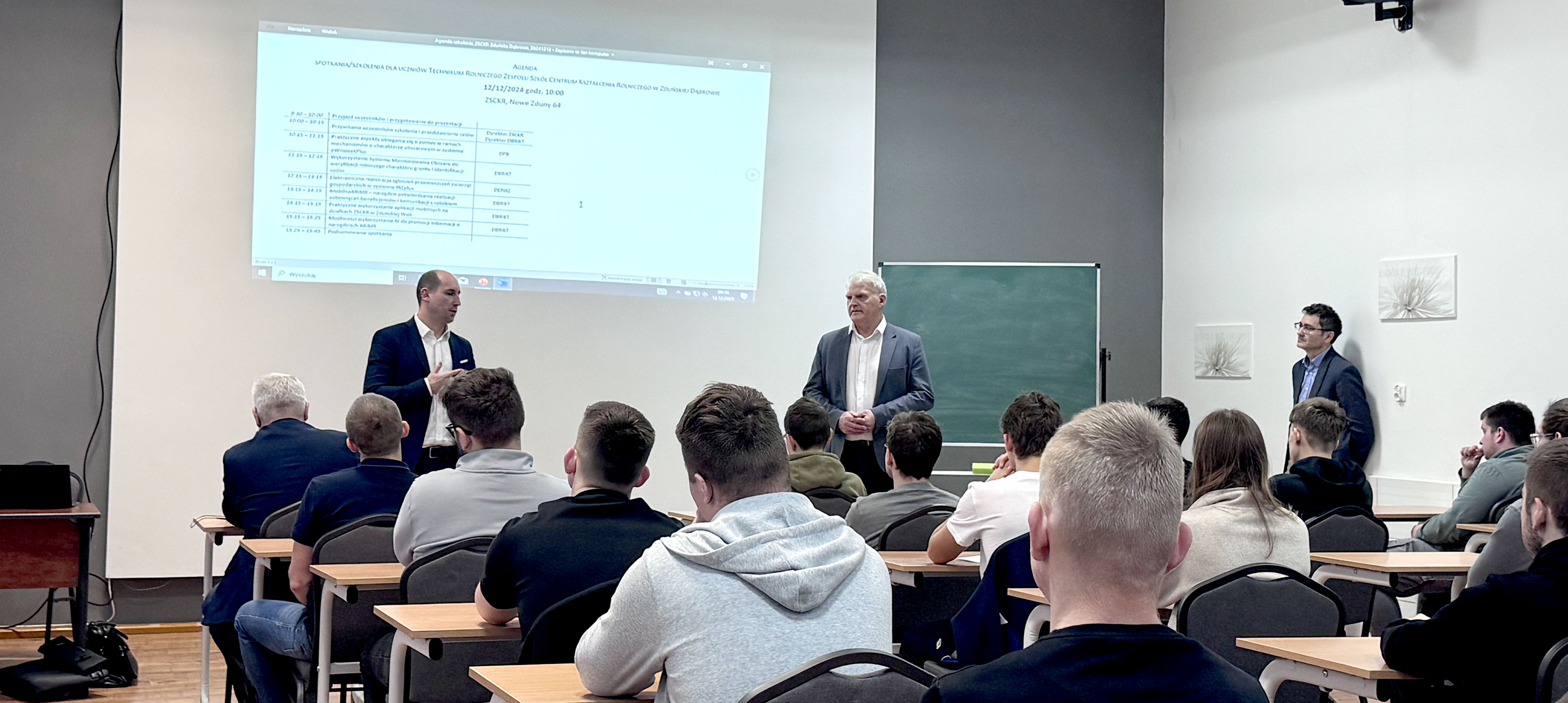 Przedstawiciele ARiMR – Stanisław Sas, Janusz Szulc, Józef Borkowski, Paweł Kożuchowski, Jacek Krysicki, Renata Majowicz, Grzegorz Kępiński, Wiktor Sęktas i Wojciech Wybór gościli w Technikum Rolniczym przy Zespole Szkół Centrum Kształcenia Rolniczego w Zduńskiej Dąbrowie. Program przeprowadzonego przez nich szkolenia obejmował wiele tematów, m.in.: