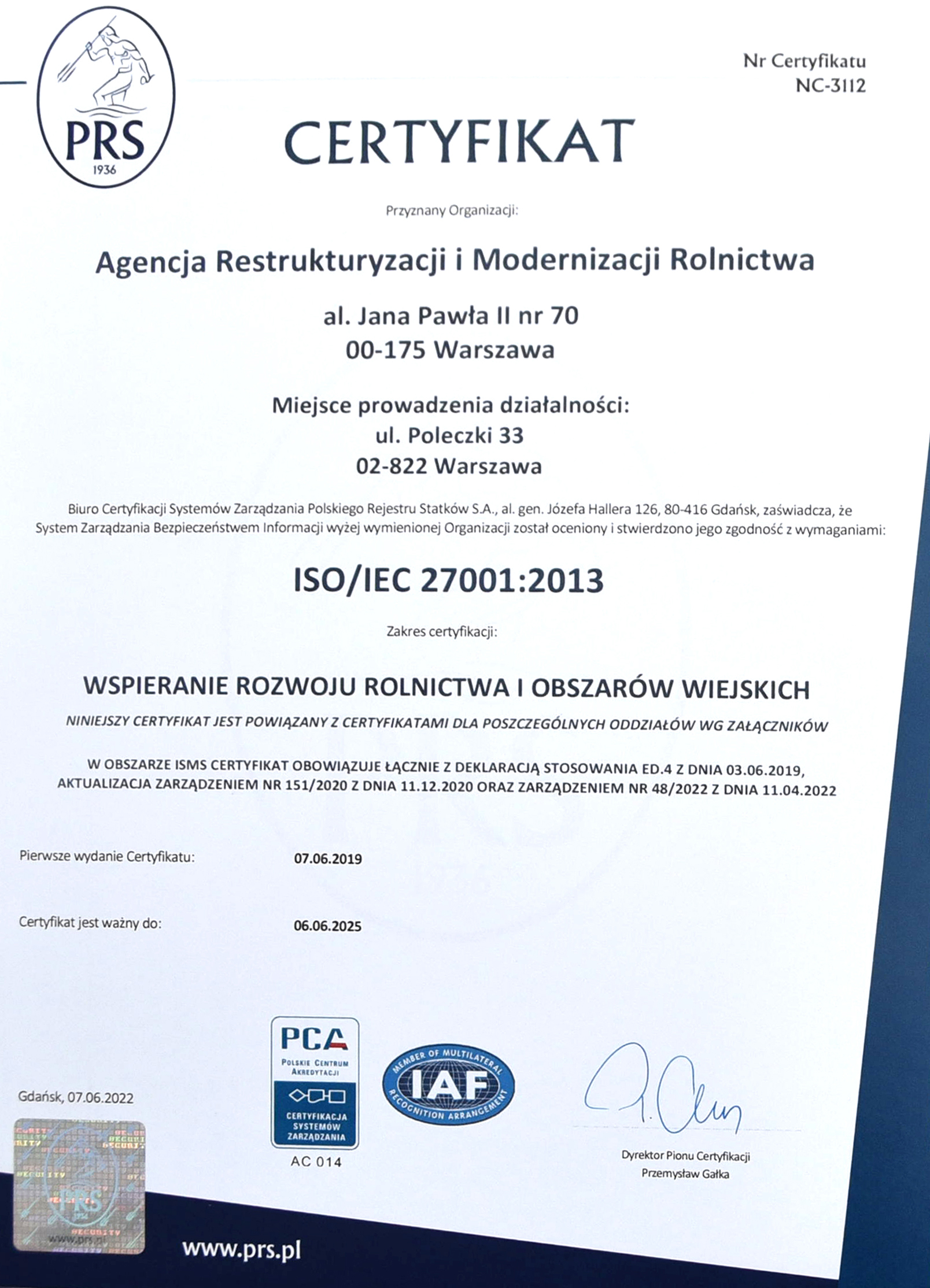 Biuro Certyfikacji Systemów Zarządzania PRS S.A. po raz kolejny przyznało Agencji Restrukturyzacji i Modernizacji Rolnictwa certyfikat w zakresie stworzenia odpowiednich warunków ochrony informacji.