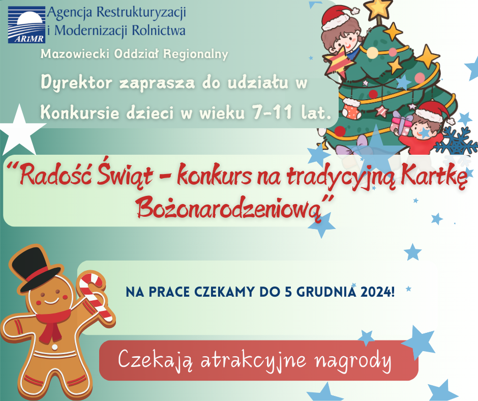 Zapraszamy do wzięcia udziału w Konkursie Plastycznym pn. ,,Radość Świąt – konkurs na tradycyjną Kartkę Bożonarodzeniową”, organizowanym przez Dyrektora Mazowieckiego Oddziału Regionalnego ARiMR.