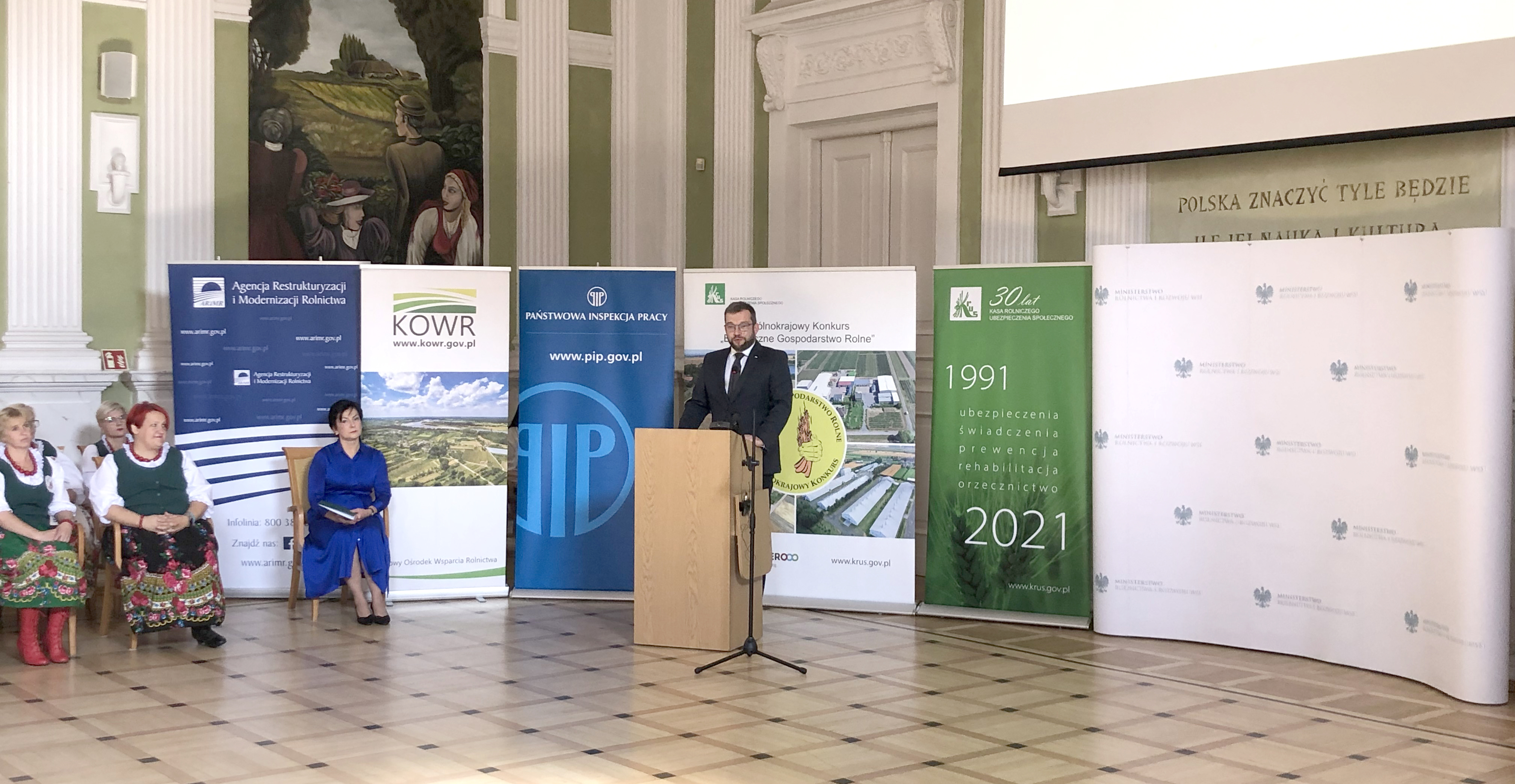 29 września 2021 r. w siedzibie Narodowego Instytutu Kultury i Dziedzictwa Wsi w Warszawie uroczyście podsumowano XVIII Ogólnokrajowy Konkurs „Bezpieczne Gospodarstwo Rolne”. Gości w imieniu organizatora powitała Prezes Kasy Rolniczego Ubezpieczenia Społecznego Aleksandra Hadzik. Głos zabrał również Minister Rolnictwa i Rozwoju Wsi Grzegorz Puda. W ramach naszego resortu cały czas prowadzimy działania, które polepszają jakość życia na wsi i poprawiają również bezpieczeństwo pracy rolników. Realizujemy także działalność profilaktyczną, bo naszym zdaniem zapobieganie jest kluczem do tego, by praca w rolnictwie przebiegała bez wypadków – powiedział.