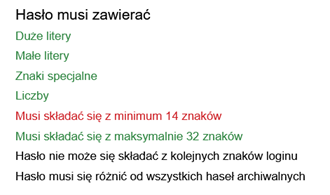 System nie wymusza jednorazowo zmiany wszystkich istniejących haseł – nowa walidacja uaktywni się przy tworzeniu nowego hasła (w dowolny sposób, także np. w wyniku skorzystania z funkcji Przypomnij hasło lub w wyniku upływu 180-dniowego okresu jego ważności).
