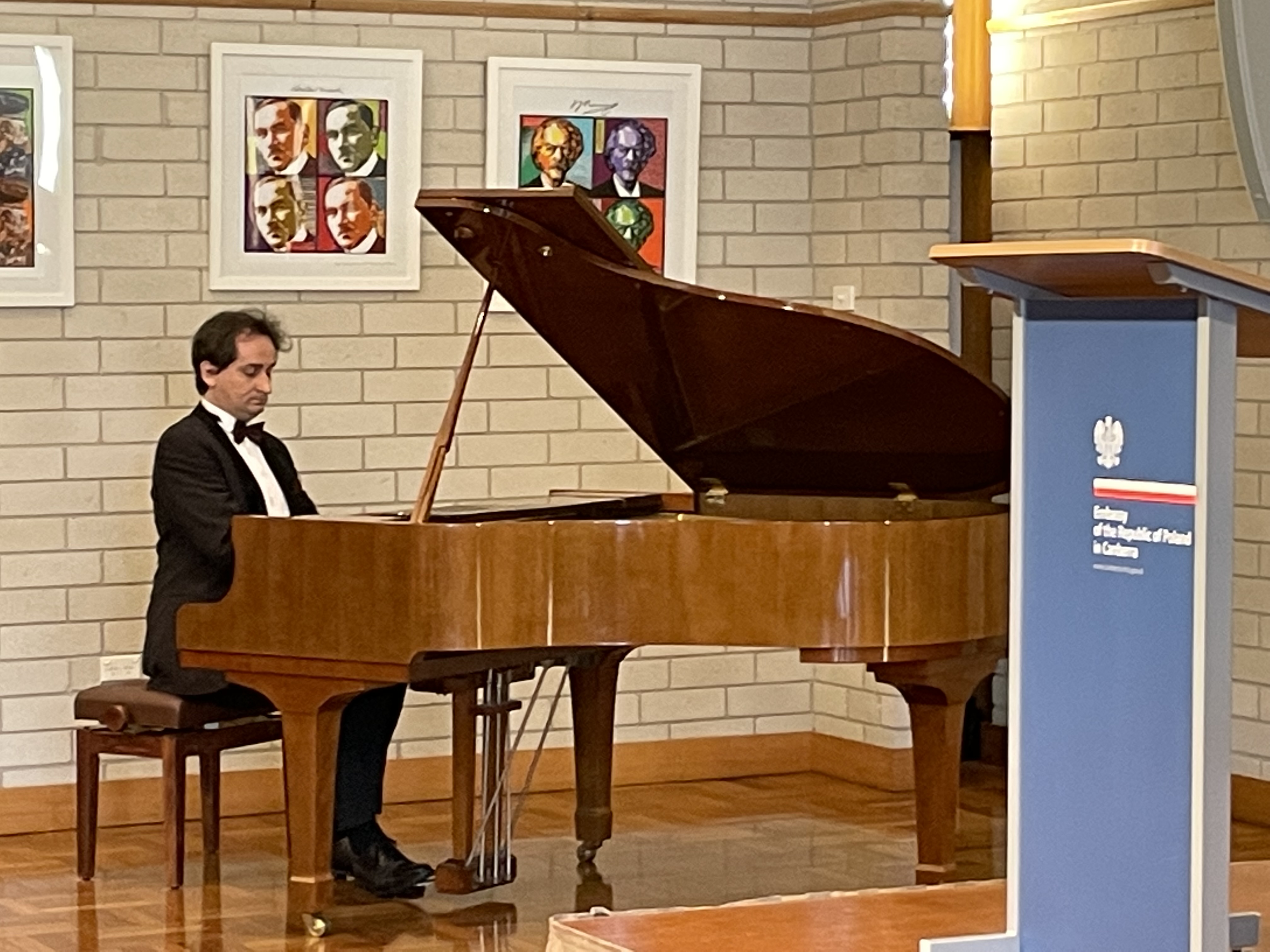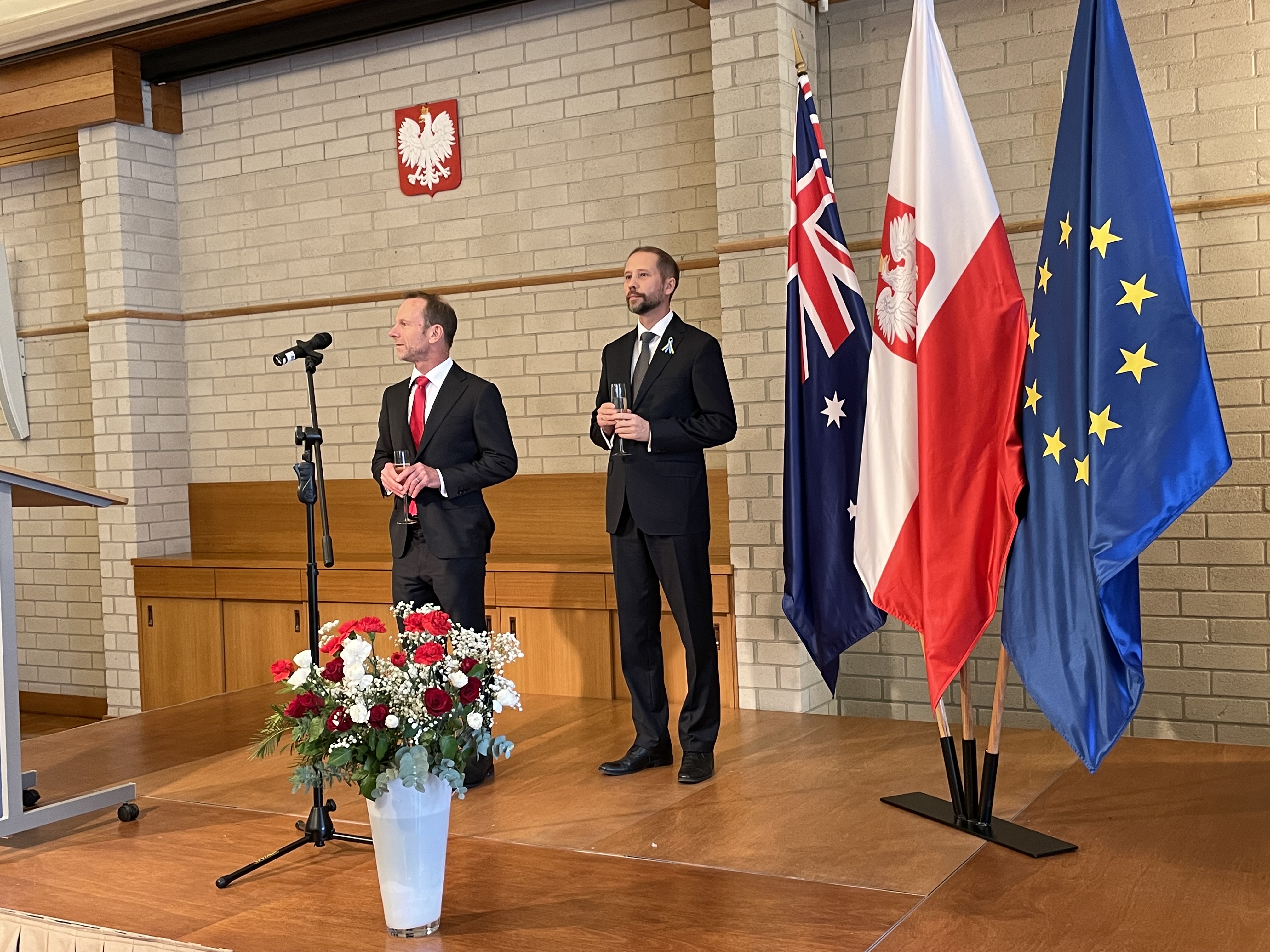 The ceremony began with the national anthems of Poland and Australia, performed by the Polish-Australian pianist Krzysztof Małek, followed by toasts to both countries and their citizens made by Ambassador Michał Kołodziejski and the Chief of Protocol. In his speech, Ambassador Kołodziejski referred to the 50th anniversary of Polish-Australian diplomatic relations established on 20 February 1972, by presenting them in the context of much longer history of bilateral contacts, which can be traced back to the beginning of the European settlement in this country in the early 19th century. Ambassador Kołodziejski raised the issue of Russia’s ongoing invasion of Ukraine, pointing out to some similarities with the situation of Poland during WWII. He reiterated Poland’s full support for the invaded neighbour that shares with us and Lithuania the legacy of the 3rd of May Constitution. Participants paid respect to the victims of war in Ukraine through a minute of silence.