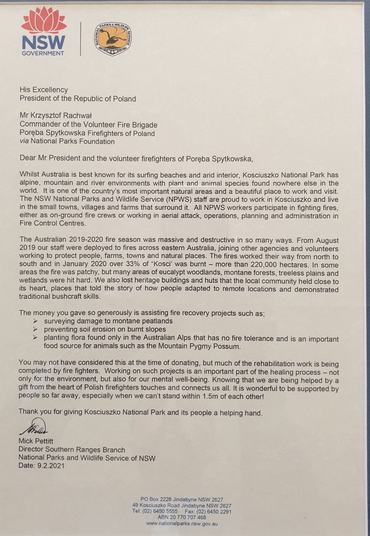 As a result of 2019-20 bushfire season – the most catastrophic ever experienced in the country’s history, 33% of the Kosciuszko National Park completely burned, threatening many unique and previously endangered species with extinction. In an expression of solidarity, on the initiative of volunteer firefighters from Poręba Spytkowska in southern Poland, 420,000 PLN were collected for the restoration of the park. The funds were symbolically handed over to the Australian Ambassador to Poland, Lloyd Brodrick at the ceremony on 13 February 2020 in the presence of the President of the Republic of Poland Andrzej Duda. Additional funds for the restoration of Kosciuszko Park were also transferred by the Polish community in Australia.