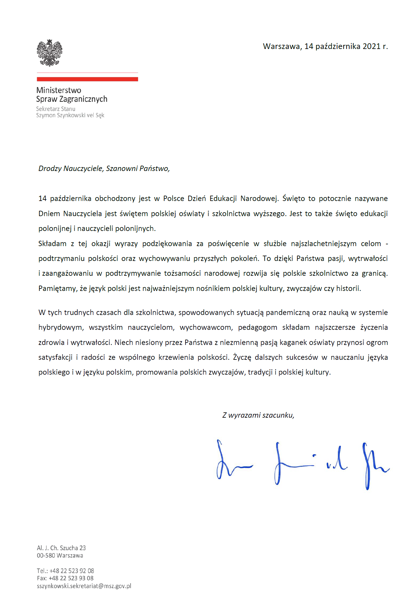 W związku z Dniem Edukacji Narodowej - 14 października - przedstawiamy list Ministra Szymona Szynkowskiego vel Sęk z życzeniami kierowanymi do nauczycieli i wychowawców prowadzących naukę języka polskiego poza granicami Polski.