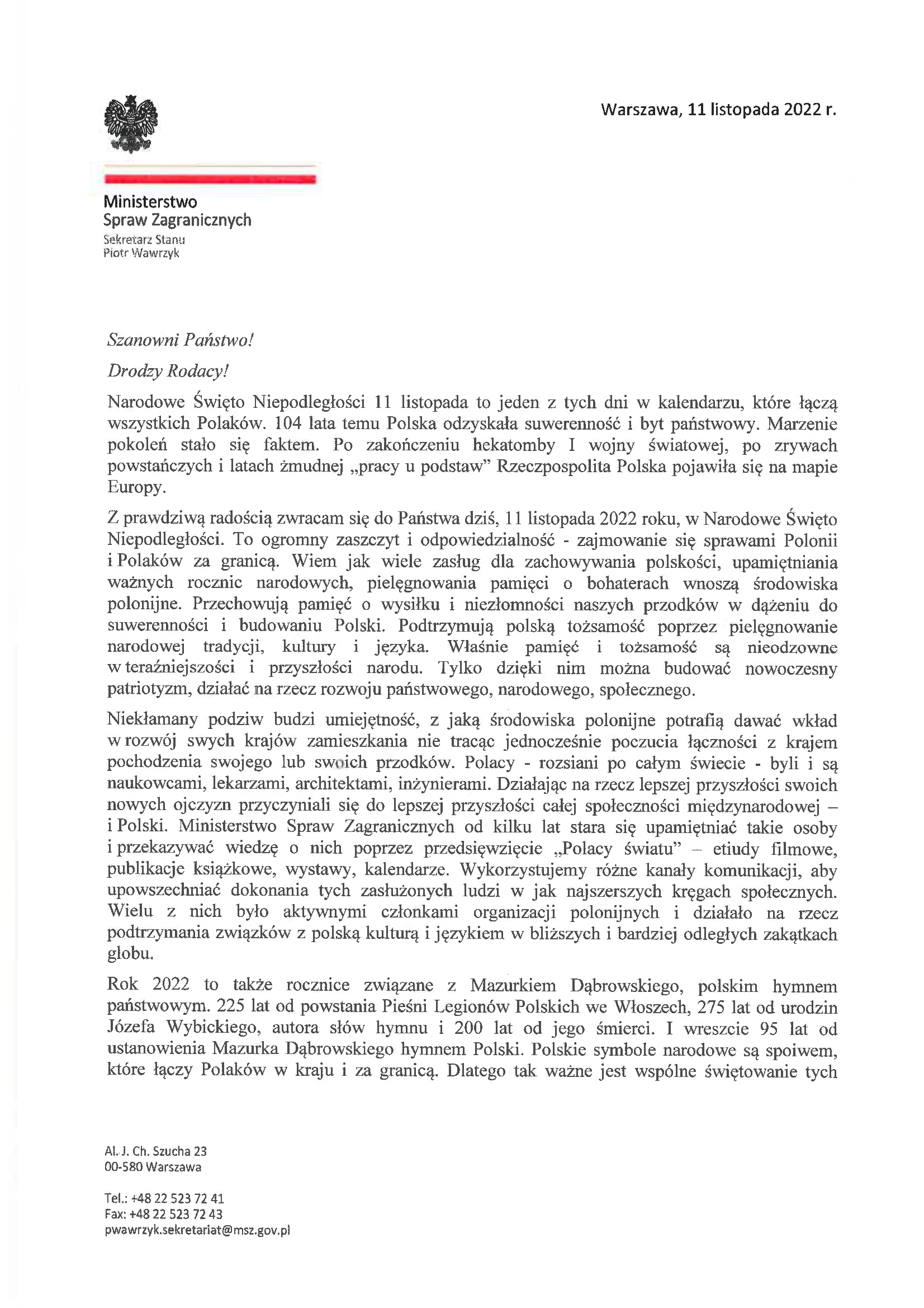 Z prawdziwą radością zwracam się do Państwa dziś, 11 listopada 2022 roku, w Narodowe Święto Niepodległości. To ogromny zaszczyt i odpowiedzialność - zajmowanie się sprawami Polonii i Polaków za granicą. Wiem jak wiele zasług dla zachowywania polskości, upamiętniania ważnych rocznic narodowych, pielęgnowania pamięci o bohaterach wnoszą środowiska polonijne. Przechowują pamięć o wysiłku i niezłomności naszych przodków w dążeniu do suwerenności i budowaniu Polski. Podtrzymują polską tożsamość poprzez pielęgnowanie narodowej tradycji, kultury i języka. Właśnie pamięć i tożsamość są nieodzowne w teraźniejszości i przyszłości narodu. Tylko dzięki nim można budować nowoczesny patriotyzm, działać na rzecz rozwoju państwowego, narodowego, społecznego.