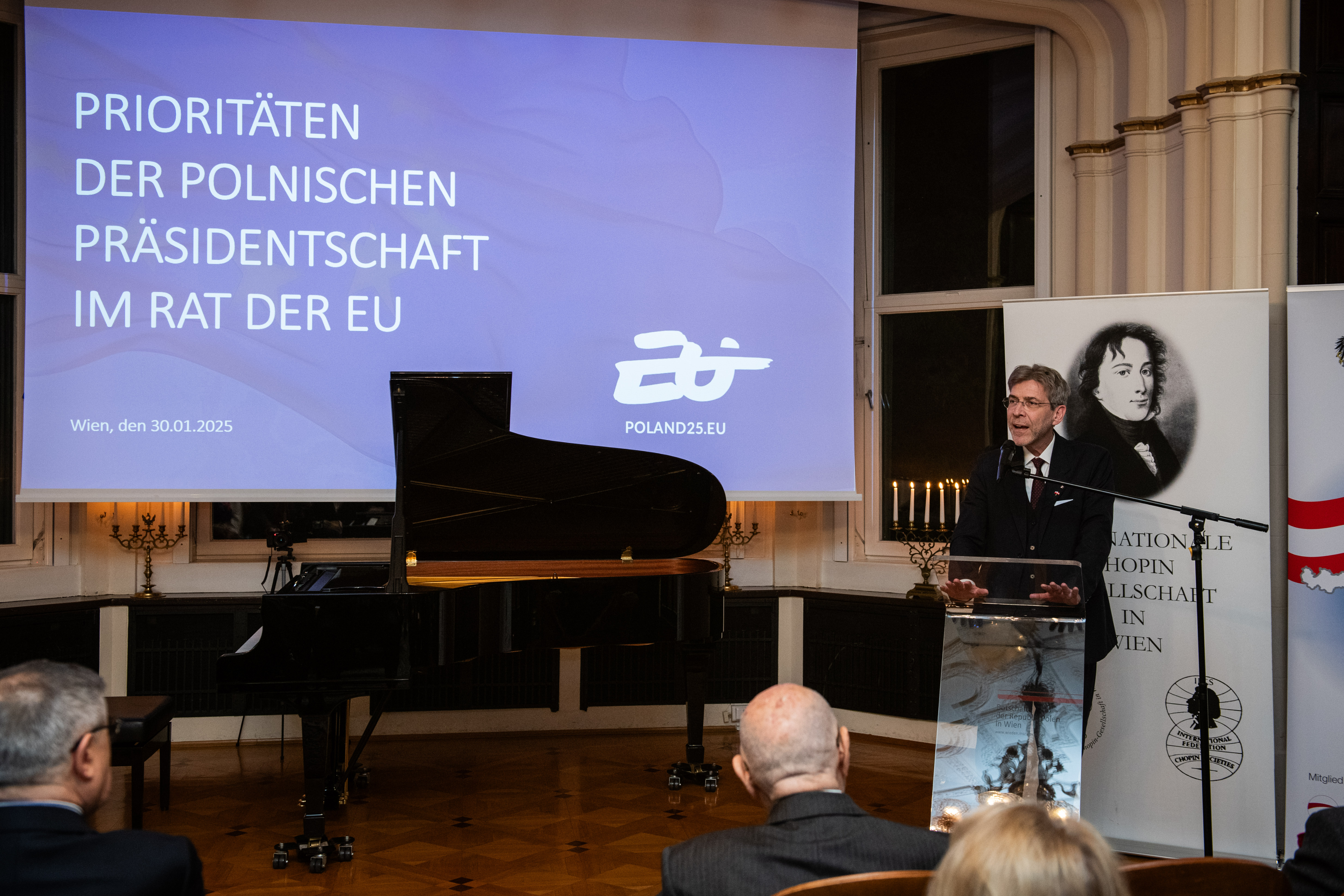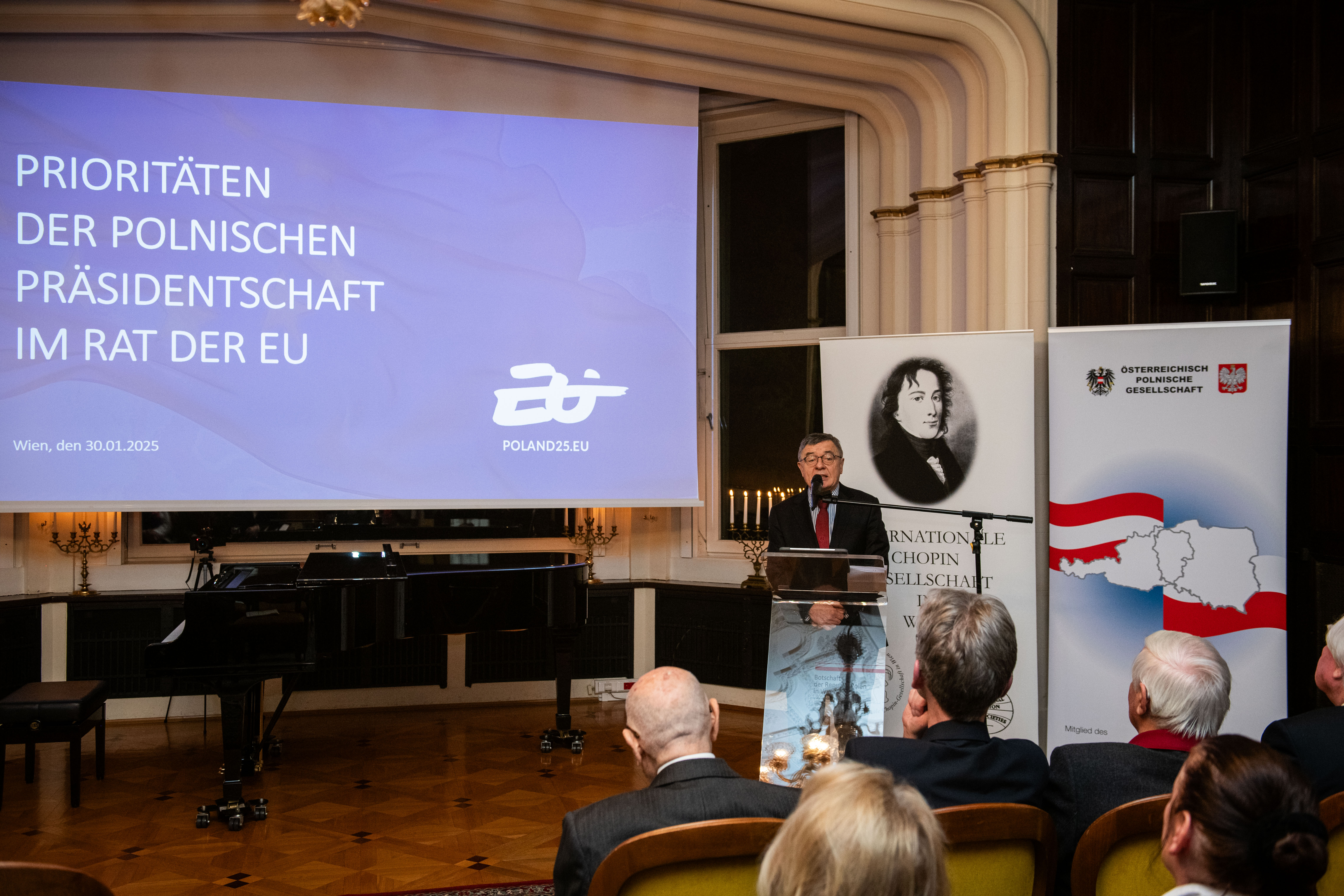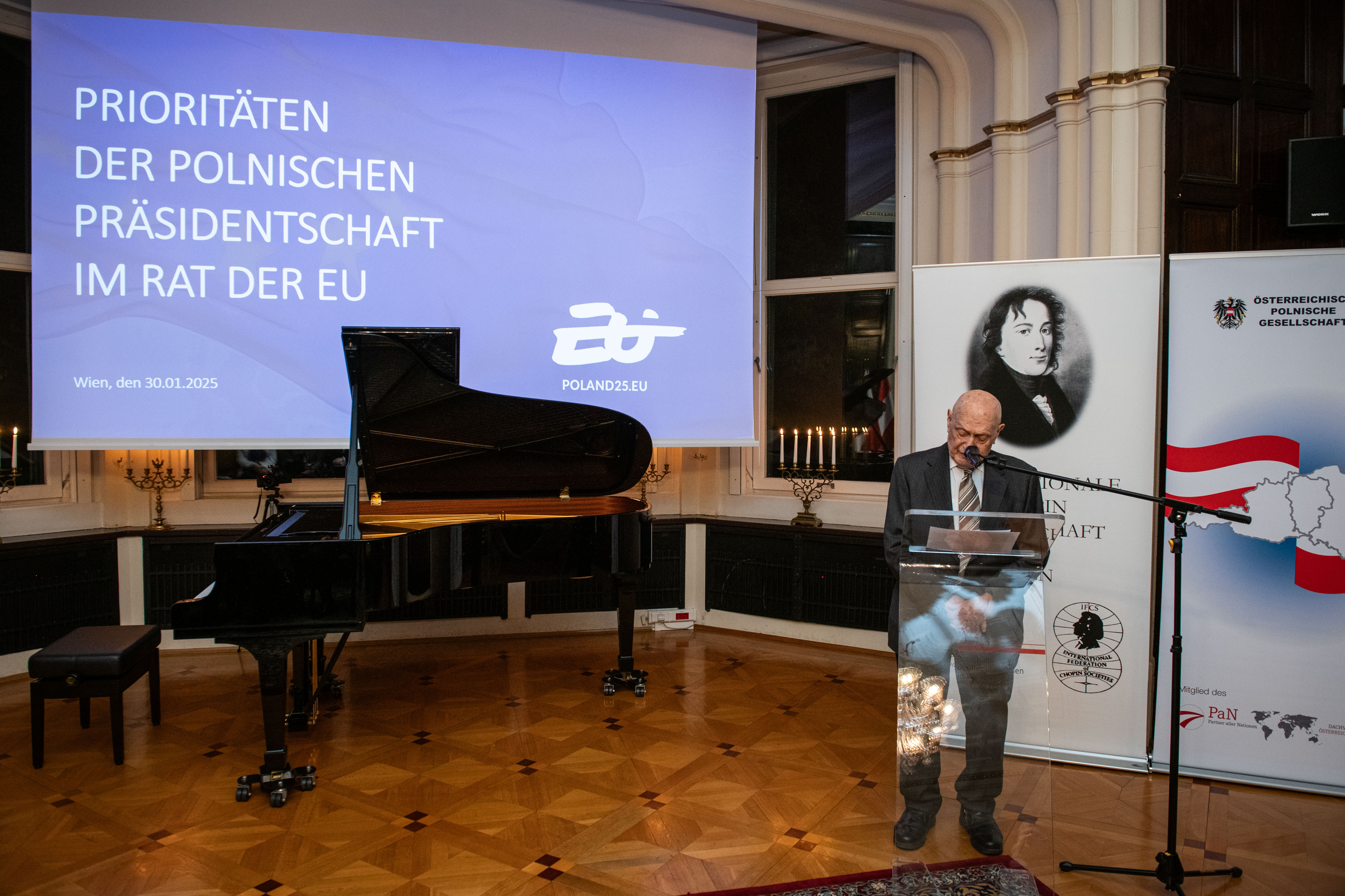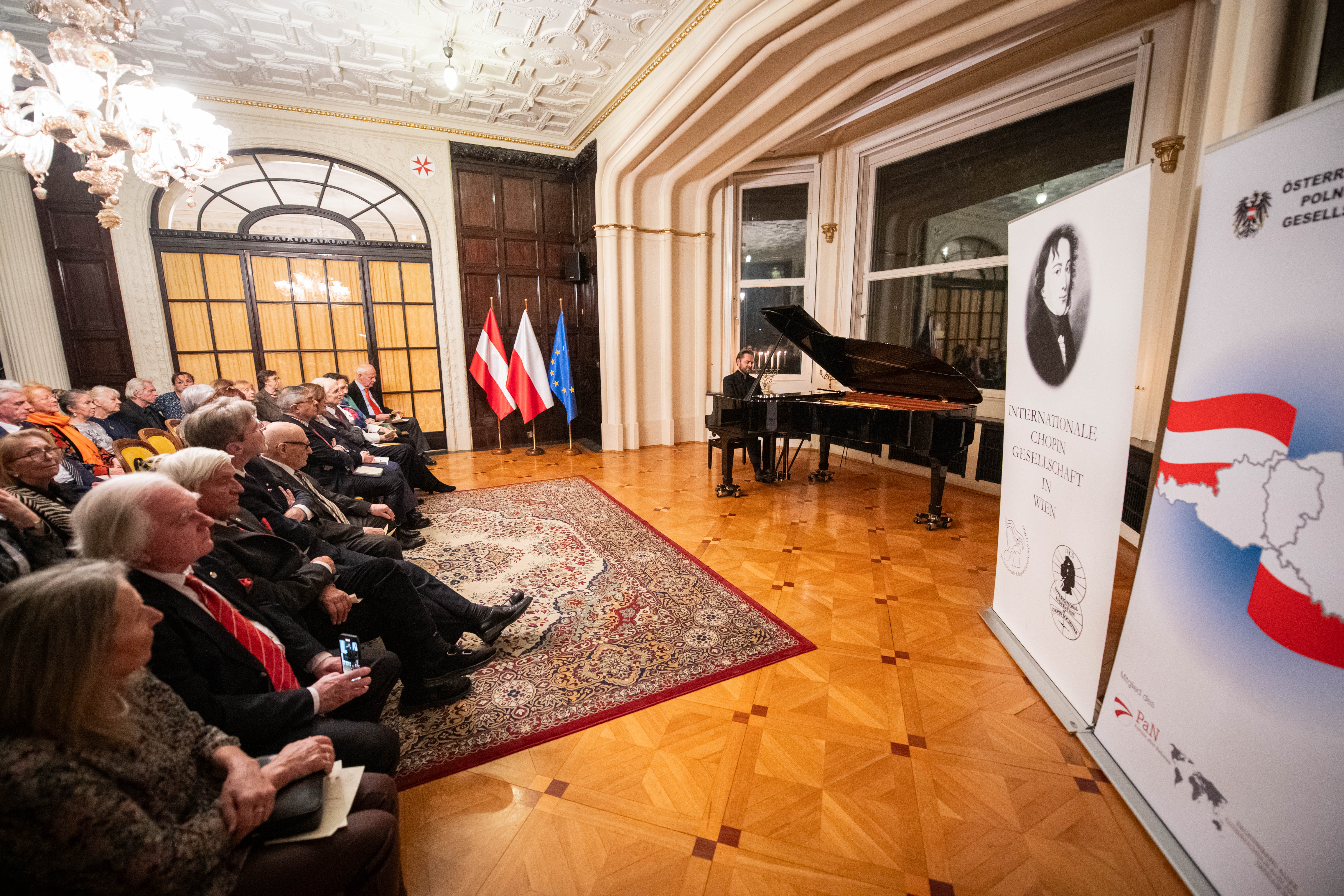 Na zaproszenie szefa misji dyplomatycznej Zenona Kosiniaka-Kamysza oraz prezesa Towarzystwa Austriacko-Polskiego oraz Międzynarodowego Towarzystwa Chopinowskiego w Wiedniu prof. Theodora Kanitzera w czwartek 30 stycznia w siedzibie Ambasady RP w Wiedniu odbyło się spotkanie noworoczne. Uczestnikami wydarzenia byli m.in. przedstawiciele austriackich środowisk twórczych i akademickich oraz członkowie stowarzyszenia. Gościem honorowym był ambasador Austrii w Polsce Andreas Stadler.