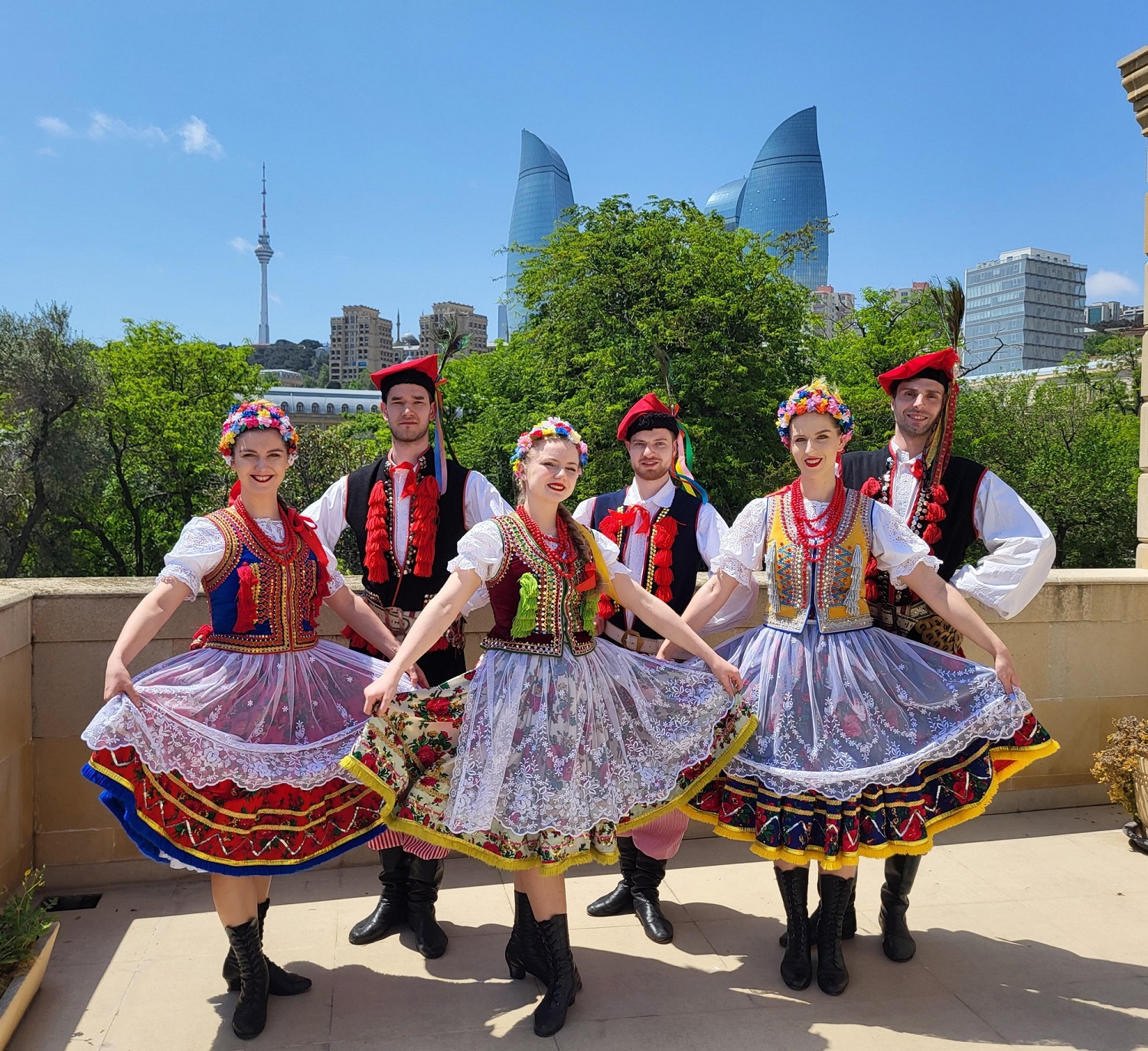 W dniach 2 – 6 maja 2023 r., na zaproszenie Ambasady RP w Baku, w Azerbejdżanie przebywała krakowska grupa taneczna „Pawie Pióra", specjalizująca się w wykonywaniu pokazów polskich tańców ludowych.