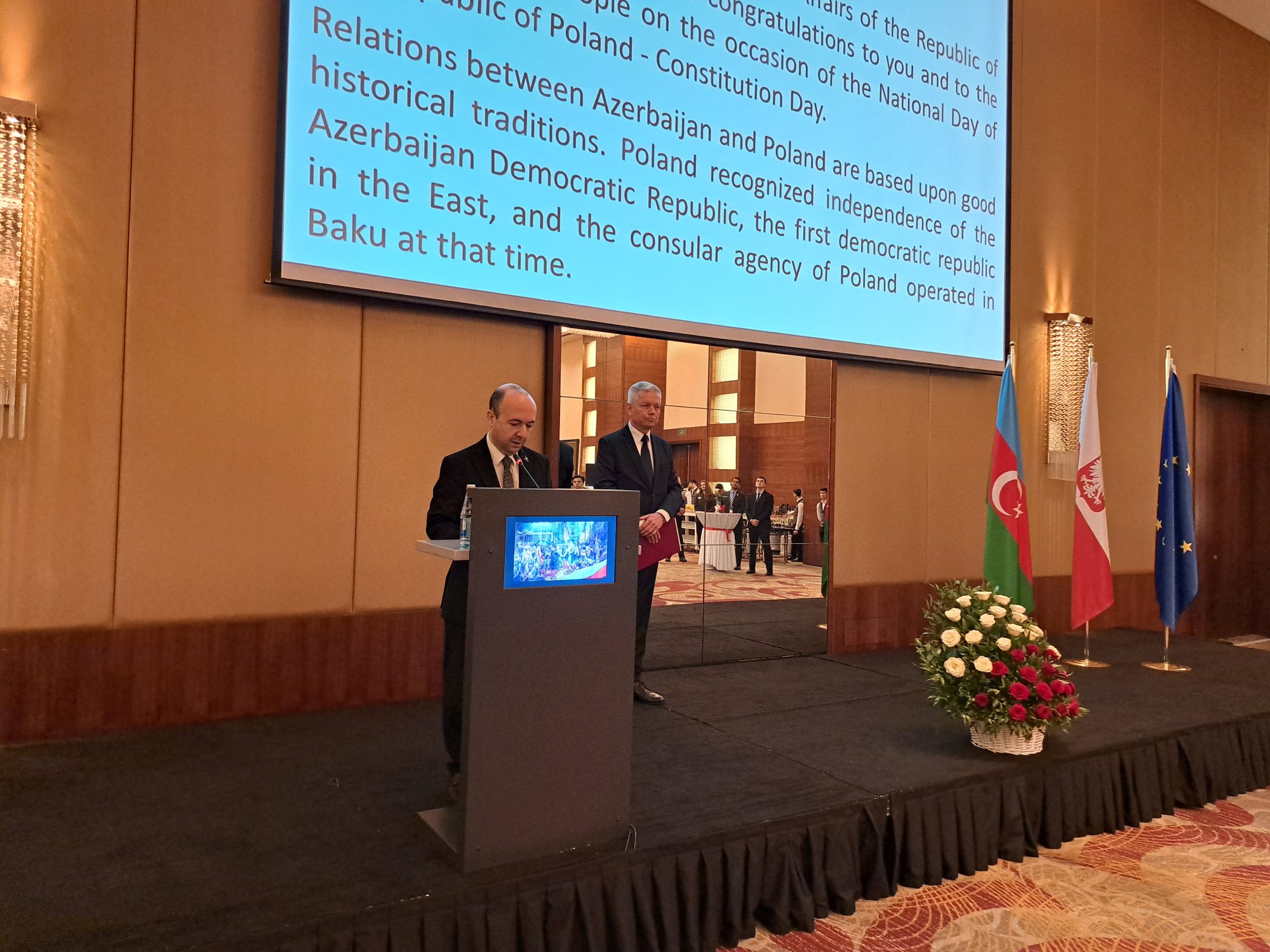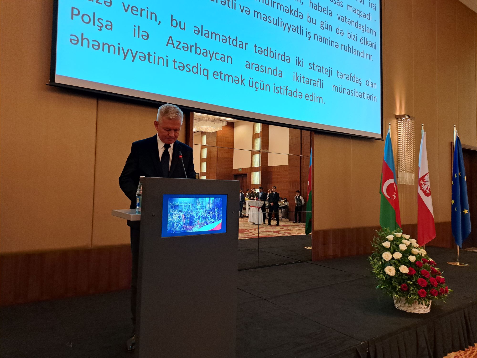 Kierownik Ambasady RP w Baku, Paweł Radomski, w wystąpieniu powitalnym podkreślił historyczne znaczenie Konstytucji 3 Maja. Zaakcentował też dużą wagę stosunków z Azerbejdżanem dla Polski oraz gotowość strony polskiej do współpracy w formule dwustronnej i multilateralnej. Kluczowa część wystąpienia dotyczyła priorytetów polskiej prezydencji w Radzie Unii Europejskiej, w szczególności kwestii związanych z bezpieczeństwem. W tym kontekście w przemówieniu bardzo silnie wybrzmiało poparcie Polski dla Ukrainy i gotowość kontynuowania go tak długo, jak to będzie konieczne. Elementem promocji Polski podczas wydarzenia była wystawa „Polish Inventions that Changed the World”, poświęcona polskim wynalazkom technicznym z okresu XIX i XX w.