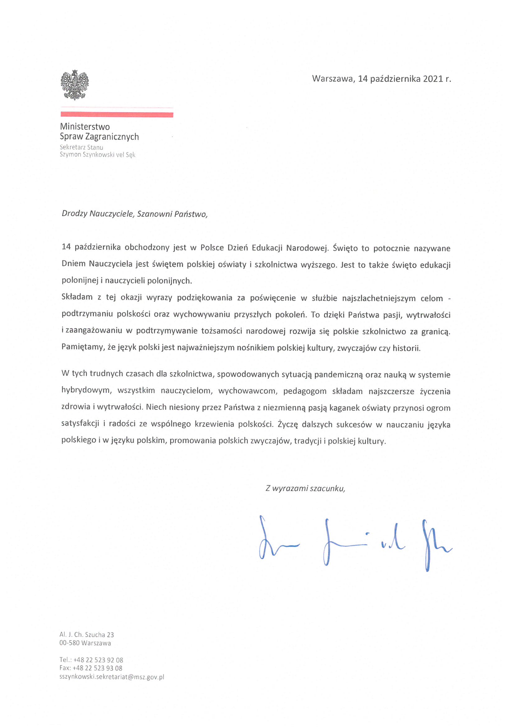 Minister Szymon Szynkowski vel Sęk złożył życzenia z okazji obchodzonego w Polsce Dnia Edukacji Narodowej.