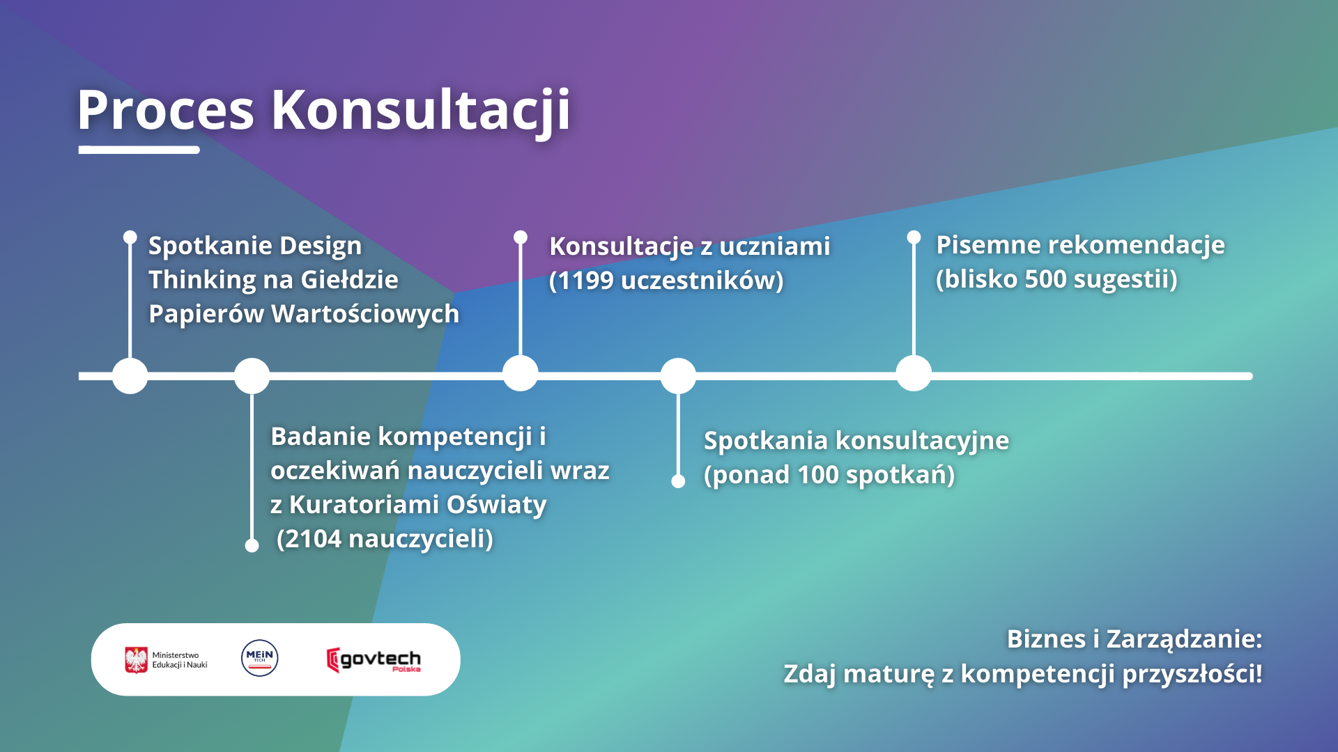 We współpracy z Centrum GovTech, Radą Dialogu z Młodym Pokoleniem oraz Piotrem Mazurkiem – Pełnomocnikiem Rządu ds. Polityki Młodzieżowej przeprowadziliśmy ogólnopolskie konsultacje. Za cel obraliśmy zebranie opinii i preferencji uczniów nt. wdrożenia nowego przedmiotu. Wysłaliśmy formularz ankietowy do wszystkich uczniów biorących udział w konsultacjach „Strategii RP na rzecz Młodego Pokolenia”. Po zakończeniu zbierania wyników zorganizowaliśmy ogólnopolskie spotkanie konsultacyjne online z udziałem Ministra Edukacji i Nauki Przemysława Czarnka, Sekretarza Stanu w Kancelarii Prezesa Rady Ministrów, Pełnomocnika Rządu ds. Polityki Młodzieżowej Piotra Mazurka i Wicedyrektora Programu GovTech Polska w Kancelarii Prezesa Rady Ministrów Antoniego Rytla. Konsultacje odbyły się 17 maja 2022 roku. W spotkaniu uczestniczyło blisko tysiąc młodych osób z całej Polski. Wspólnie z uczniami dostosowywaliśmy program przedmiotu do ich potrzeb i oczekiwań, biorąc pod uwagę przyszłe pokolenia.