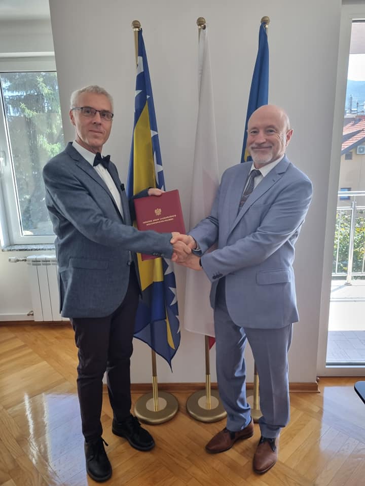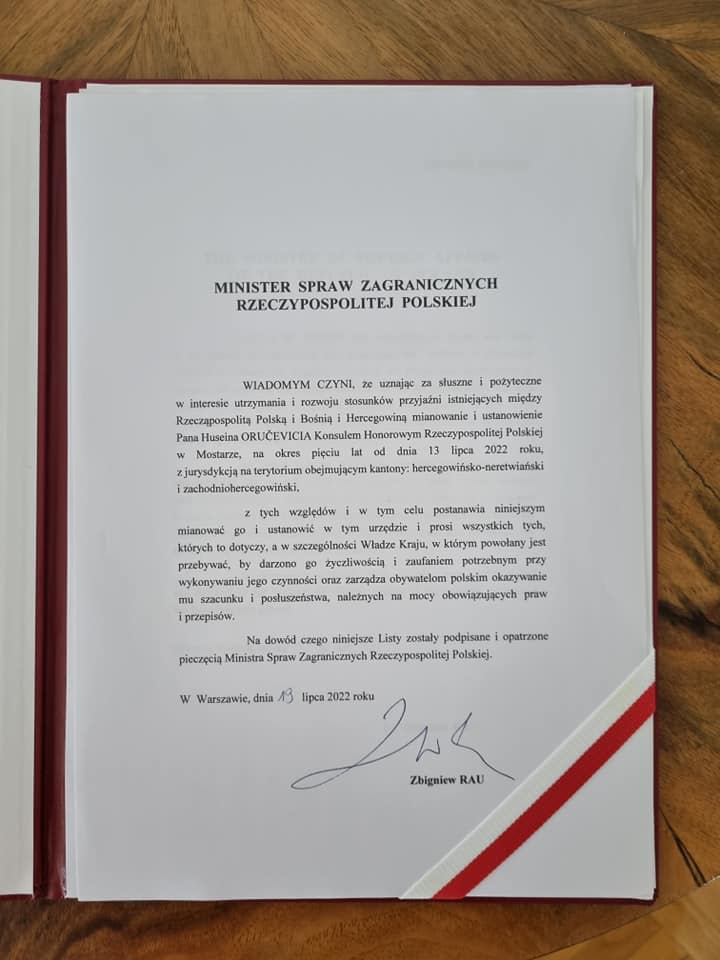 Z rąk Ambasadora RP w Sarajewie J. E. Jarosława Lindenberga Pan Husein Oručević otrzymał nominację na Konsula Honorowego RP w Mostarze.