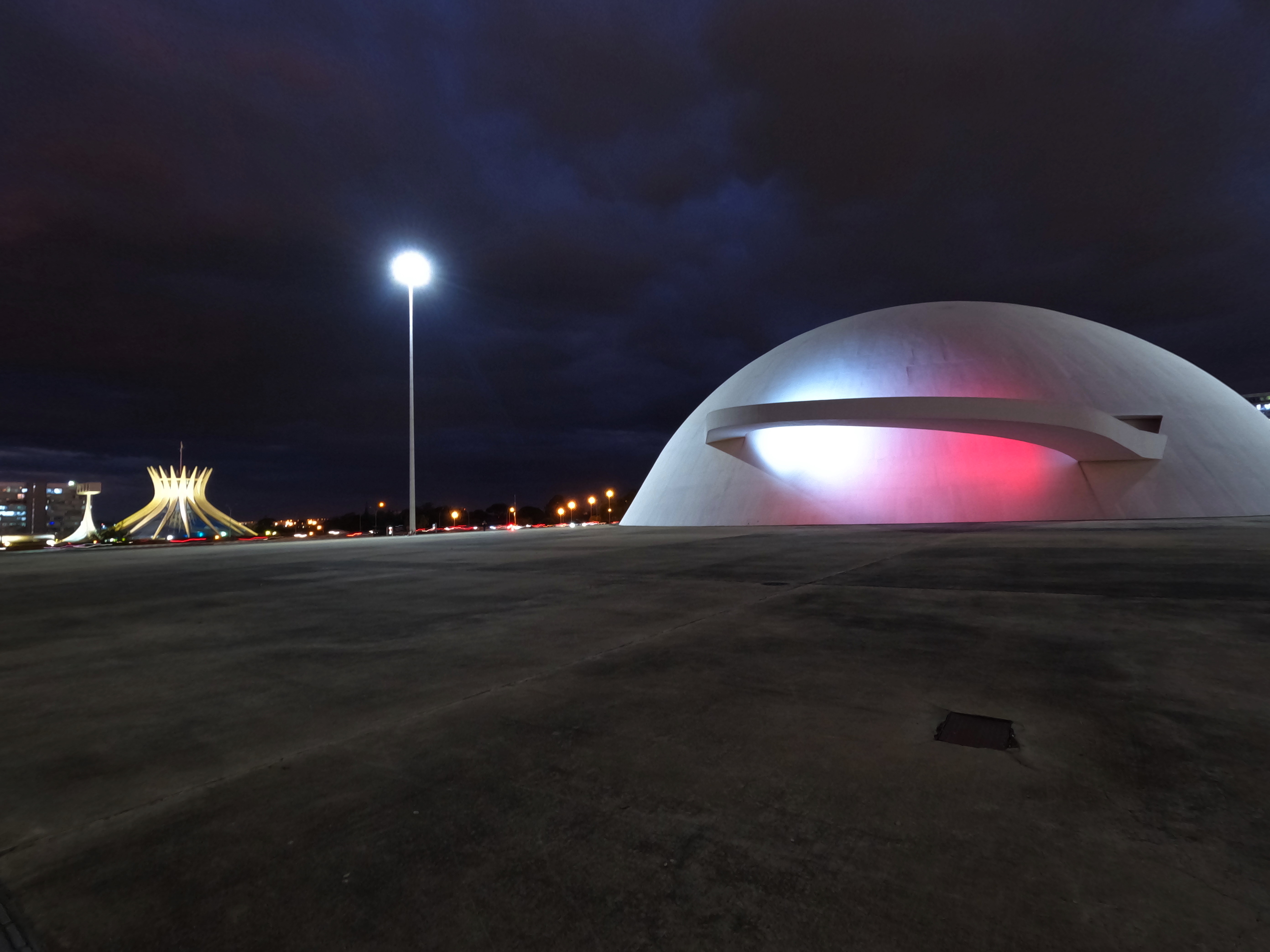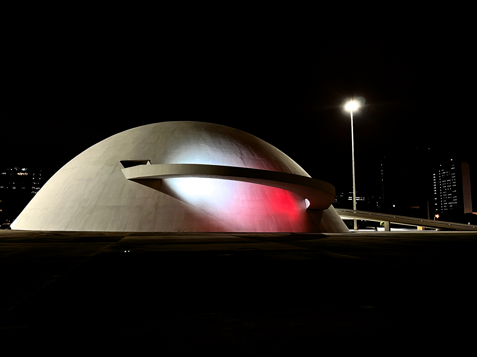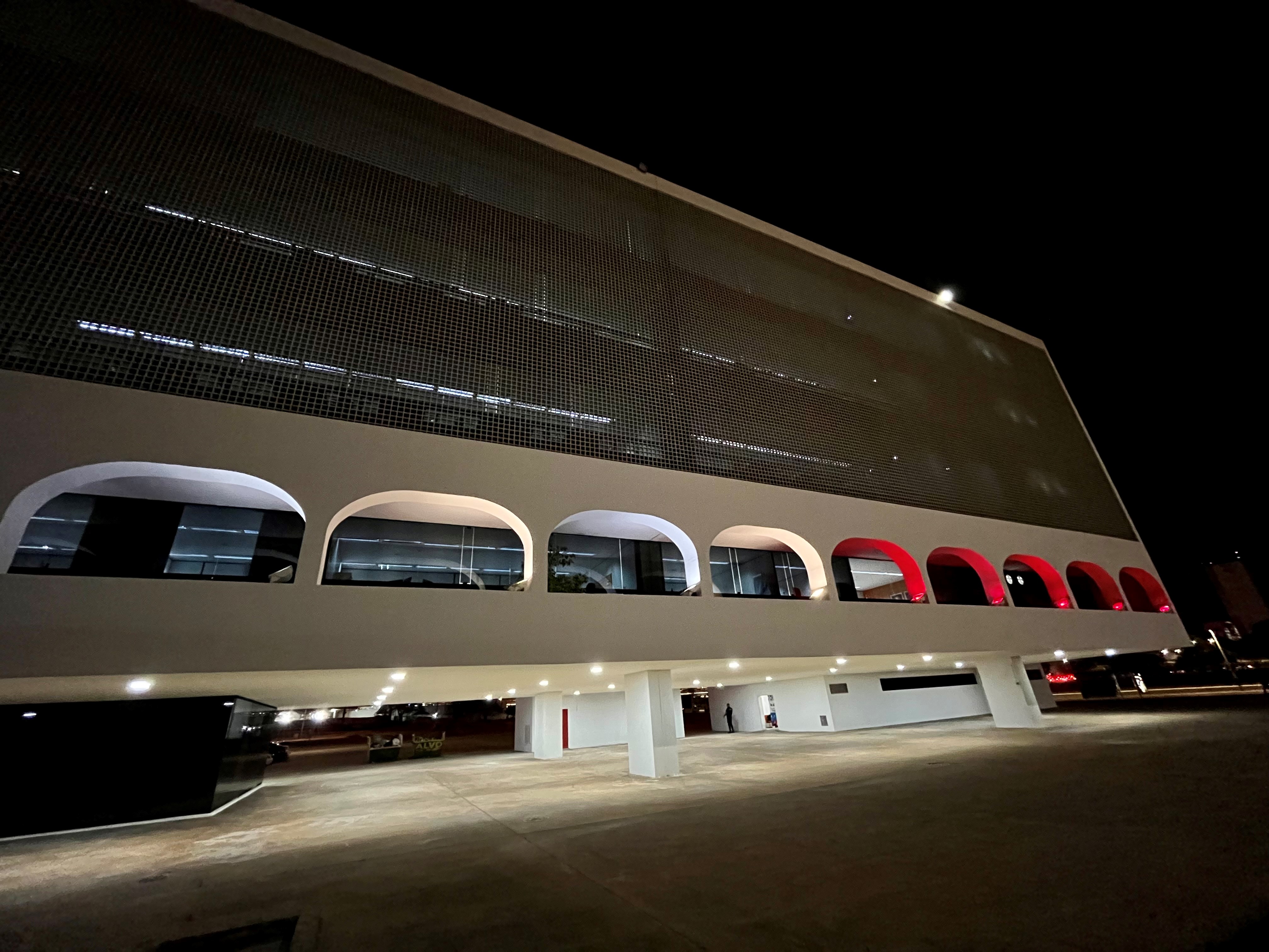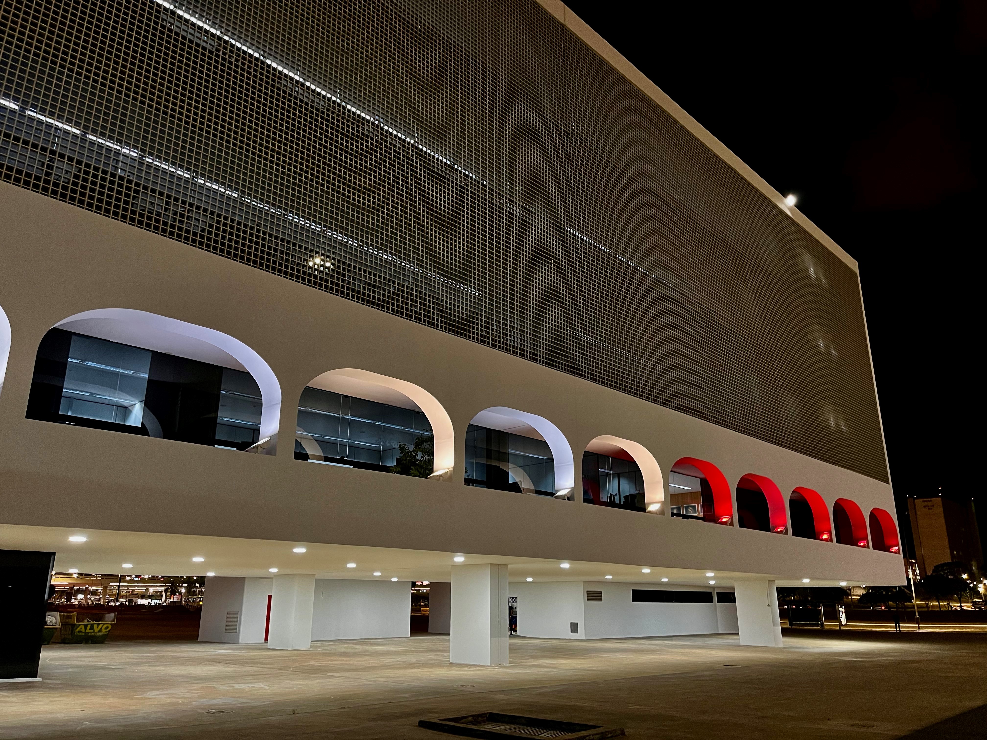 Arquitetura da cidade futurista de Brasília - Museu Nacional e Biblioteca Nacional - em branco e vermelho.