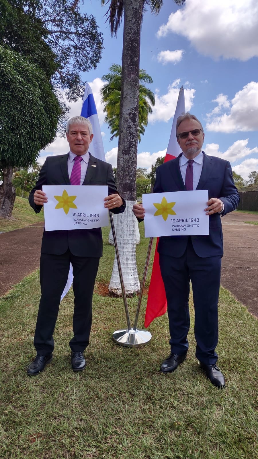 W dniu rocznicy wybuchu Powstania w Getcie Warszawskim ambasador RP w Brasilii Jakub Skiba oraz ambasador Państwa Izrael w Brasilii Daniel Zonshine wspólnie upamiętnili wydarzenie fotografując się z symbolicznymi żonkilami – kwiatami, które stały się symbolem powstańczego zrywu sprzed 79 lat.