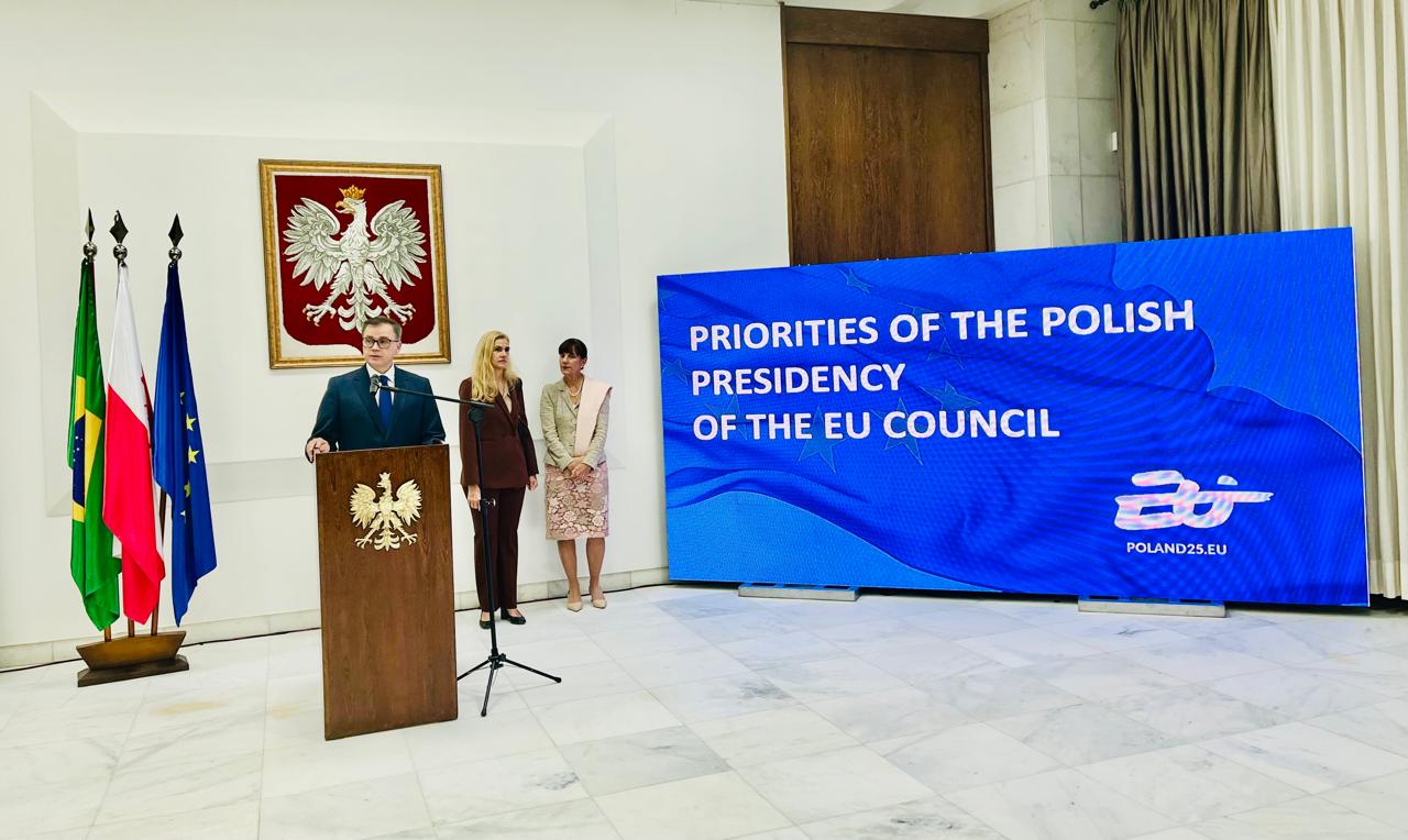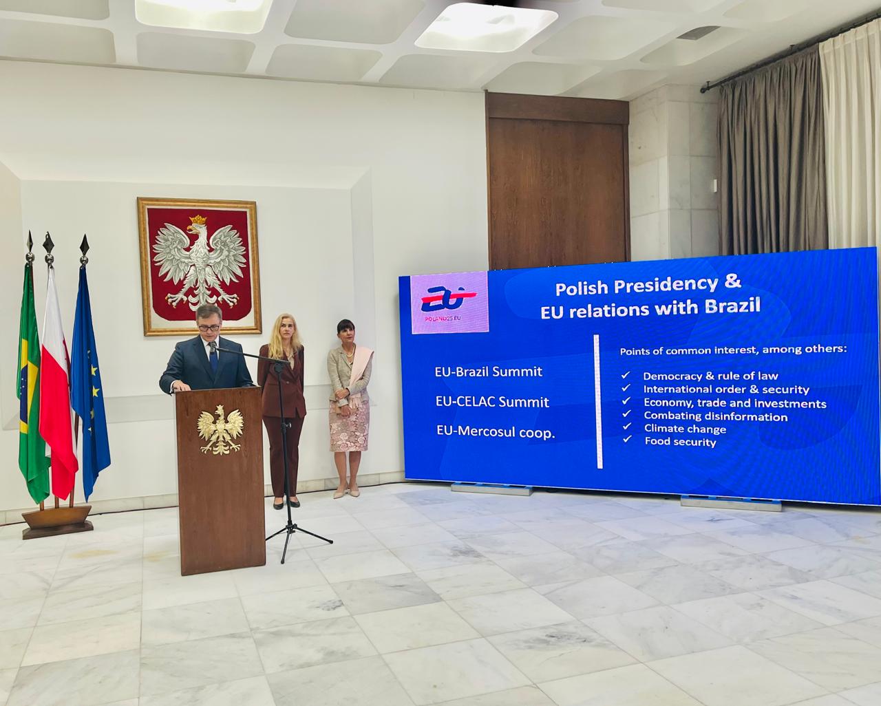 W swoim wystąpieniu chargé d’affaires Andrzej Cieszkowski przedstawił priorytety polskiej Prezydencji, podkreślając, że wiele z nich odnosi się do ważnych dla Brazylijczyków kwestii, w tym m.in.: zwalczania dezinformacji, bezpieczeństwa żywnościowego, zmian klimatu, bezpieczeństwa międzynarodowego czy rządów prawa. Zaznaczył, że Brazylia jest ważnym partnerem Polski, a UE jest największym zagranicznym inwestorem i drugim co do wielkości partnerem handlowym Brazylii.