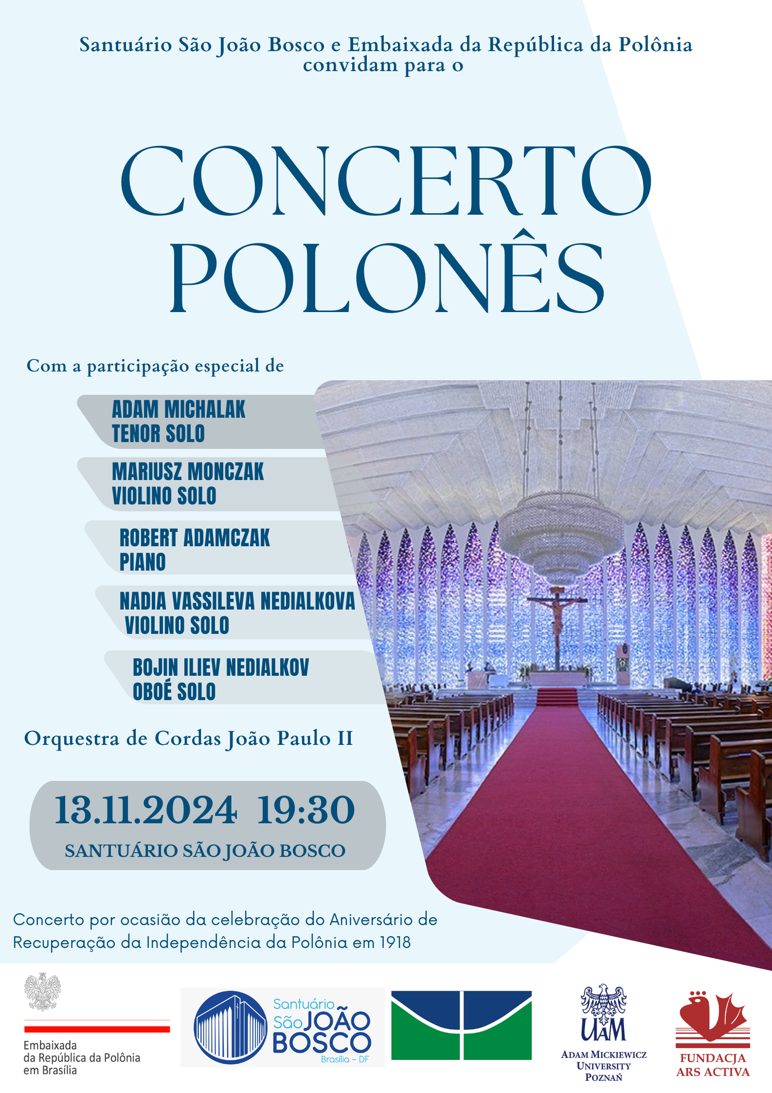 W dniu 13 listopada br. Ambasada RP w Brasílii zorganizowała koncert z okazji Narodowego Święta Niepodległości w Sanktuarium Dom Bosco w Brasílii. Program wydarzenia obejmował występ orkiestry smyczkowej z Uniwersytetu w Brasílii oraz trzech polskich solistów – dr. Mariusza Monczaka, dr. Adama Michalaka oraz prof. Roberta Adamczaka. Muzycy wykonali utwory takich kompozytorów jak: W. Kilar, H. Wieniawski, K. Niegowski, N. Palej, J.S. Bach oraz H.V. Lobos i W. Gomez. Po koncercie Ambasada zorganizowała przyjęcie dla przedstawicieli korpusu dyplomatycznego, władz lokalnych oraz społeczności polonijnej stolicy.