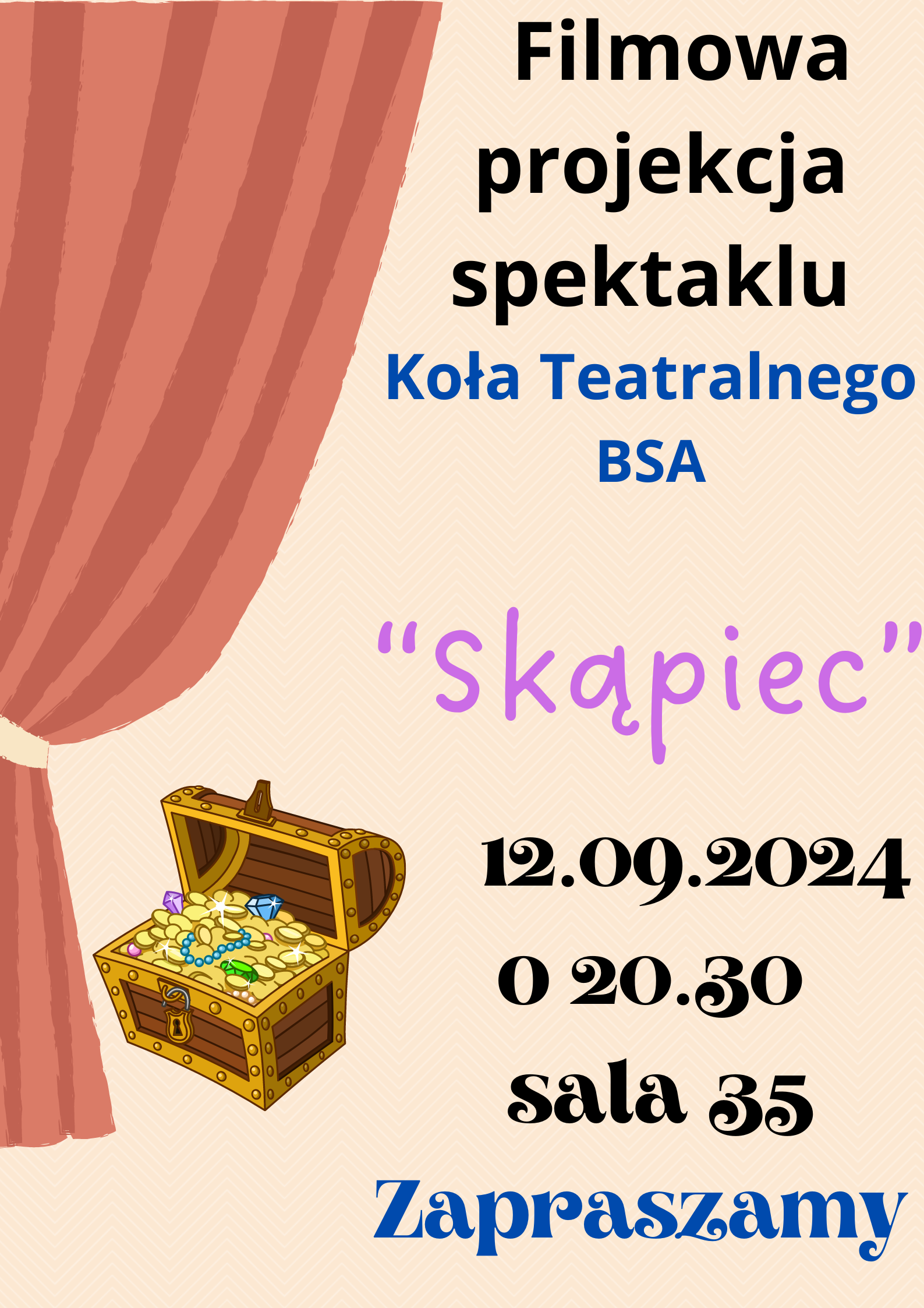 Filmowa projekcja spektaklu Koła Teatralnego BSA pt. "Skąpiec" 11.09.2024 Zdjęcia (1) Pokaż zdjęcie 1 z galerii.