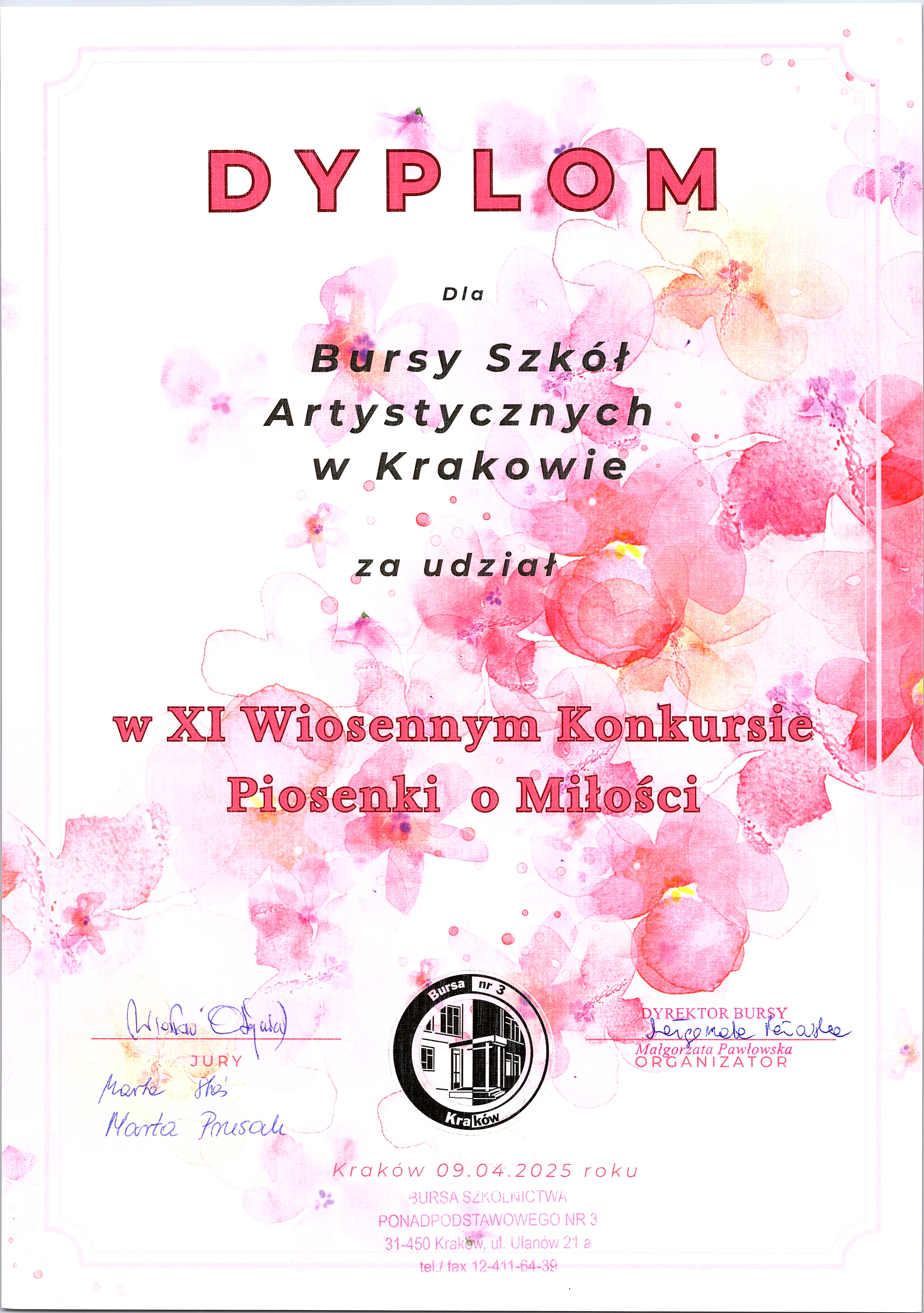 W dniu 09.04.2025 roku w Bursie Szkolnictwa Ponadpodstawowego nr 3 w Krakowie odbył się Konkurs Piosenki o Miłości, który zaadresowany był do młodzieży mieszkającej w internatach i bursach w województwie małopolskim. Naszą placówkę reprezentowali: Karolina Kutypa z piosenką „Memory” z musicalu „Koty” – Andrew Lloyd Webber oraz Rafał Gaura z piosenką „Caro mio ben” – Giuseppe Giordani, który zajął III miejsce. Gratulujemy:)