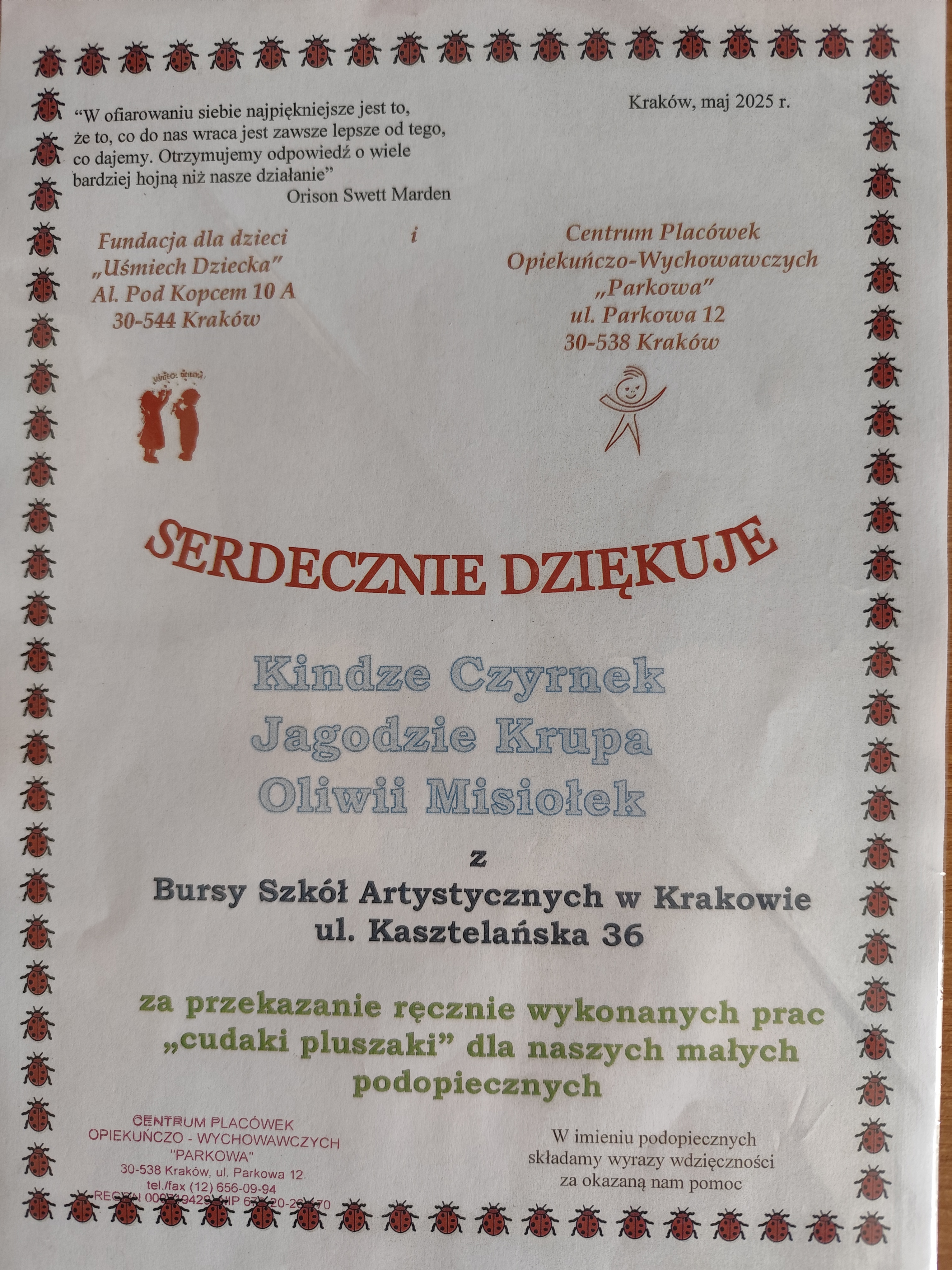 Takie hasło towarzyszyło 2 naszym wychowankom, które wykonały metodą szydełkowania kolorowe "pluszaki - cudaki". Zostały one przekazane dzieciom z placówki opiekuńczo - wychowawczej al. Pod Kopcem w Krakowie. Maskotki zajęły już swoje miejsce na półce pomiędzy innymi zabawkami i cieszą się sporym zainteresowaniem maluchów:-). Autorki prac (Jagoda Krupa i Kinga Czyrnek) otrzymały pisemne podziękowanie od dyrekcji placówki.