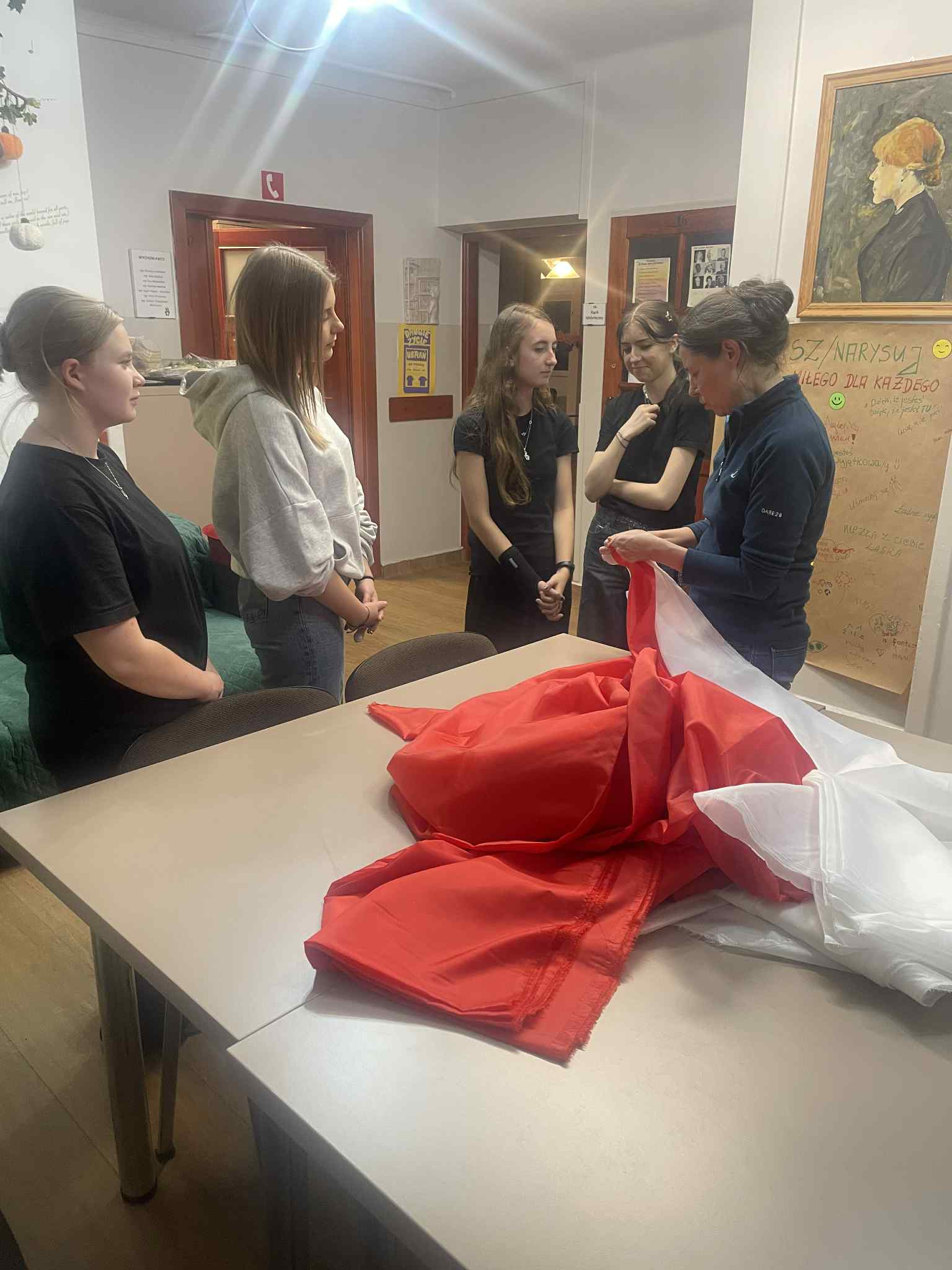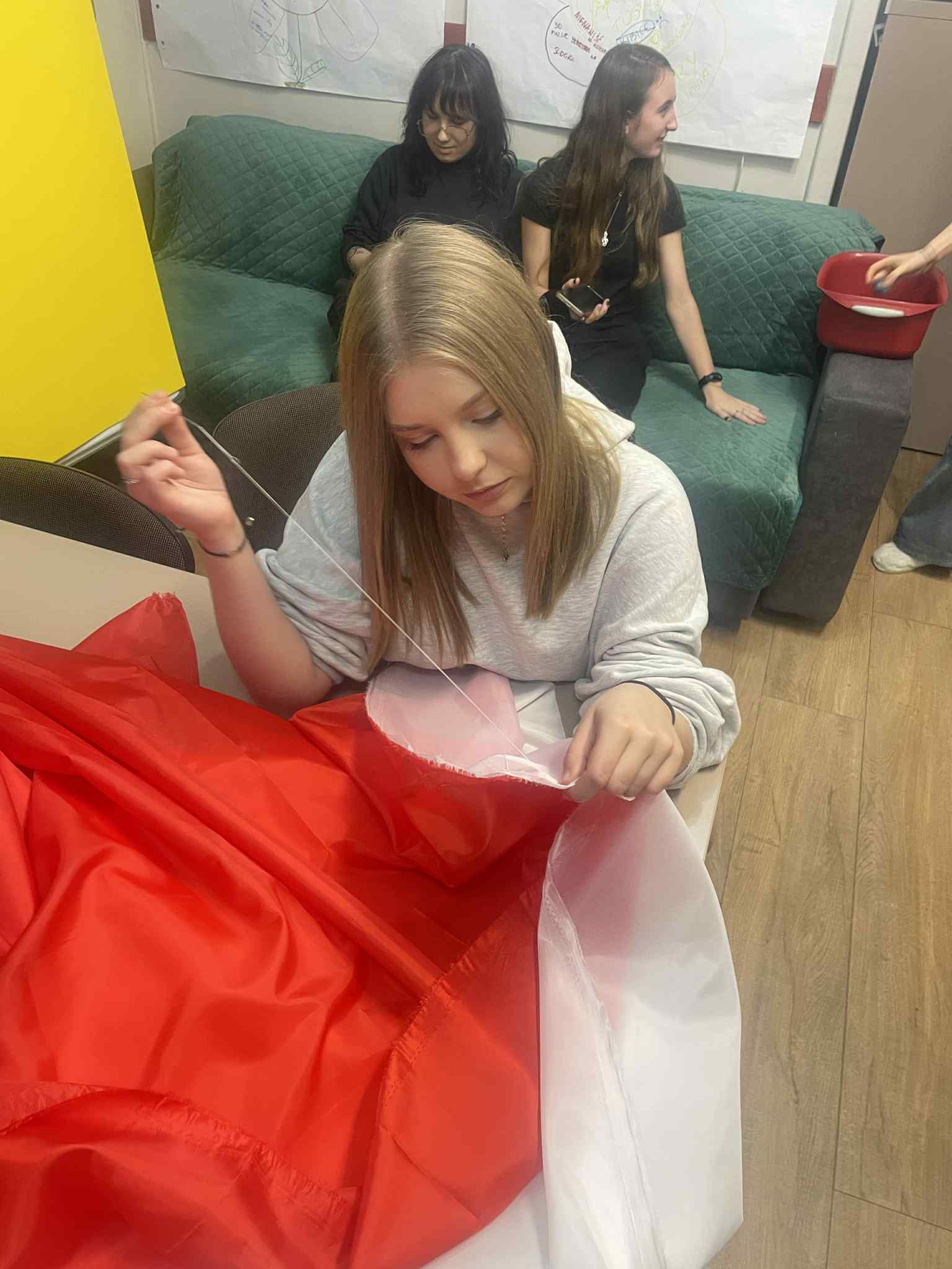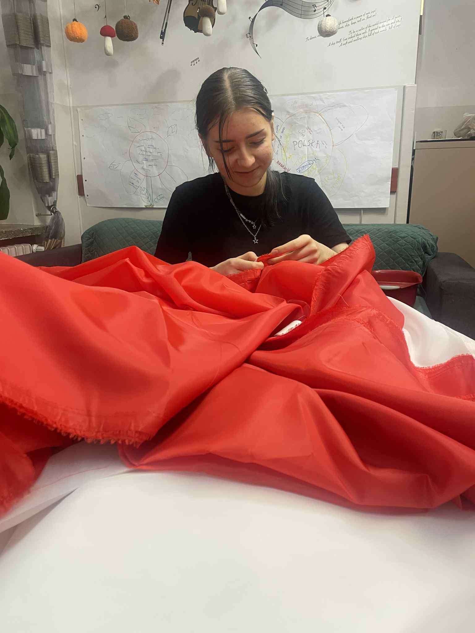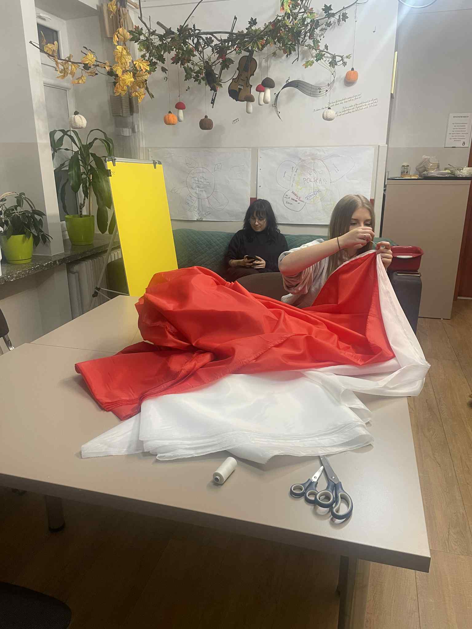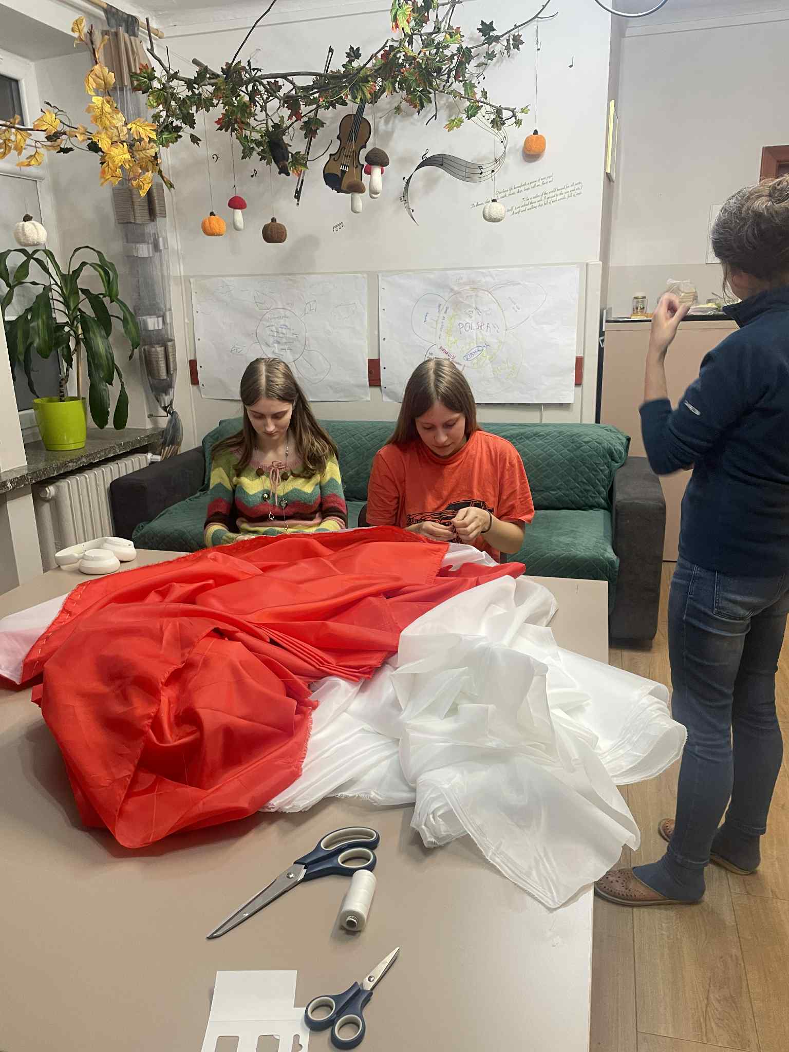 Z okazji Święta Niepodległości szyjemy ręcznie, każdy po kawałku, wielką flagę.