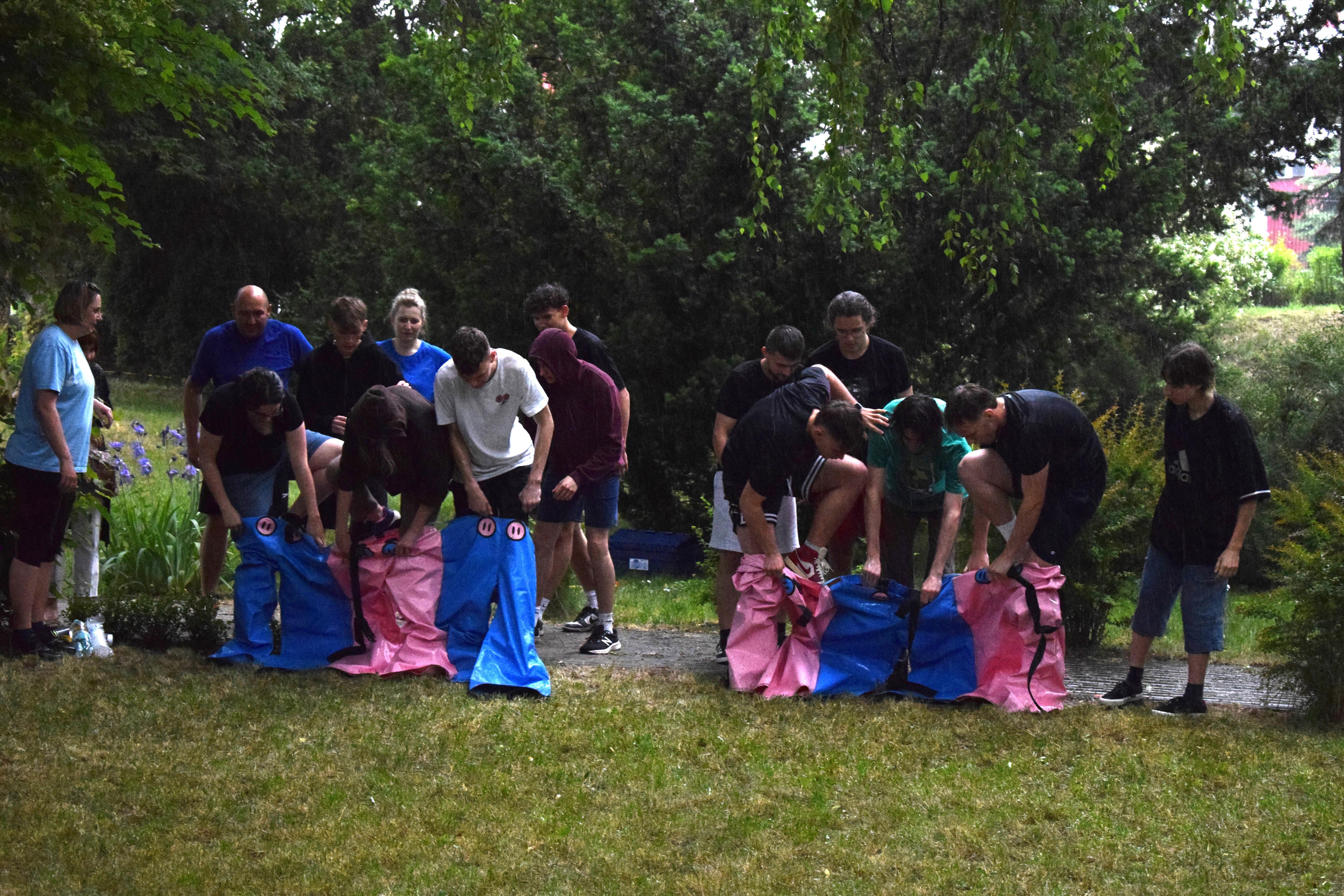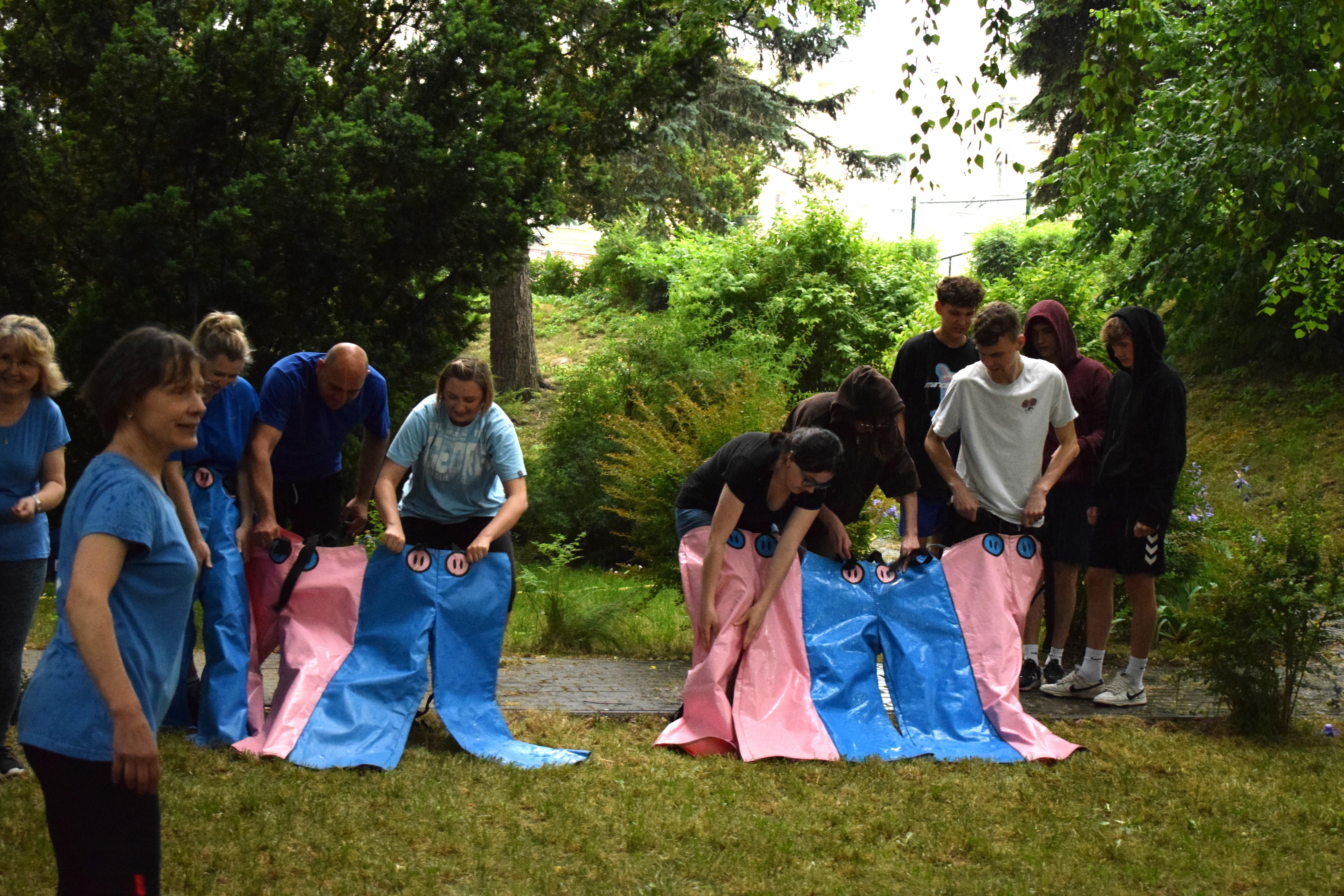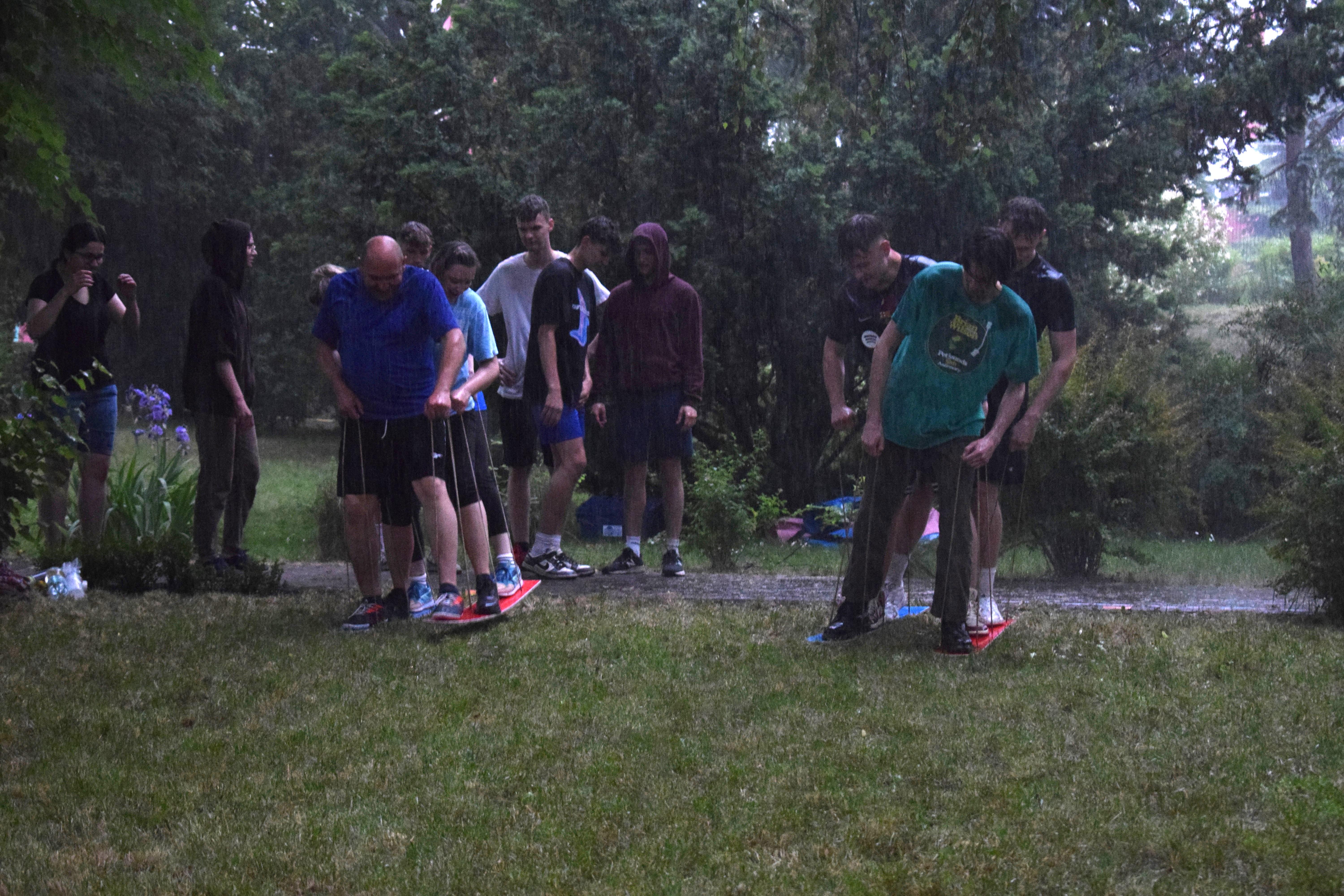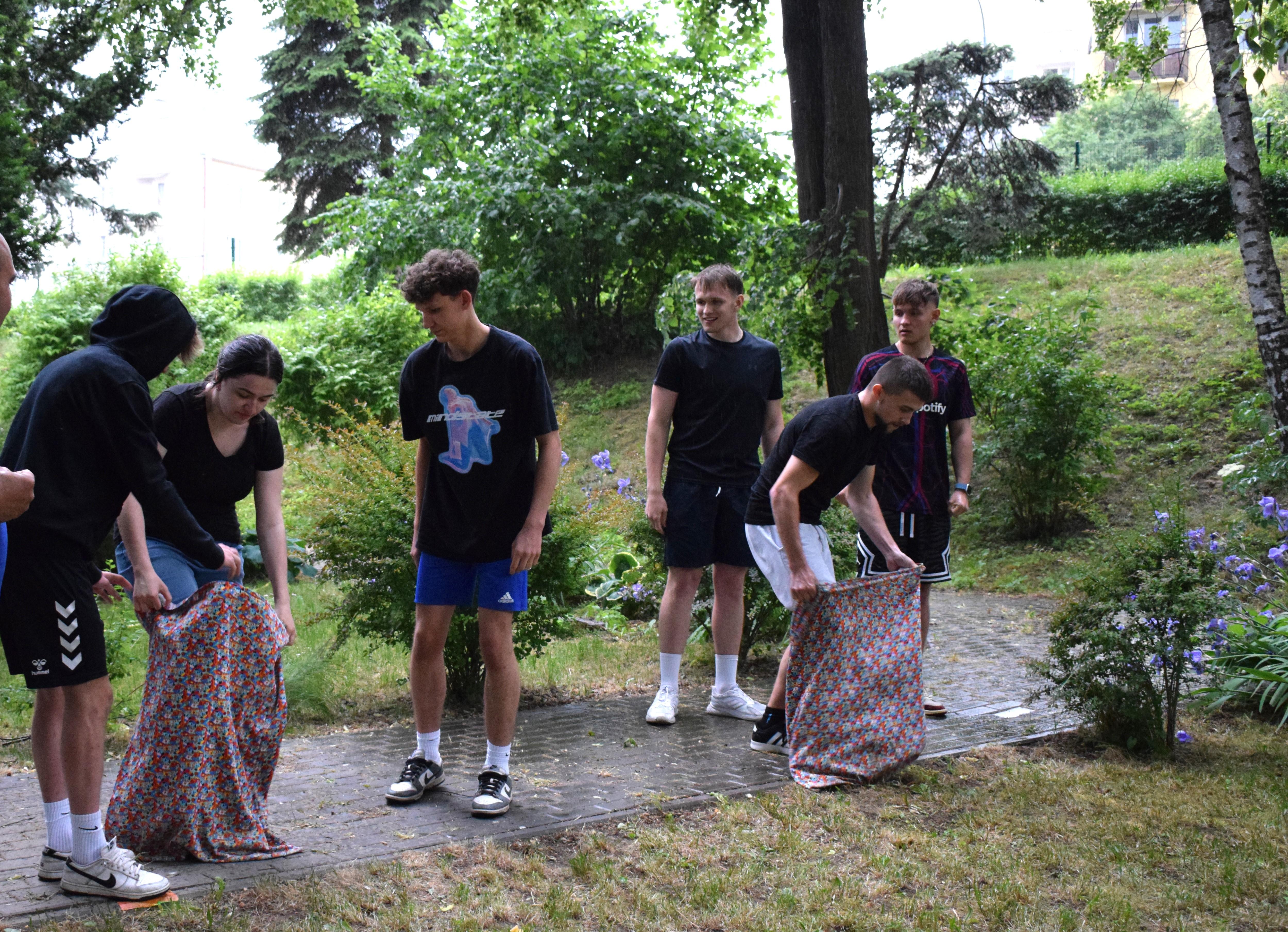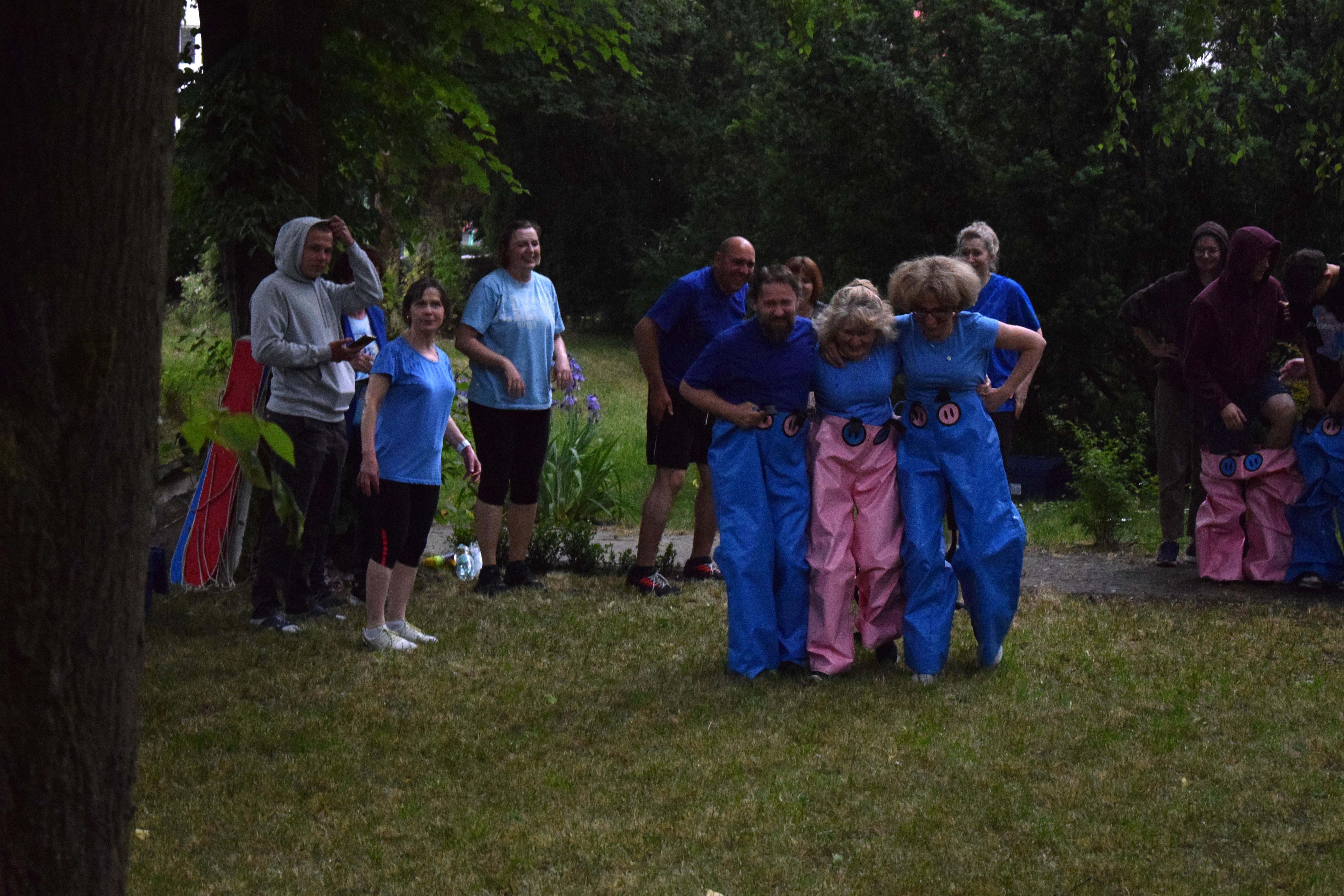 Kto powiedział, że w strugach deszczu nie można robić rozgrywek drużynowych? Poza zdrowym rozsądkiem - nikt. Ale trzeba pamiętać, że w ferworze emocji, gdy zwycięstwo (lub porażka) zagląda w oczy, żadne przeszkody nie są w stanie zatrzymać walecznych serc zawodników o poziomie morale godnym lepszej sprawy. Nasz bursiany ogród okazał się doskonałym miejscem na zmagania drużyn i to nie byle jakich. W szranki stanęła młodzież oraz ... wychowawcy pod wodzą pani wicedyrektor. Zadania oceniane przez bezstronnych sędziów wymagały nie lada sprytu, szybkości ale też współpracy. Bo czy łatwo jest trzem osobom biec w zszytych ze sobą trzech parach spodni? Ano nie łatwo. A co z wędrówką na specjalnie przygotowanych nartach? Wcale nie lepiej. A już w ogóle ciężko gdy próbując jednocześnie skoordynować ruchy wybucha się niekontrolowanym śmiechem... Ciężko, oj ciężko w drodze po upragnione zwycięstwo. Kto wygrał? Cóż chwilowo jednak deszcz, który zagrażał telefonom naszych sędziów. W związku z tym zawody kontynuowaliśmy następnego dnia. No więc kto wygrał? A czy to ważne? Grunt, ze zabawa była przednia! No dobrze, wychowankowie wygrali. Gratulujemy i zapraszamy na rewanż w następnym roku szkolnym 😉
