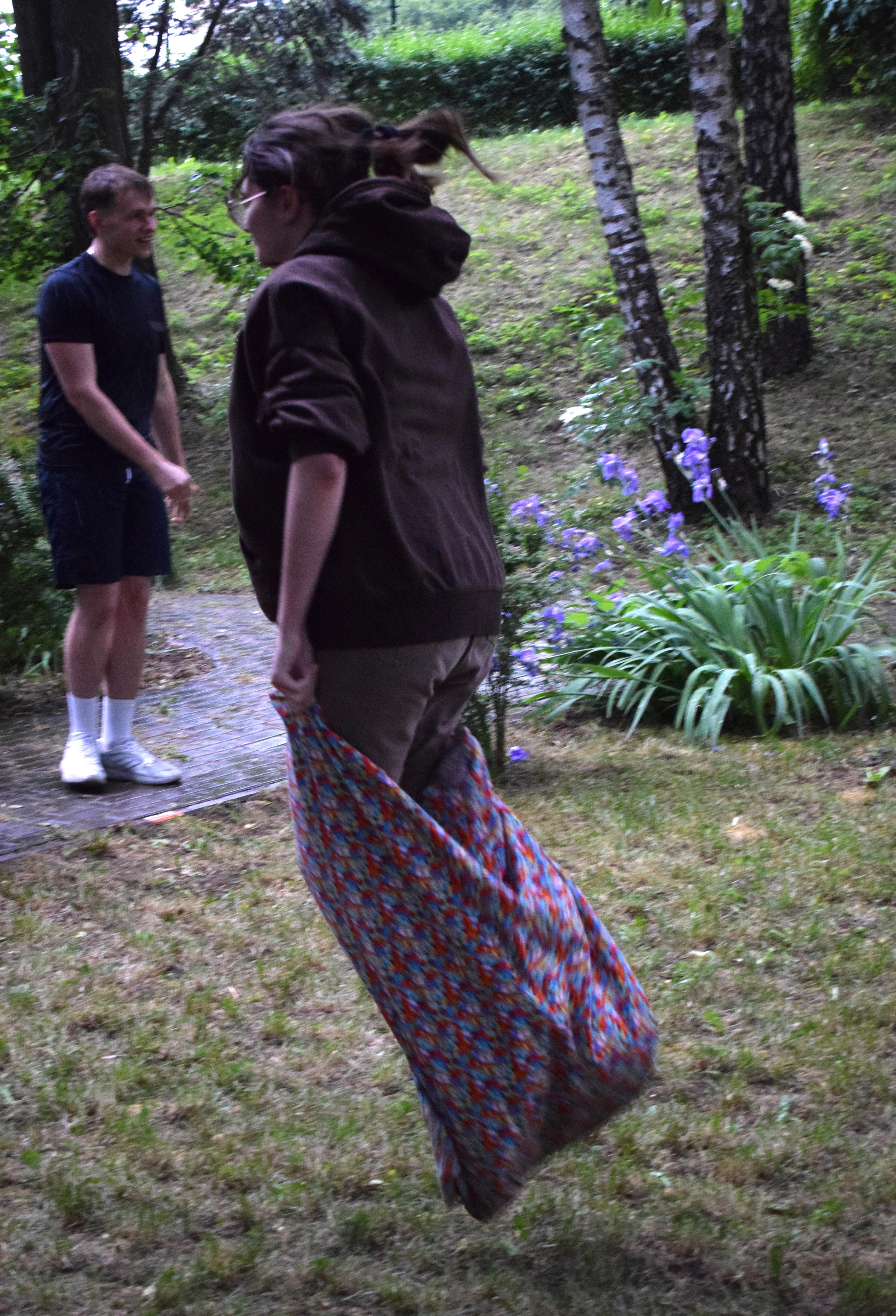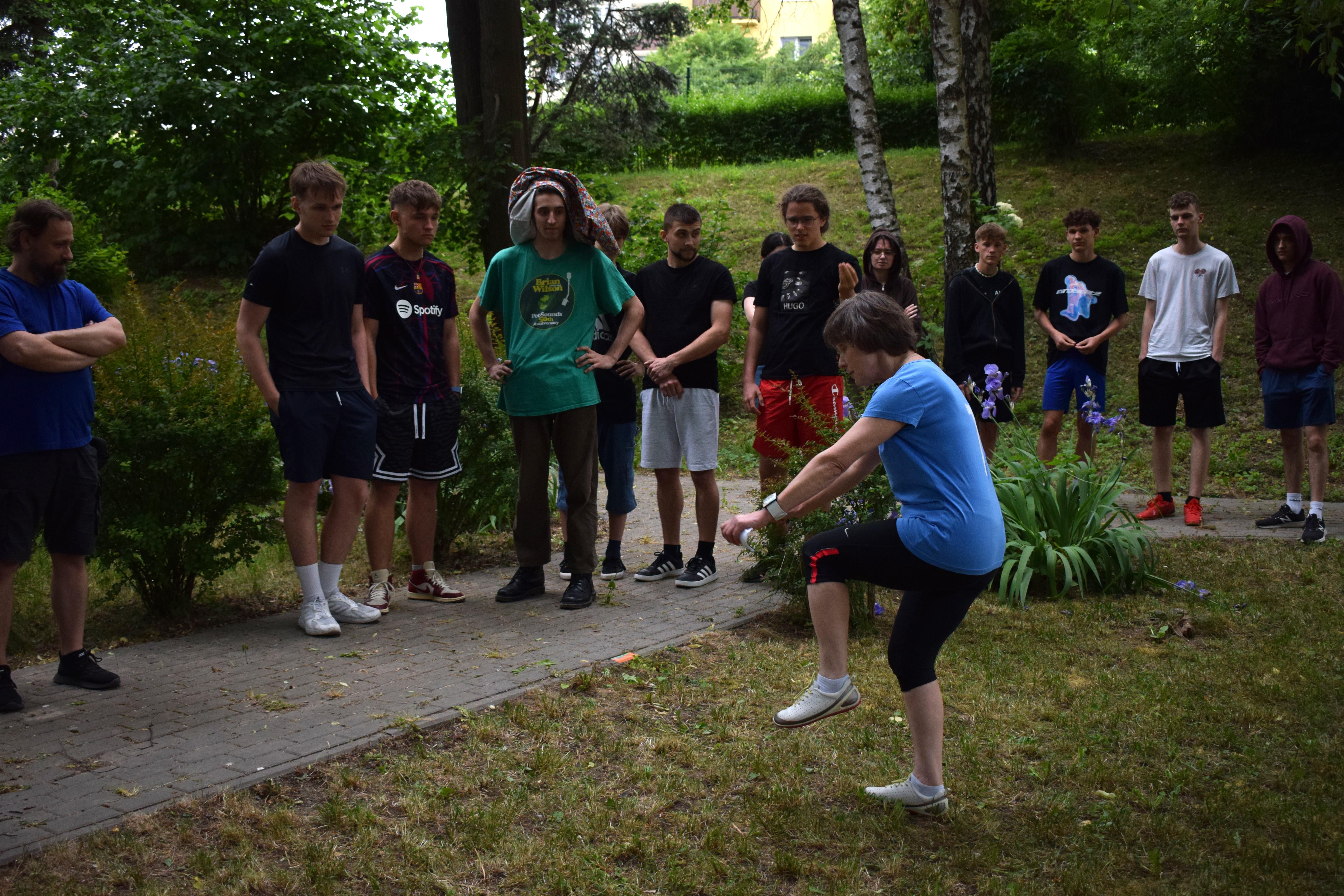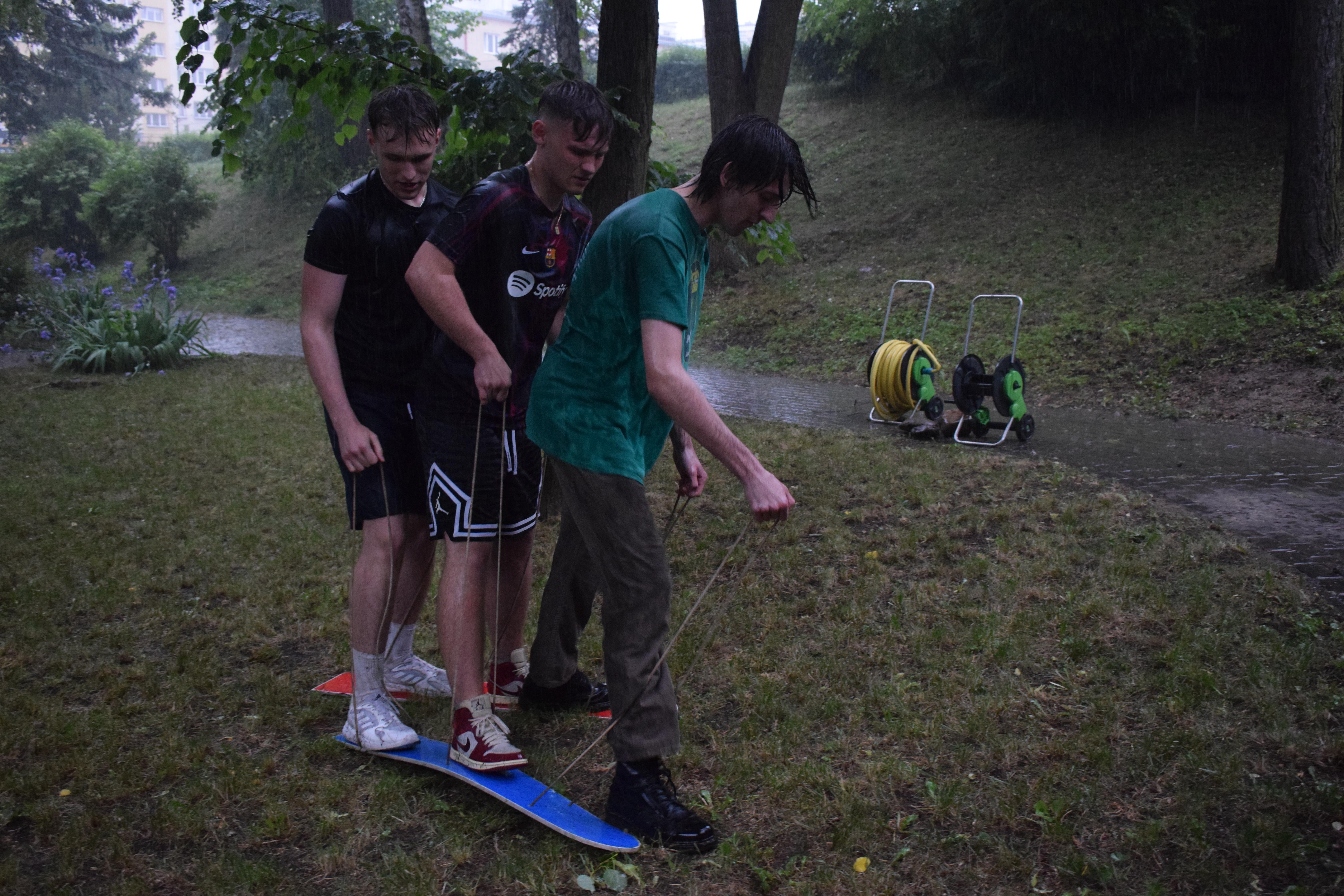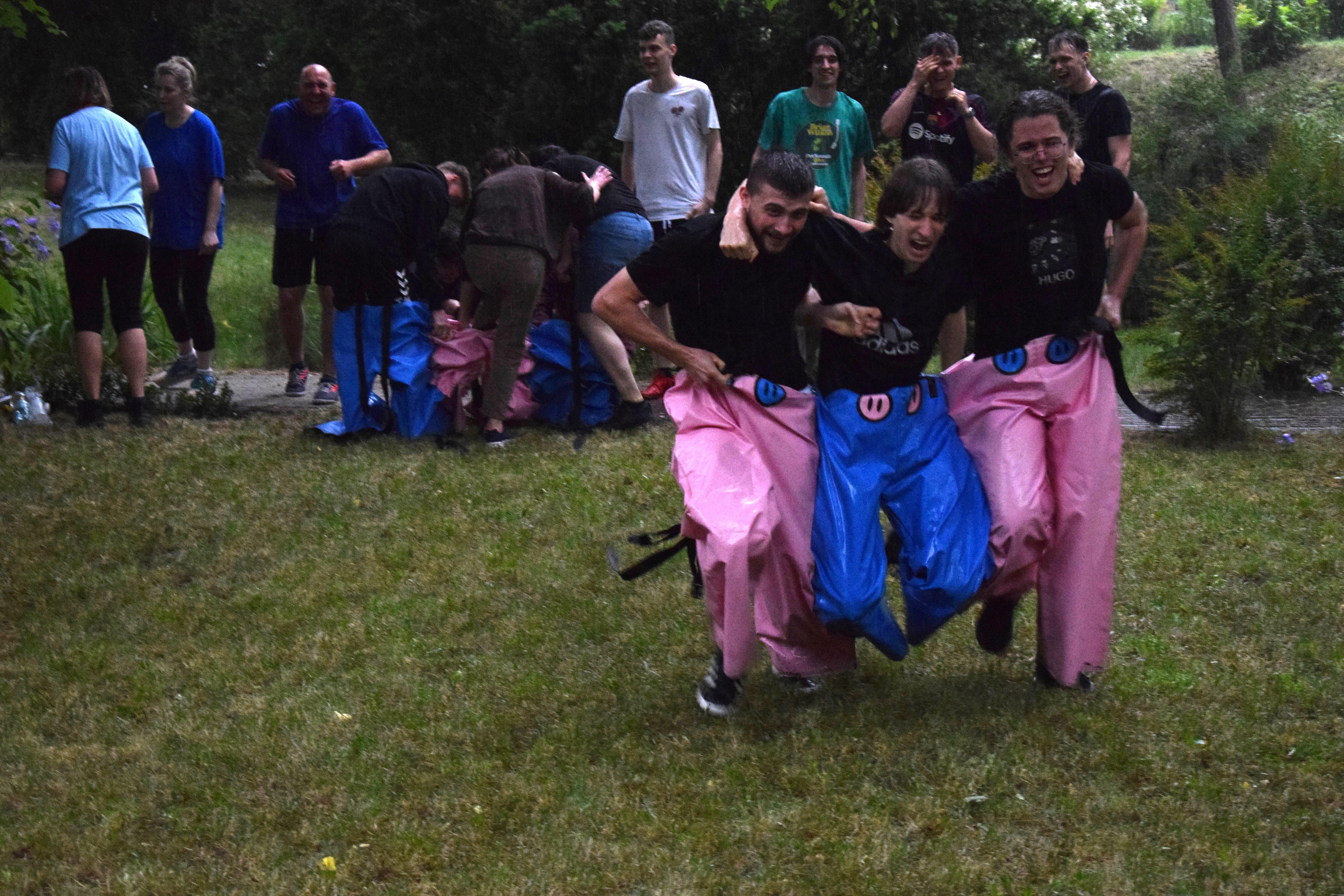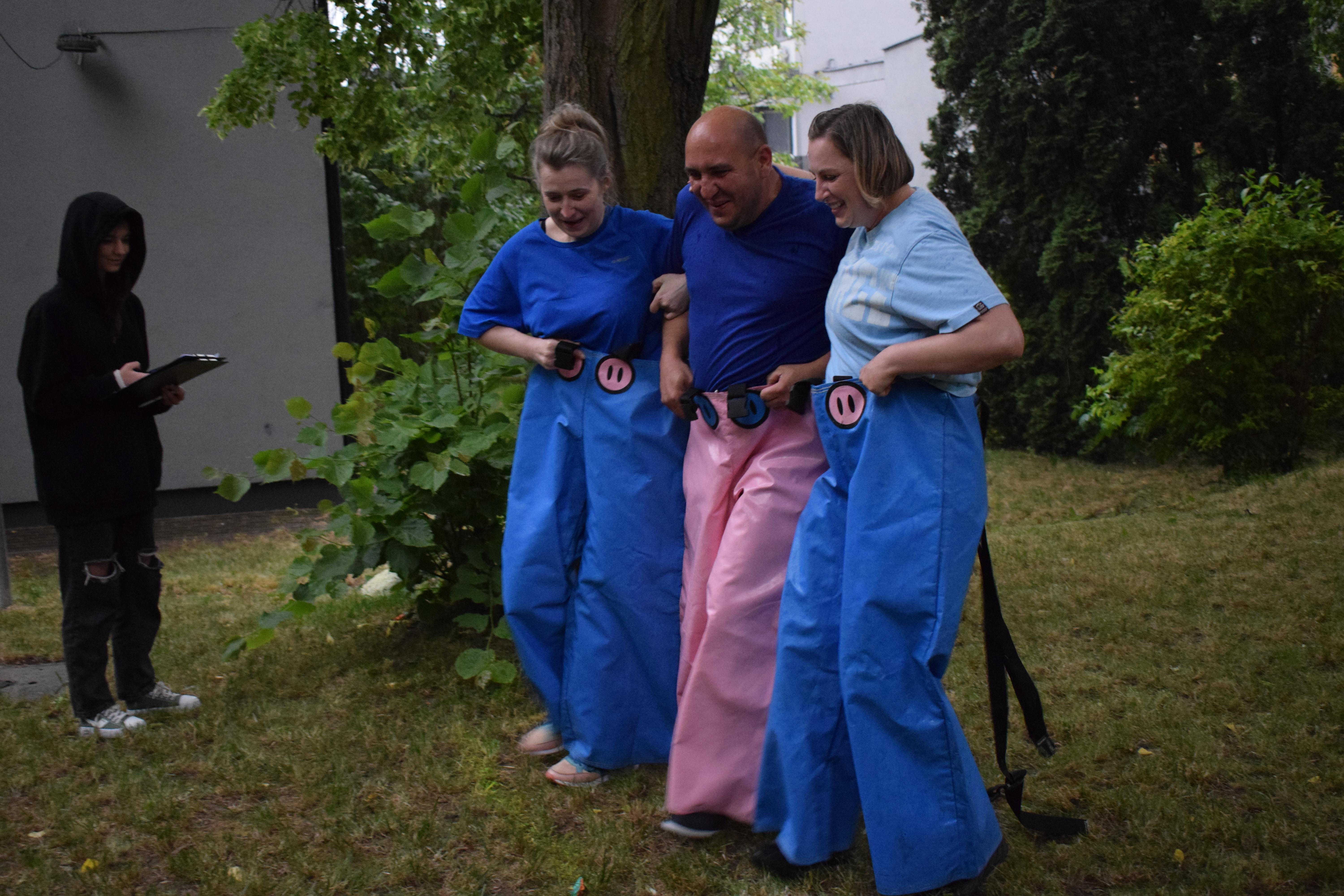 Kto powiedział, że w strugach deszczu nie można robić rozgrywek drużynowych? Poza zdrowym rozsądkiem - nikt. Ale trzeba pamiętać, że w ferworze emocji, gdy zwycięstwo (lub porażka) zagląda w oczy, żadne przeszkody nie są w stanie zatrzymać walecznych serc zawodników o poziomie morale godnym lepszej sprawy. Nasz bursiany ogród okazał się doskonałym miejscem na zmagania drużyn i to nie byle jakich. W szranki stanęła młodzież oraz ... wychowawcy pod wodzą pani wicedyrektor. Zadania oceniane przez bezstronnych sędziów wymagały nie lada sprytu, szybkości ale też współpracy. Bo czy łatwo jest trzem osobom biec w zszytych ze sobą trzech parach spodni? Ano nie łatwo. A co z wędrówką na specjalnie przygotowanych nartach? Wcale nie lepiej. A już w ogóle ciężko gdy próbując jednocześnie skoordynować ruchy wybucha się niekontrolowanym śmiechem... Ciężko, oj ciężko w drodze po upragnione zwycięstwo. Kto wygrał? Cóż chwilowo jednak deszcz, który zagrażał telefonom naszych sędziów. W związku z tym zawody kontynuowaliśmy następnego dnia. No więc kto wygrał? A czy to ważne? Grunt, ze zabawa była przednia! No dobrze, wychowankowie wygrali. Gratulujemy i zapraszamy na rewanż w następnym roku szkolnym 😉