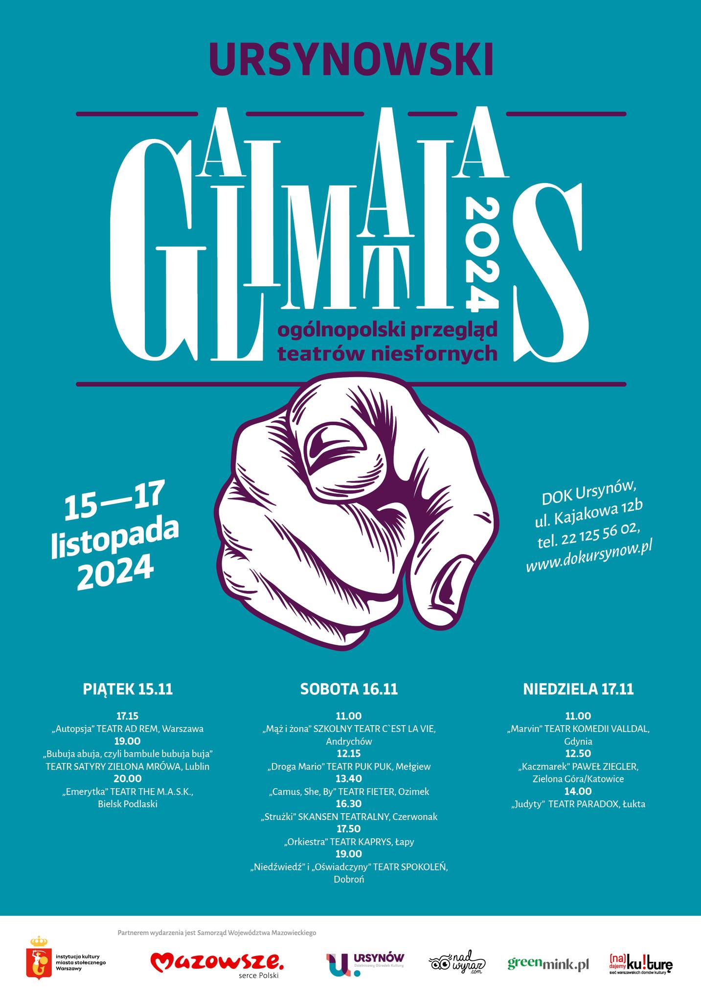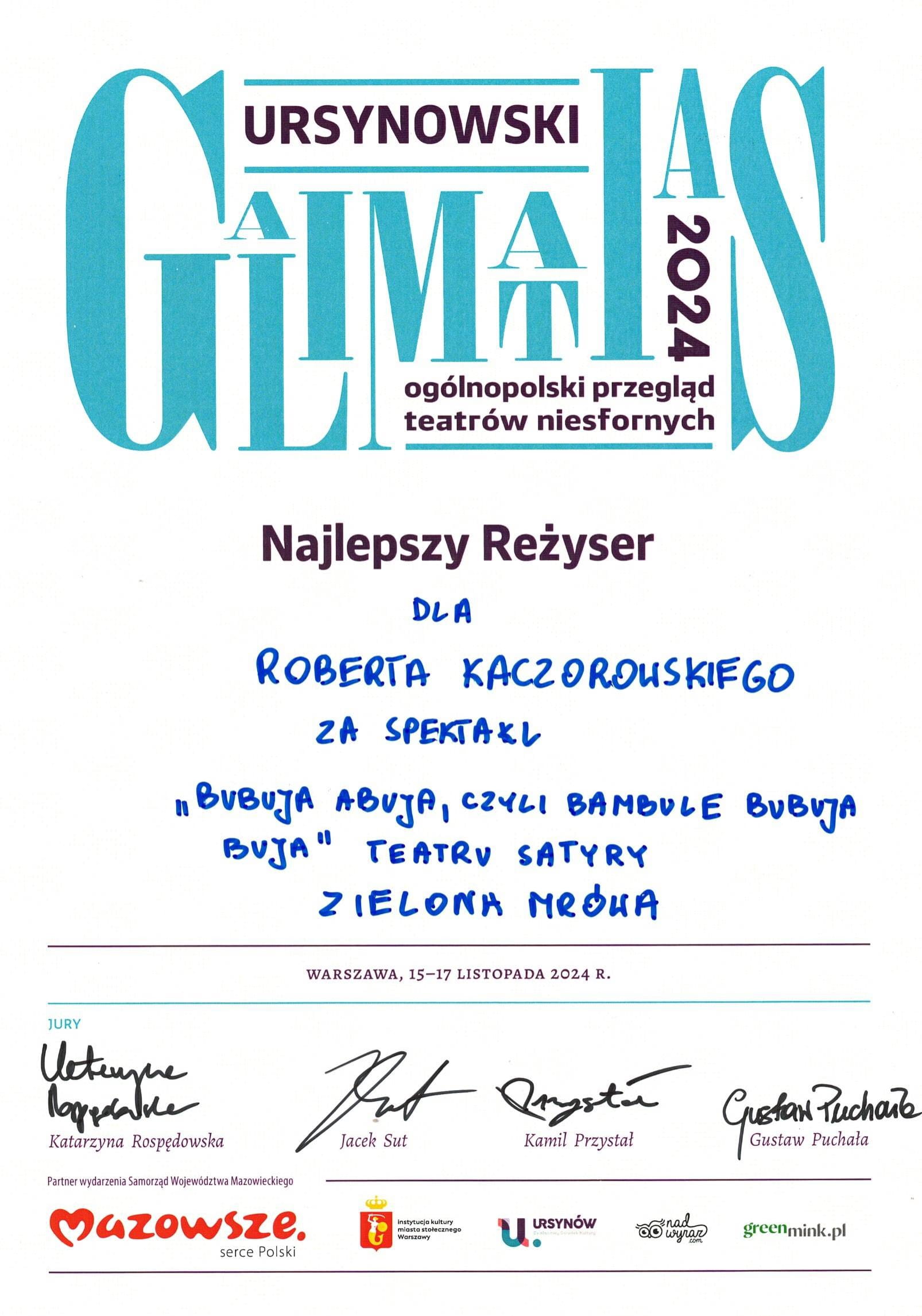 Pierwszy raz w swojej historii Teatr Satyry Zielona Mrówa brał udział w tym festiwalu, a był to już … XXII Ogólnopolski Przegląd Teatrów Niesfornych Galimatias Ursynowski! Odbywał się on w Dzielnicowym Ośrodku Kultury Ursynów w Warszawie w dniach 15 – 17 listopada br. Nasz Teatr zaprezentował tam spektakl „Bubuja Abuja czyli Bambule Bubuja Buja”.