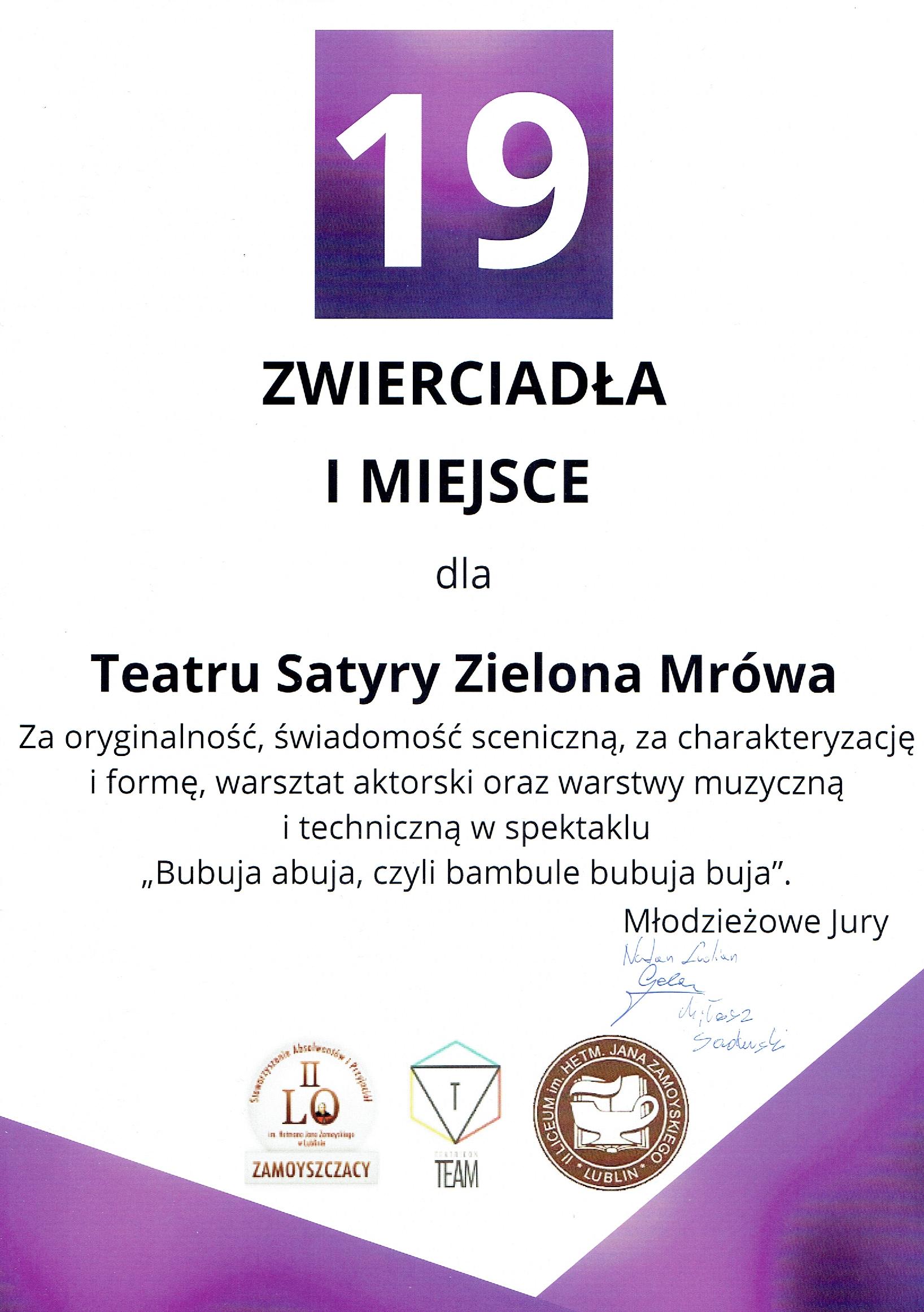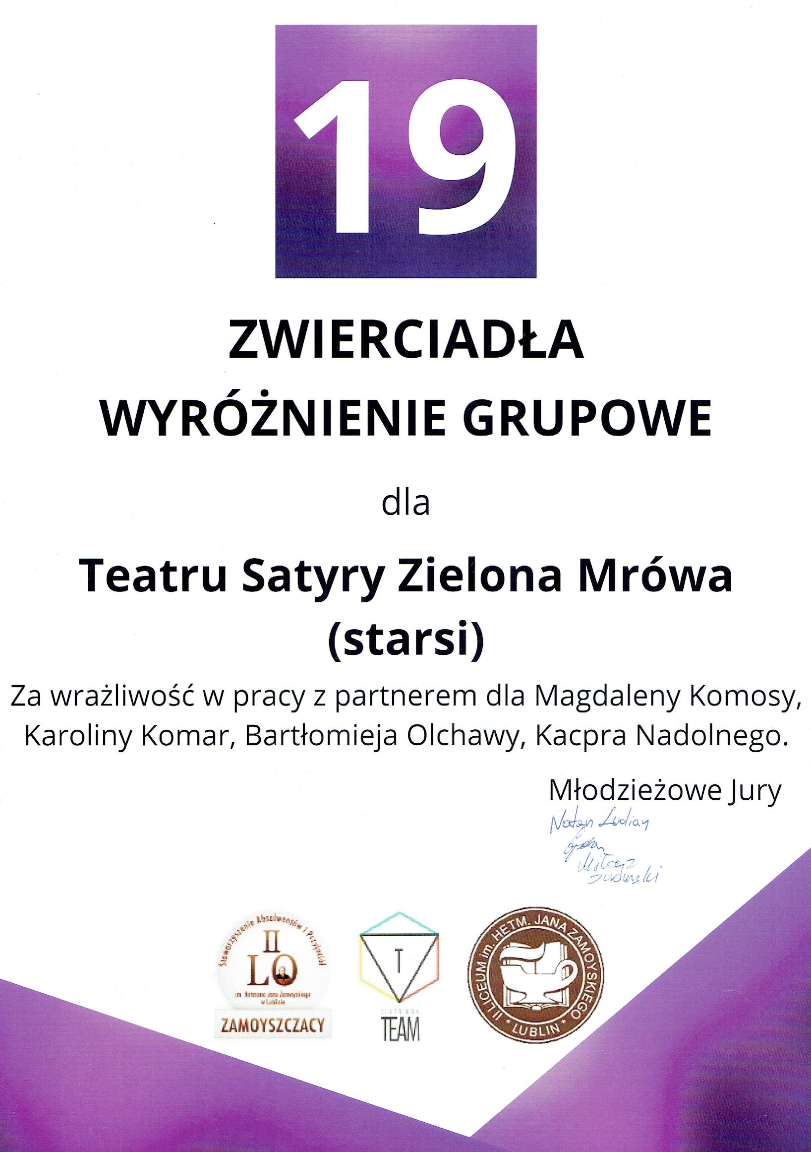 W dn. 13 – 14 marca grupa starsza i grupa młodsza Teatru Satyry Zielona Mrówa wystąpiły podczas XIX Lubelskich Spotkań Teatralnych ZWIERCIADŁA organizowanych w II LO im. J. Zamoyskiego w Lublinie i otrzymały nagrody: