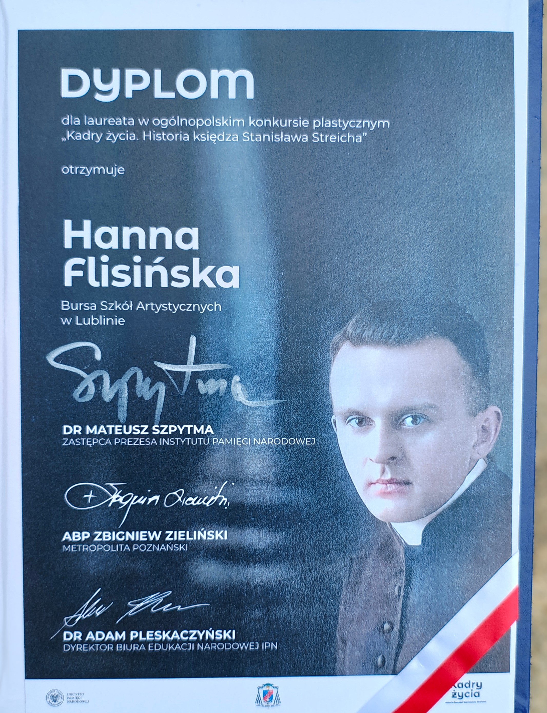 W maju 2025 r. nasza utalentowana wychowanka - Hania Flisińska - została laureatką Ogólnopolskiego Konkursu Plastycznego pt. „Kadry życia. Historia księdza Stanisława Streicha”. Organizowany przez Biuro Edukacji Narodowej IPN konkurs, miał na celu przybliżenie postaci ks. Stanisława Streicha – kapłana, społecznika i męczennika.