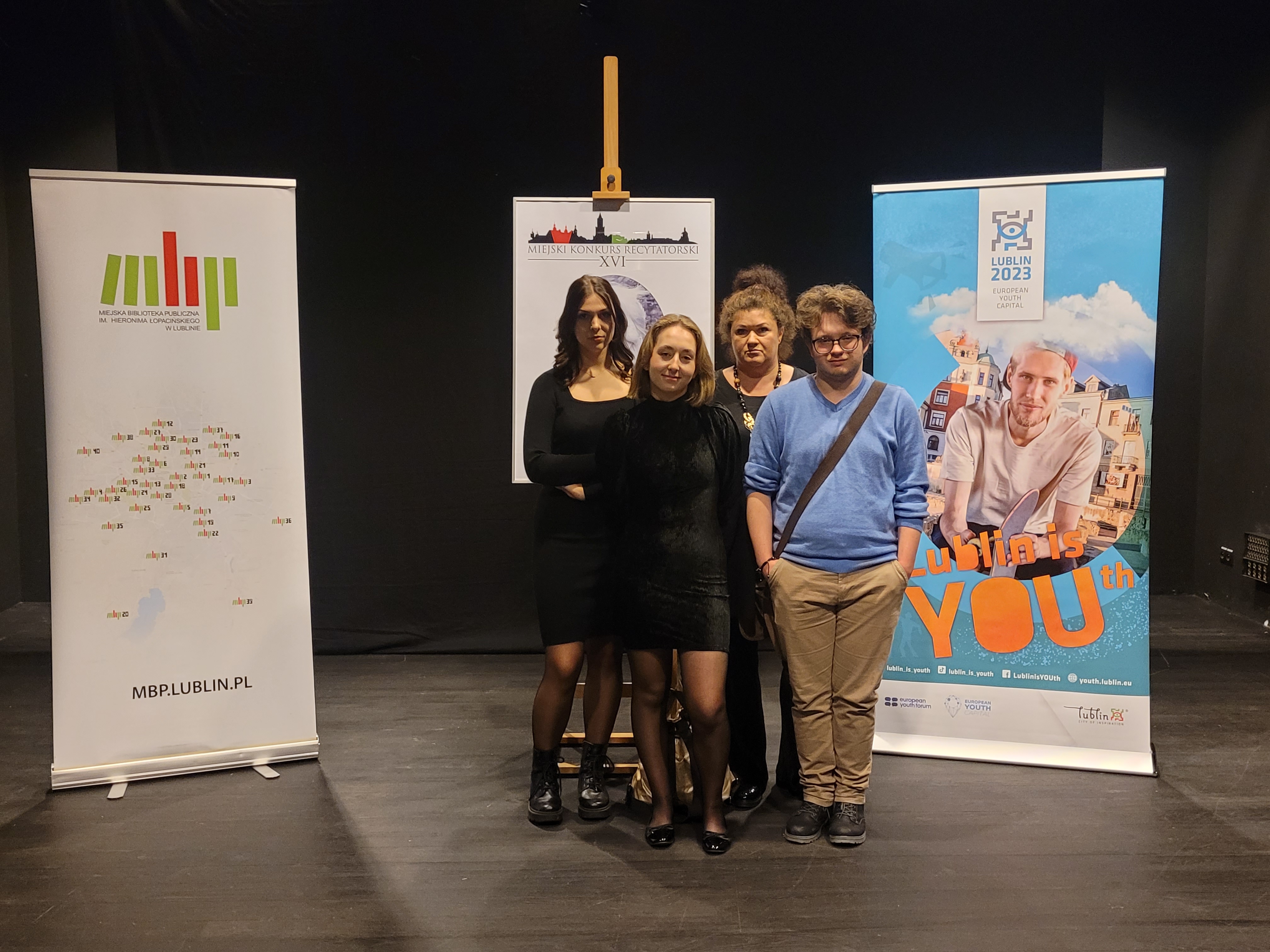 15 listopada odbył się Koncert Laureatów XVI Miejskiego Konkursu Recytatorskiego organizowanego przez Miejską Bibliotekę Publiczną im. H. Łopacińskiego w Lublinie. Troje naszych wychowanków, których po drugim etapie konkursu jury zakwalifikowało do finału, zdobyło wyróżnienia. Magdalena Komosa, Wiktoria Wieczorek i Bartłomiej Olchawa pięknie zaprezentowali słuchaczom po dwa wiersze – poezję XX i XXI wieku oraz utwory Wisławy Szymborskiej (rok 2023 został ogłoszony rokiem naszej noblistki). Nasi recytatorzy usłyszeli wiele ciepłych słów dotyczących sposobu interpretacji wierszy. Po prezentacjach laureatów, uczestnicy spotkania mieli okazję posłuchać koncertu uczniów Szkoły Muzycznej im. T. Szeligowskiego oraz obejrzeć spektakl Teatru Panopticum.