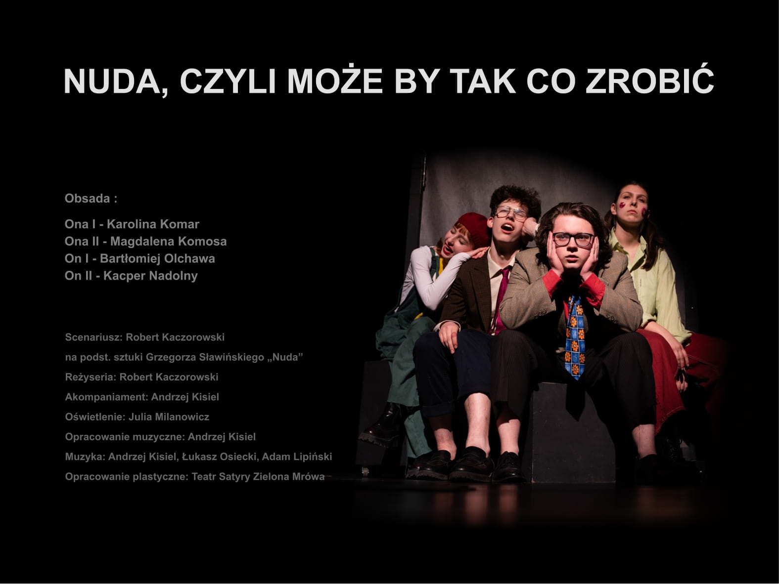 W czwartek 26.09.2024 r. miał miejsce pożegnalny spektakl „Nuda, czyli może by tak co zrobić” Teatru Satyry Zielona Mrówa, którego premiera odbyła się 30 maja 2023 r. Spektakl odniósł wielki sukces i był wielokrotnie nagradzany na ogólnopolskich przeglądach teatralnych.