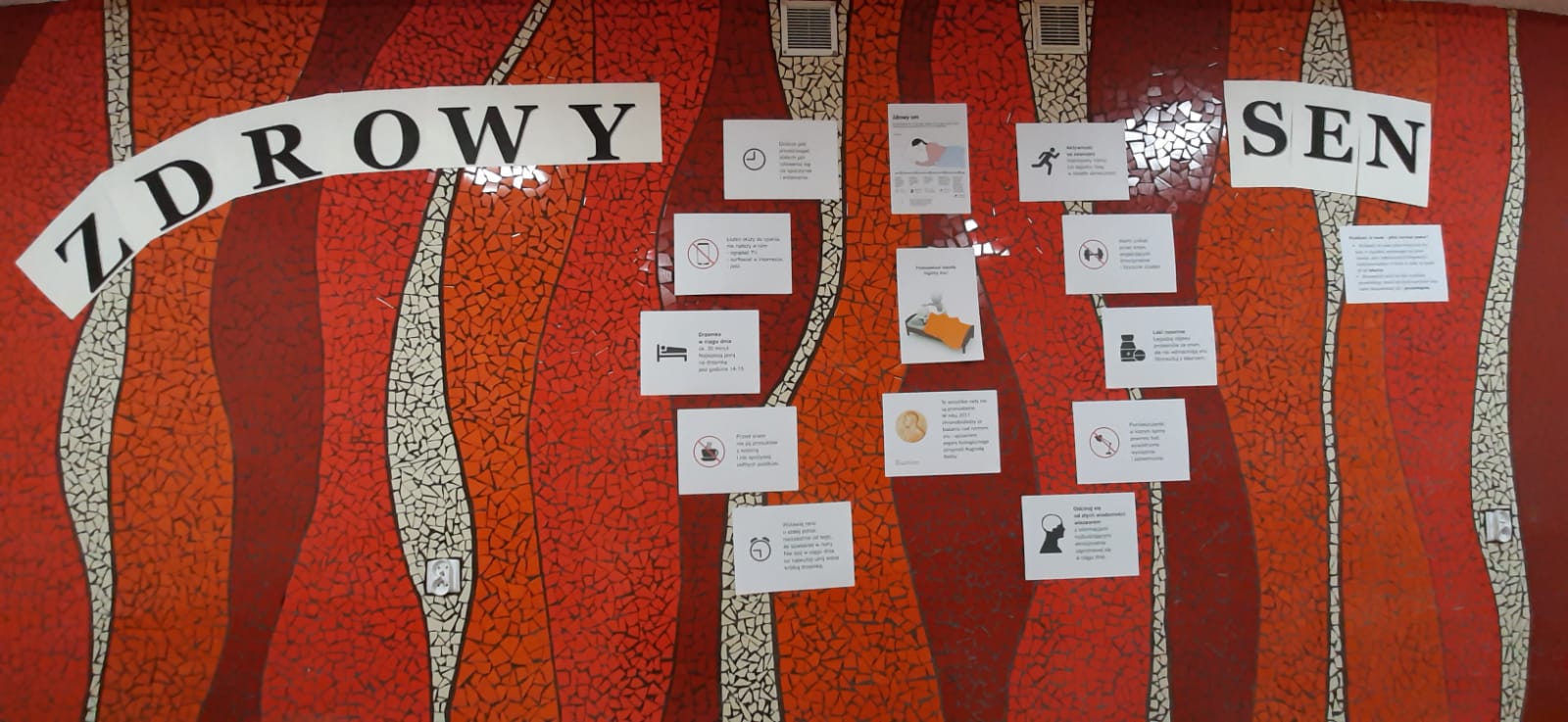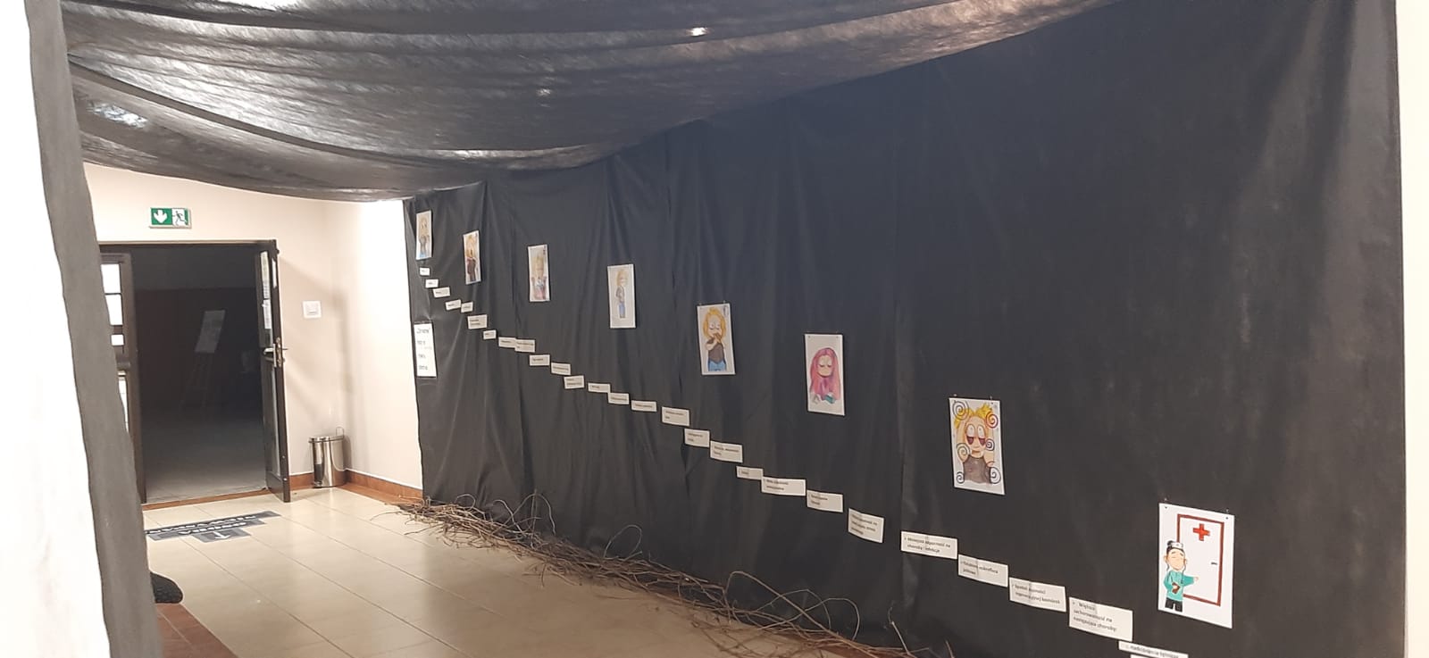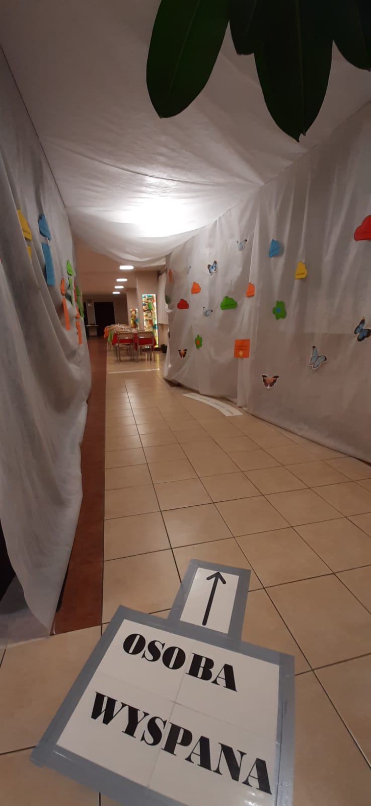 Ale niestety świat wyspanego człowieka nie był dla wszystkich. Wiele osób świadomych tego, że skróciło swój sen grubo poniżej zalecanych przez lekarzy norm, było skazanych na ciemny, mroczny korytarz. Już przy wejściu napis uświadamiał im, że „zarywanie nocy to równia pochyła” i faktycznie na ścianie od razu dała się zauważyć dziwnie ukośna linia. Tworzyły ją piękne rysunki (dzieła jednej z naszych utalentowanych wychowanek) przedstawiające człowieka systematycznie niedosypiającego. Jego image (obraz nędzy i rozpaczy!!!) już dawał wiele do myślenia. Ale jakby tego było mało na całej linii regularnie opadającej widniały medyczne argumenty bezlitośnie obnażającej prawdę o skutkach niedosypiania. Powiało grozą!!! Obraz świata niewyspanego, przemęczonego człowieka dopełniały smętnie powiewające suche trawy i rozciągające się pod ścianami bezlistne winorośla. Ot, brak życia, energii, świeżości… Ten tunel chciało szybko opuścić, ale jak się okazało i dalej nie było dużo lepiej. Stoły bez obrusów, na niech suche bukiety w ciemnych barwach, a z plakatów przemawiały aż nadto wyraźnie wyniki badań naukowych uświadamiające najbardziej opornym, jakie są skutki niedoboru snu. Świat człowieka niewyspanego nie jest atrakcyjny.
