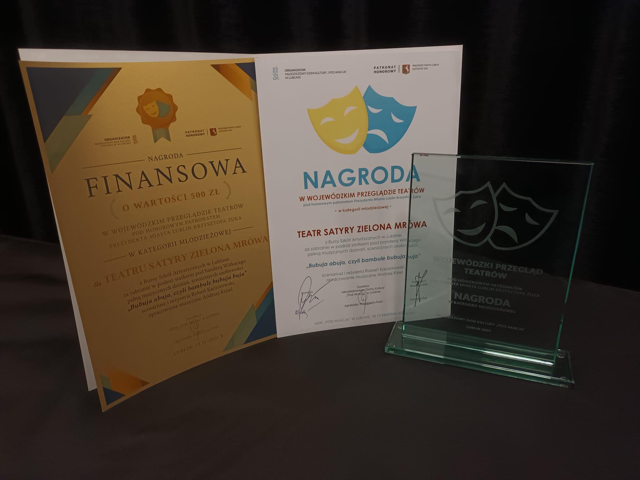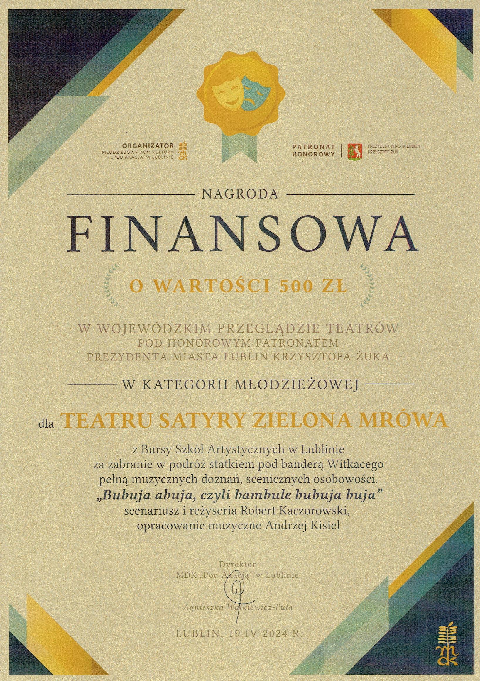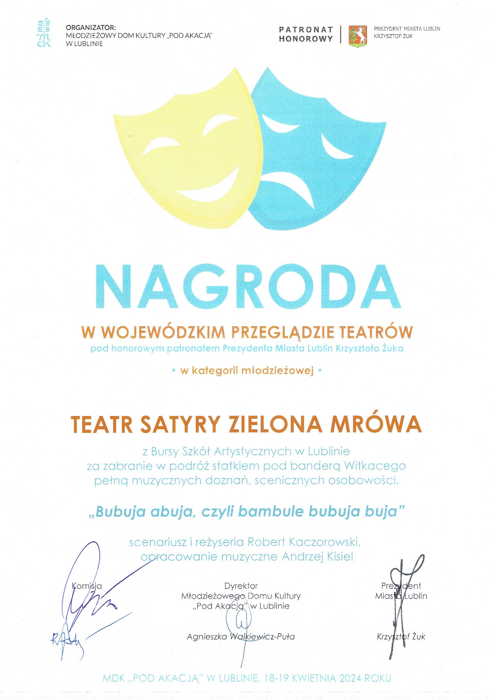 Teatr Satyry Zielona Mrówa wziął udział w Wojewódzkim Przeglądzie Teatrów – 46. Wojewódzkie Prezentacje Teatrów Młodzieżowych, „Inscenizacje 2024” pod honorowym patronatem Prezydenta Miasta Lublin Krzysztofa Żuka zorganizowanym przez MDK "Pod Akacją" w dniach 18 i 19 kwietnia 2024 r.