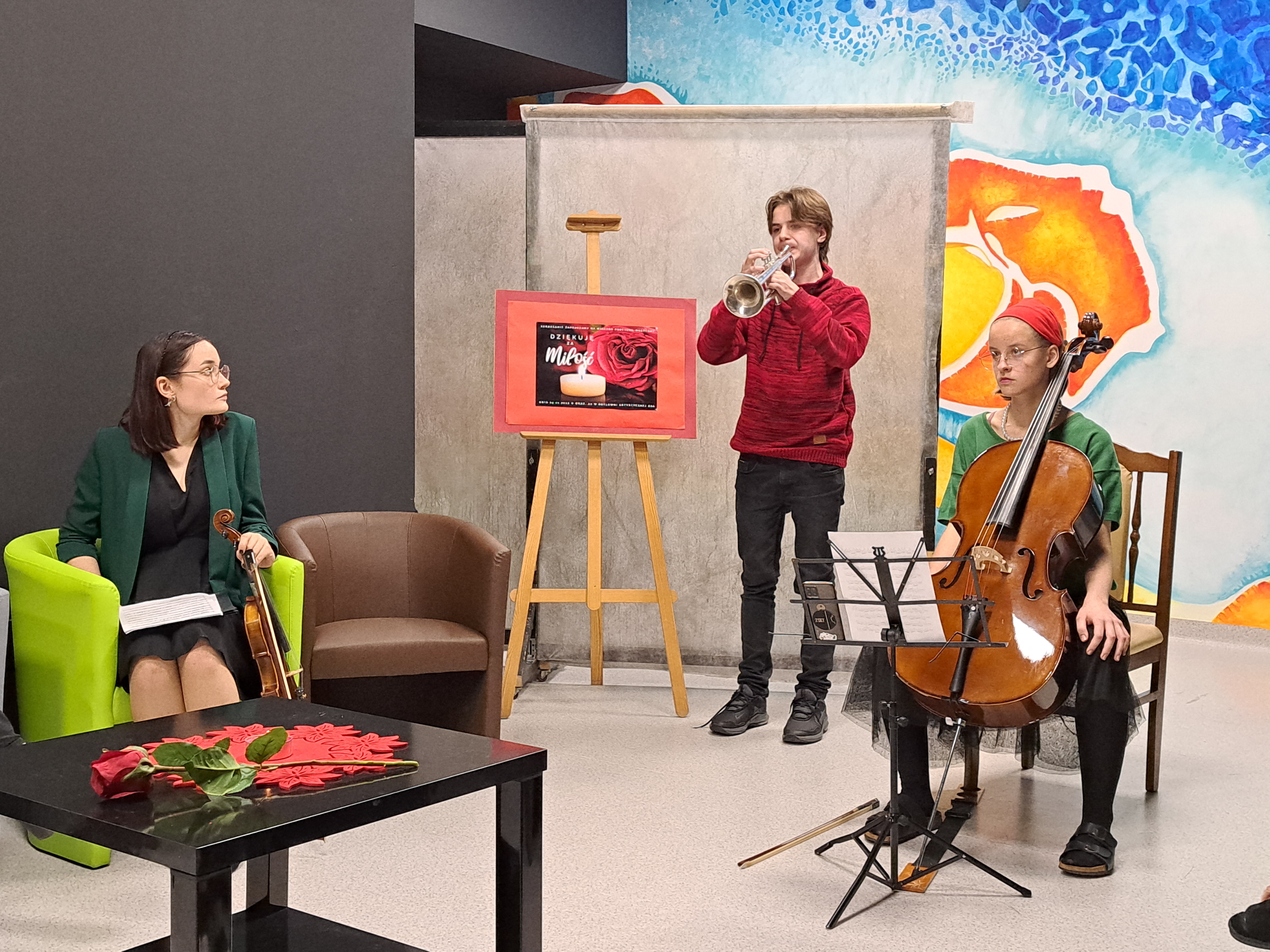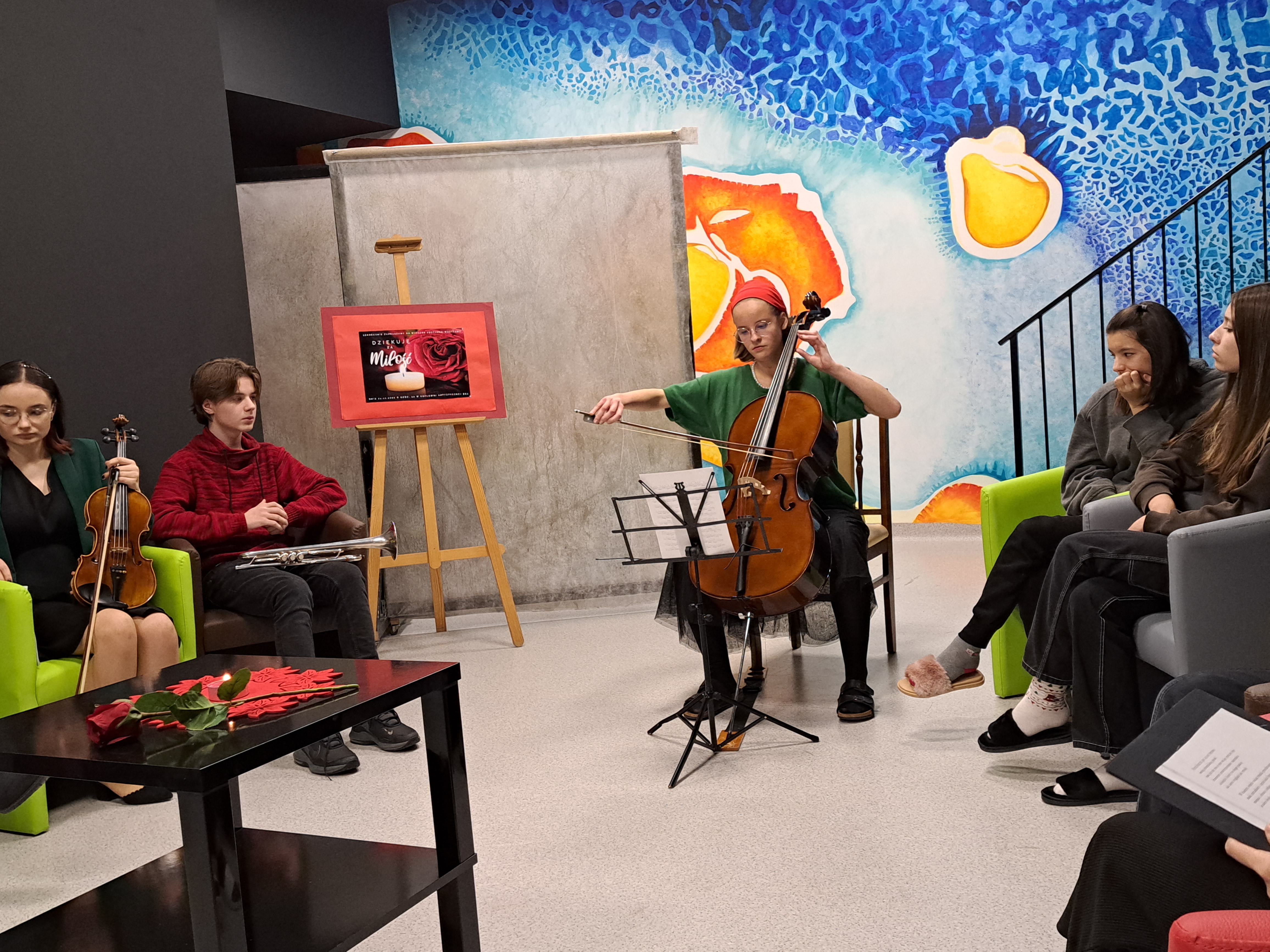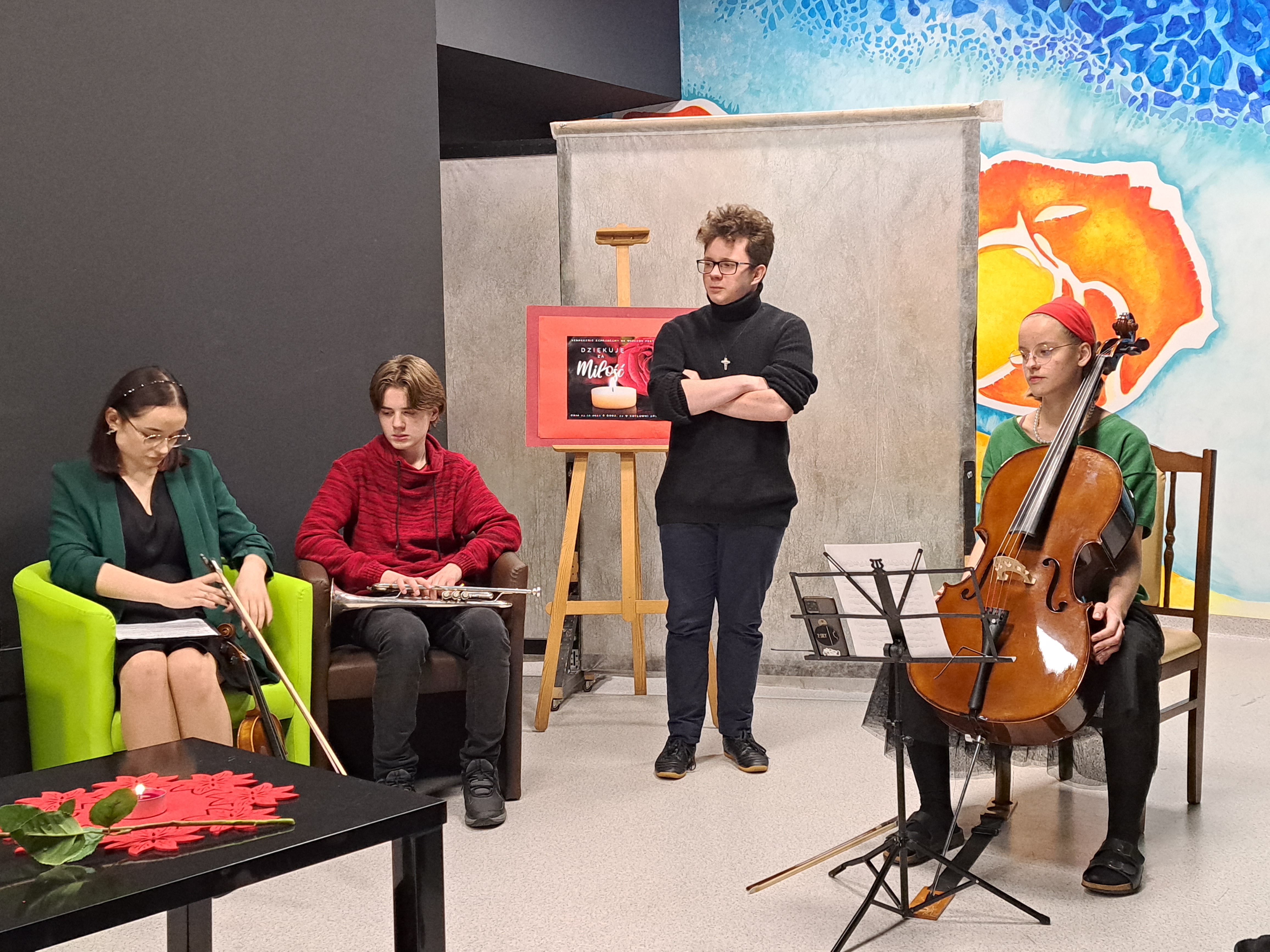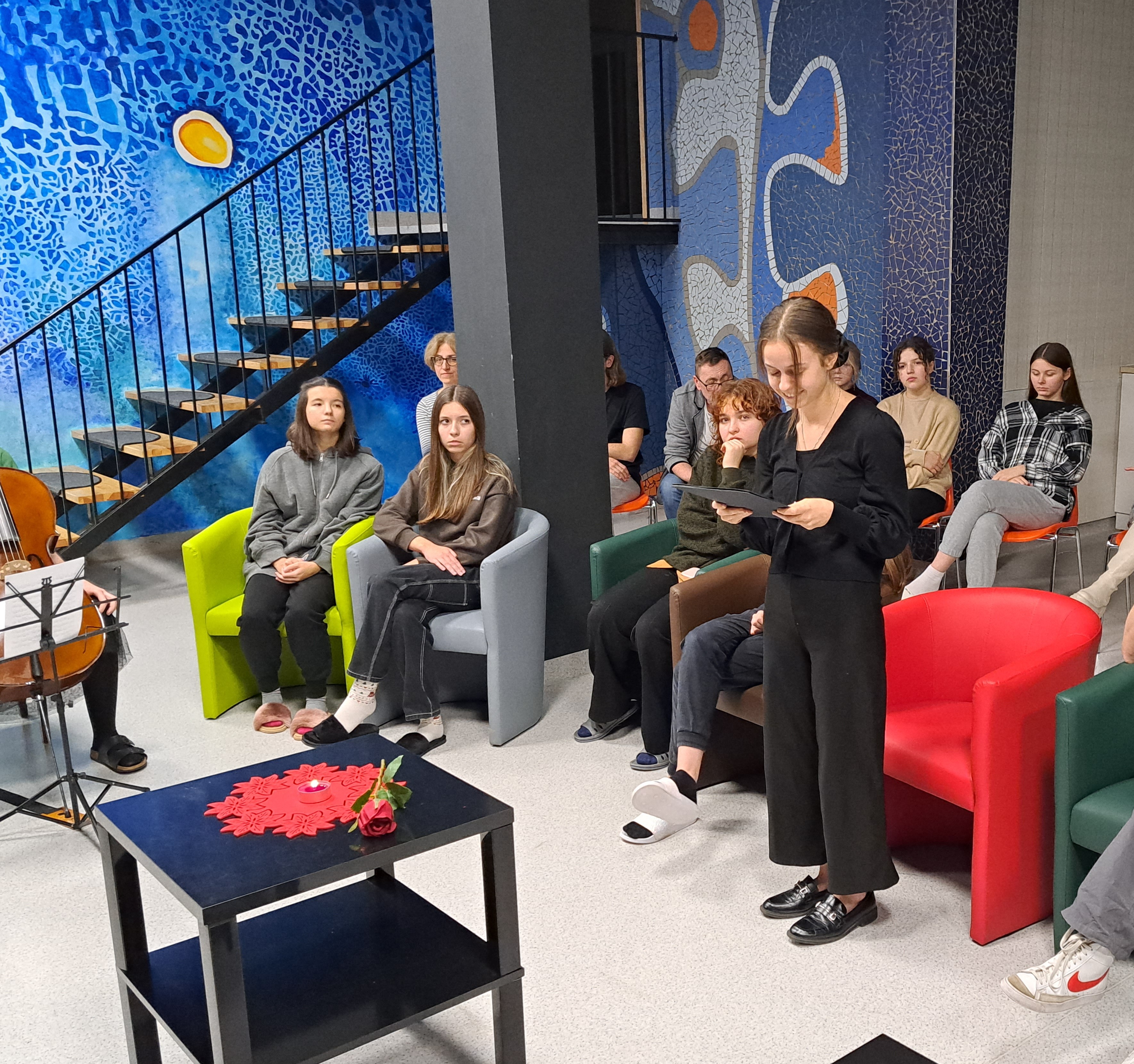 24 XI 2022 odbył się wieczorek poetycko - muzyczny „ Dziękuję za miłość”, będący kontynuacją Zaduszek Poetyckich, organizowanych przez Bibliotekę BSA. Tym razem spotkaliśmy się w innej scenerii, mianowicie w oddanej do użytku Kotłowni Artystycznej Bursy. Listopad, w którym krzyżują się czasy przeszłe, teraźniejsze i przyszłe ponownie obudził nasze refleksje i skłonił do podziękowań za każdy okruch dobra, piękna i miłości, jaki było dane nam otrzymać. Wspominaliśmy pracowników BSA, których osiągnięcia są dziś naszym udziałem. Najcieplejsze uczucia skierowaliśmy w stronę domu rodzinnego, ku bliskim, otulając ich naszą pamięcią i miłością. Nie zapomnieliśmy o bohaterach, którzy zbudowali fundament naszej tożsamości narodowej. Wybrzmiały również słowa o ludzkich uczuciach, wykraczających poza czasu kres i trwających w szeleście liści, błękicie nieba, poruszeniach serca. Na koniec przypomnieliśmy sobie wiersze niosące przesłania. Może to był żal, że się za mało kochało, może potrzeba przebaczenia i ocalenia „ światła świec ”?