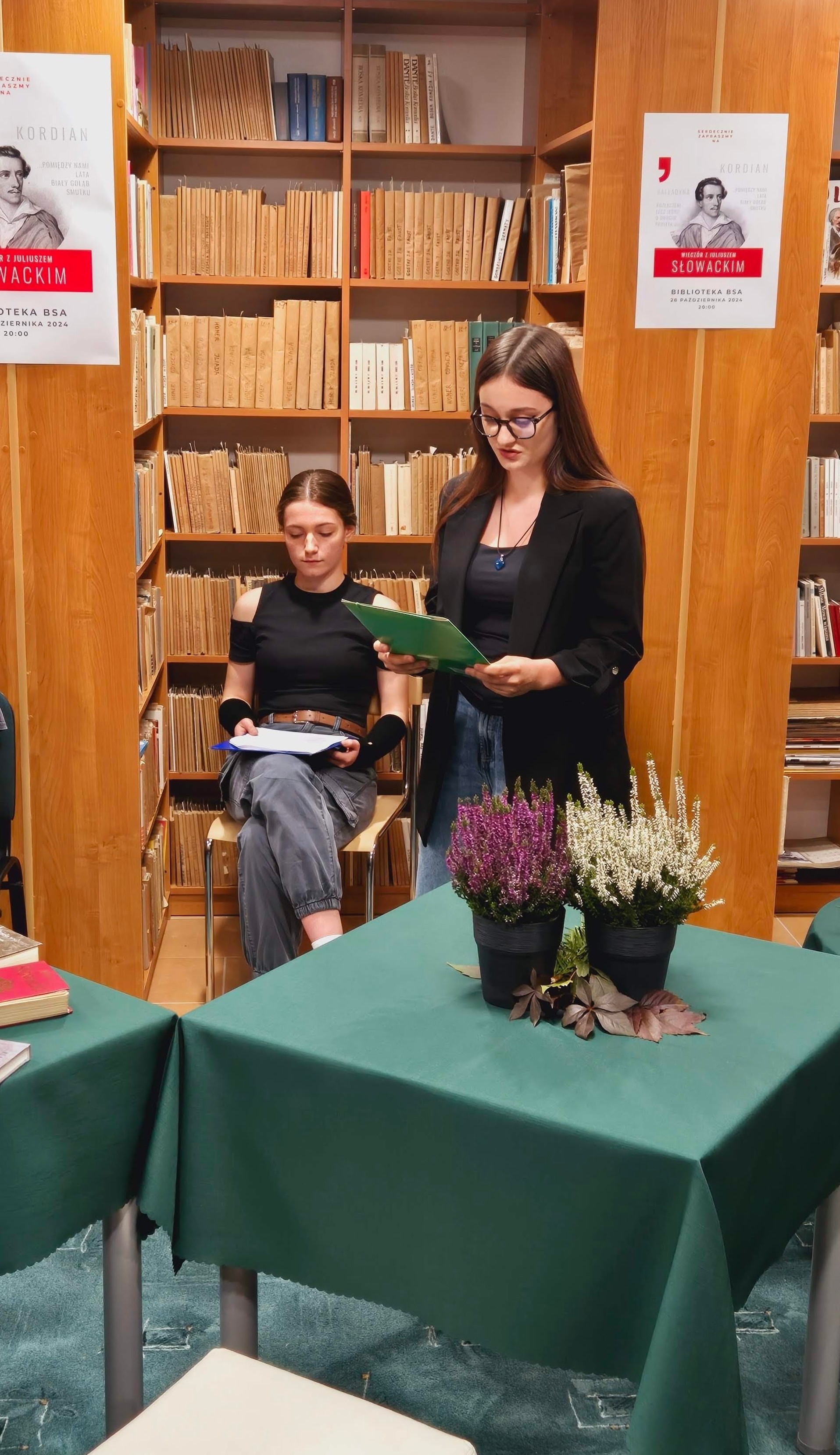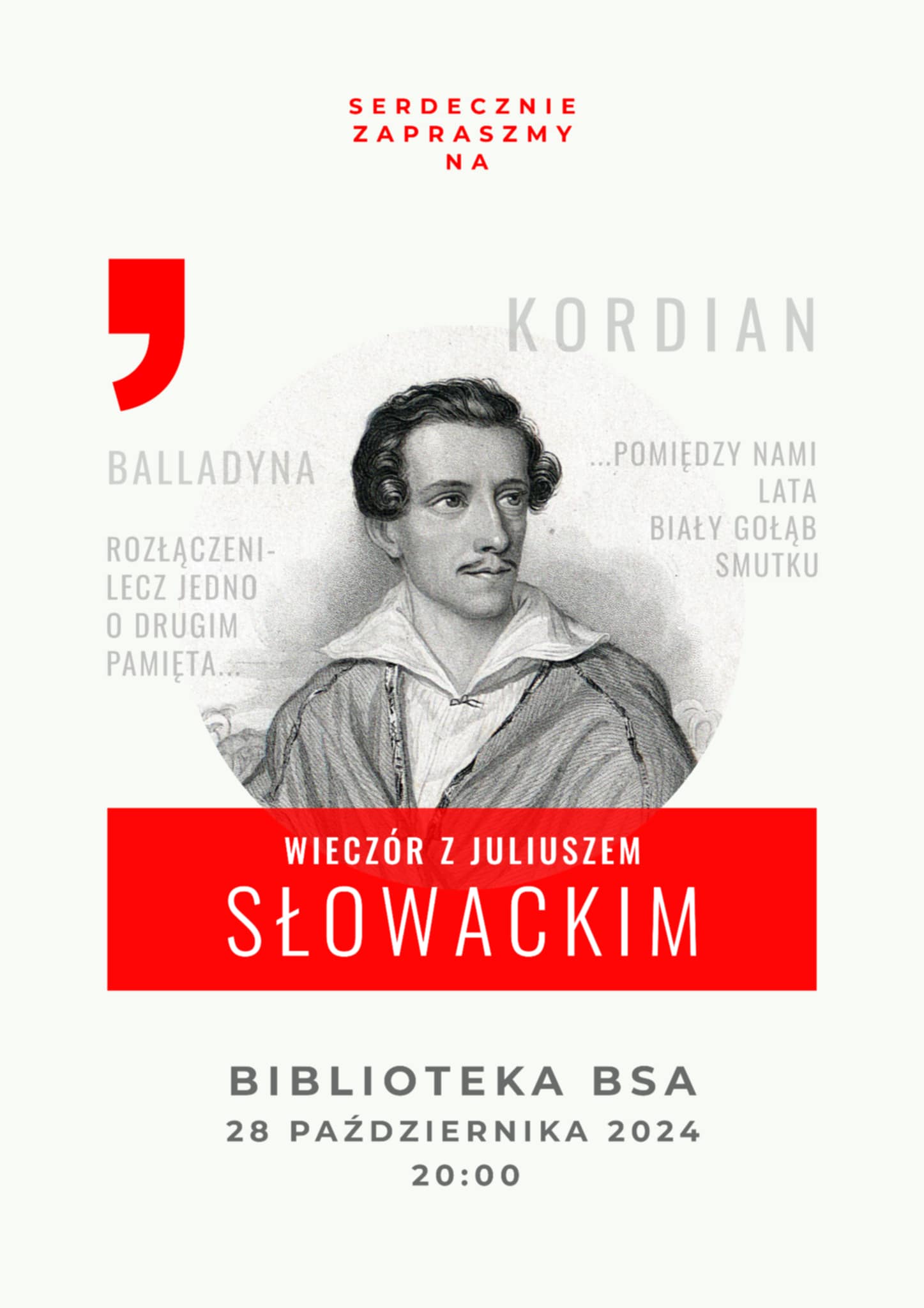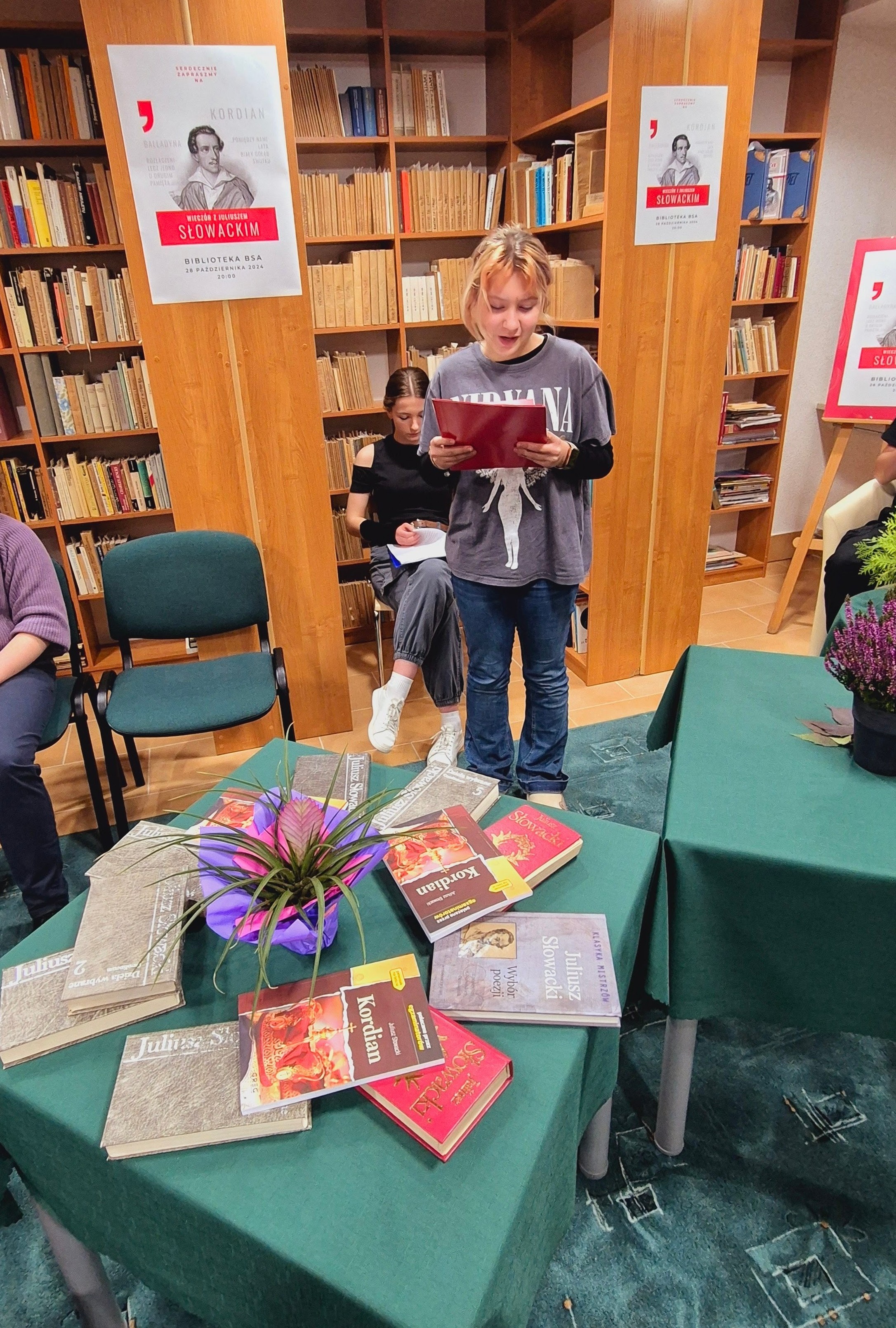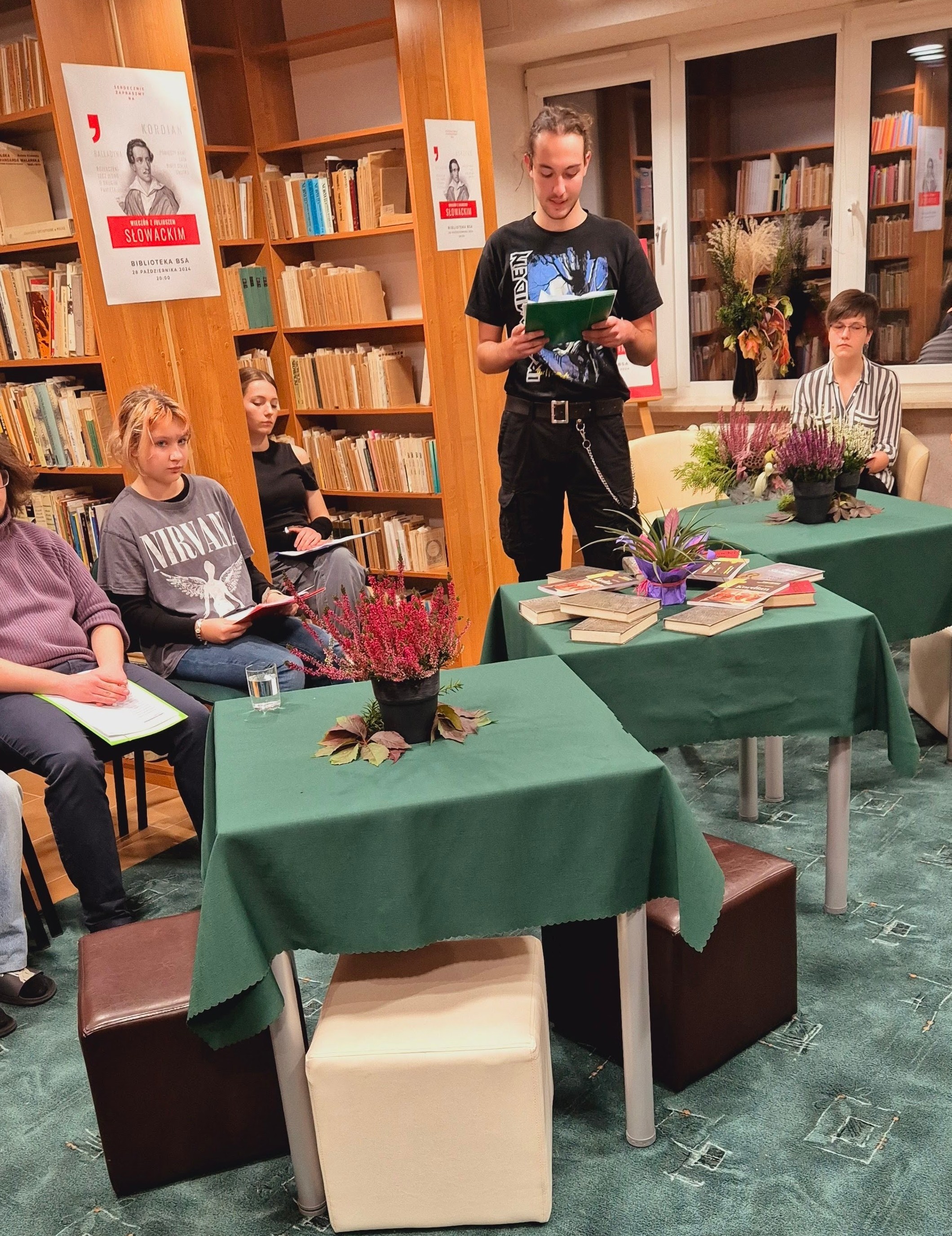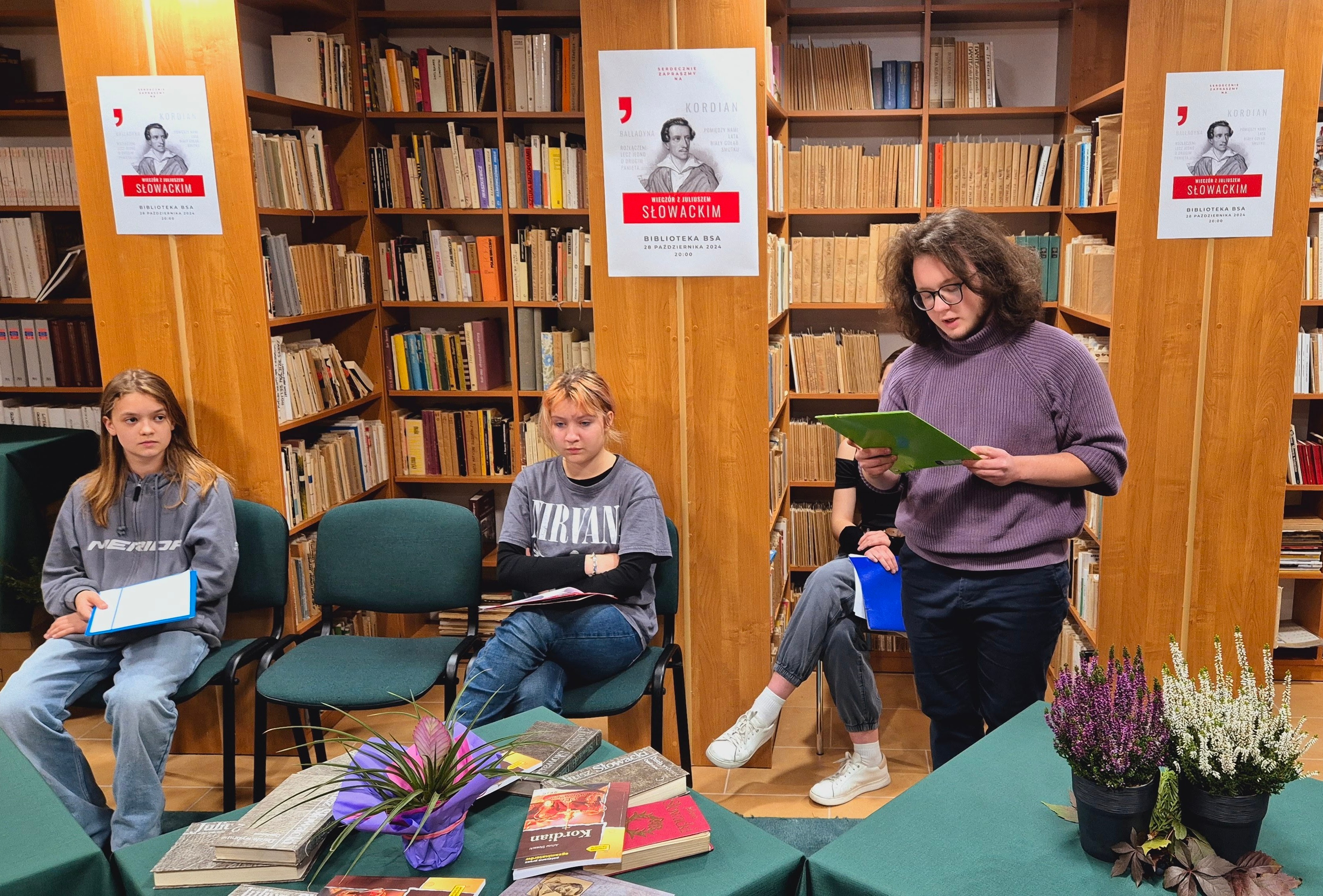 28 października 2024 roku w Bibliotece BSA odbyło się spotkanie poświęcone życiu i twórczości Juliusza Słowackiego. W tym roku obchodzimy 215 rocznicę Jego urodzin, a wrześniowa edycja Narodowego Czytania poświęcona była Kordianowi Jego autorstwa. Jest też pewną tradycją, iż w czas jesiennych wieczorów, pełnych zadumy i refleksji, Biblioteka BSA wypełnia się melodią poetyckich strof i barwami nostalgicznych żółcieni i fioletów.
