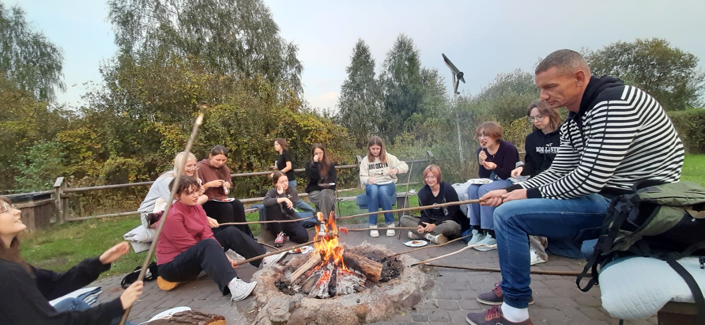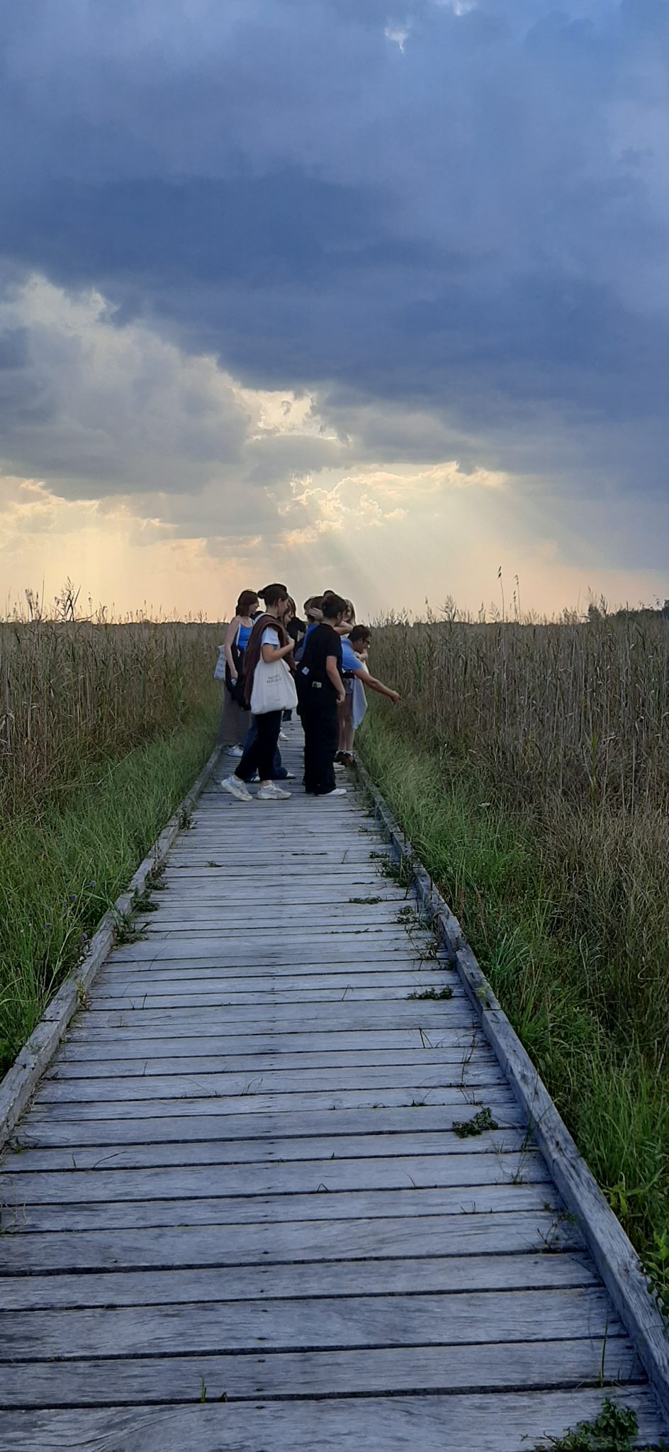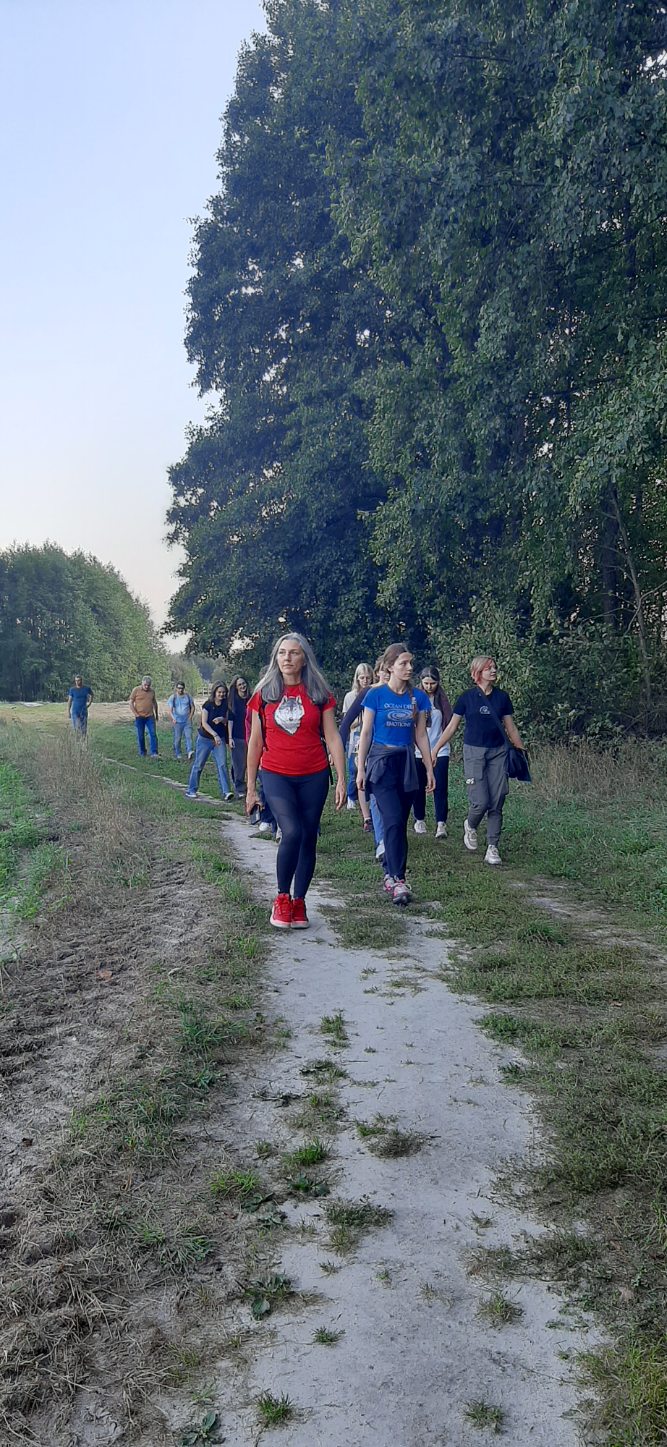 Następnie ścieżka „Czahary” i tutaj zupełnie odmiennie, duża przestrzeń bagna Bubnów, teren podmokły porośnięty trawą trzęślicową, na drewnianej kładce intrygujące modliszki, obserwacje z wież widokowych, światło słoneczne tworzące popołudniowy nastój. A potem ognisko, smaczne kiełbaski, rozmowy i relaksacja poprowadzona przez sorkę Anię. Po niebie leciały klucze żurawi i powoli zanosiło się na burzę, nad bagnem w oddali widzieliśmy błyskawice. Pełni wrażeń zbieraliśmy się do odjazdu i do Lublina jechaliśmy już w strugach deszczu.
