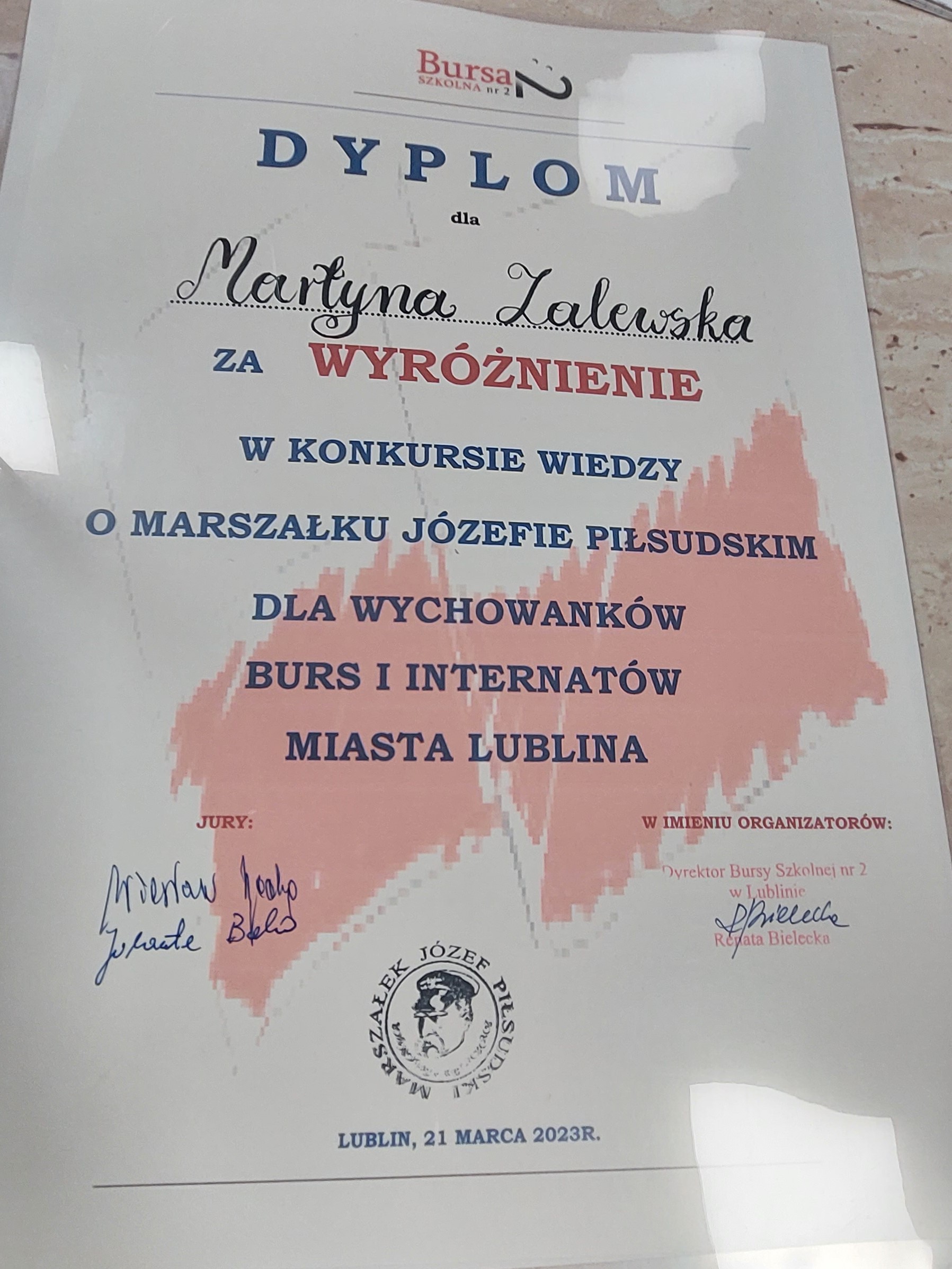 Naszą Bursę reprezentowała Martyna Zalewska, która zdobyła wyróżnienie i otrzymała nagrodę książkową. Uczestnicy konkursu wykazali się dużą wiedzą nt. tak ważnej dla Polski postaci, jaką był Marszałek Józef Piłsudski. Konkursowe zmagania uświetnił swoją obecnością Stanisław Olszewski - generał Związku Piłsudczyków Okręgu Ziemi Lubelskiej, który opowiedział się kilka ciekawostek z życia Marszałka.